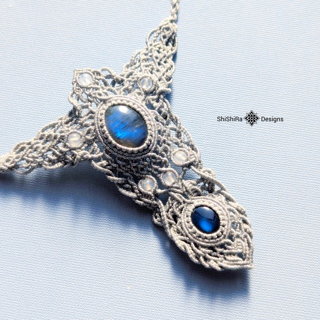 ご覧頂きありがとうございます。 ◈◈◈◈◈◈◈◈◈◈◈◈◈◈◈◈◈◈◈◈◈◈◈◈◈◈◈◈◈◈ 【ShiShiRa’s Premium Collection】 繊細かつ、大胆に。 アートとしてもお楽しみいただける、 Premiumなコレクションです。 ◈◈◈◈◈◈◈◈◈◈◈◈◈◈◈◈◈◈◈◈◈◈◈◈◈◈◈◈◈◈ ブルーシラーが輝くラブラドライトをメインに使用したネックレスです。 重ねたのは、ブラックラブラドライト。 ラブラドライトの内から出る知性や美しさ。 人々を深く魅了するのも頷けます。 今回使用したのは、光沢のあるシルバーのワックスコード。 もし本当のシルバーでこのペンダントを作ったとしたら、重くて着けるのはなかなか大変かと思いますが、 ワックスコードならではの軽い仕上がりで長時間着けていても疲れません。 シルバーのコードと、ラブラドライトの持つ温度感がマッチします。 なんだか、すっと気持ちを鎮めることができそうなネックレスです。 ラブラドライトを囲むように、ムーンストーンを入れ込みました。 こちらもシラーが輝き、その美しさにもう言葉は不要。 細部までこだわった、特別なジュエリー。 何十時間もかけて、このネックレスが仕上がります。 ぜひ、大切に使ってあげてください。 ジュエリーボックスにお入れしてお届けします。 【商品詳細】 ・トップ部分のサイズ 縦:最長約8.5cm 横:約最長8cm ・首紐は最長約80cm。 アジャスターを軽く押さえてひっぱることでサイズ調整が可能です。 ・石を強い力で引っ張ったりすると破損の恐れがございます。 ラブラドライト···約2cm ブラックラブラドライト···約1.2cm ムーンストーン···約4mm 完全なる一点もののペンダントです。 同じものは世界に一つとしてございません。 どうぞ、この機会にShiShiRa Designsのマクラメアクセサリーをご検討くださいませ。 【ご一読ください。】 ・返金、返品はお受けできませんのでご理解の上のご購入をお願い致します。 ・天然石を使用しております。 天然のものゆえ、自然にできた傷やクラックが入っている場合がございます。 一つとして同じものがない天然石。 そちらもぜひお楽しみくださいませ。 ・石によるヒーリング効果は保証いたしかねます。 ・ロウでコーティングされたワックスコードを使用しております。 使い始めはベタつきを感じることもございますが、使用しているうちに馴染んでいきます。 また、耐水性はございませんので水には濡れないようご注意くださいませ。 ・ワックスコードは焼き留め処理をしておりますので、裏面などに一部、色が変わっている箇所がございます。 世界で一つだけのマクラメアクセサリーをどうぞお楽しみください。