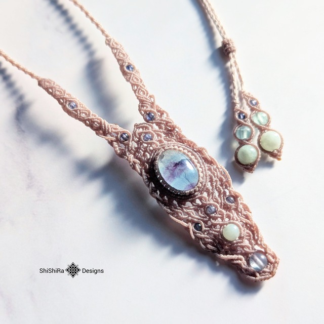 【ShiShiRa’s Premium Collection】セラフィナイトとエンジェルフェザーフローライトのジュエリーマクラメネックレス [金属アレルギー対応]