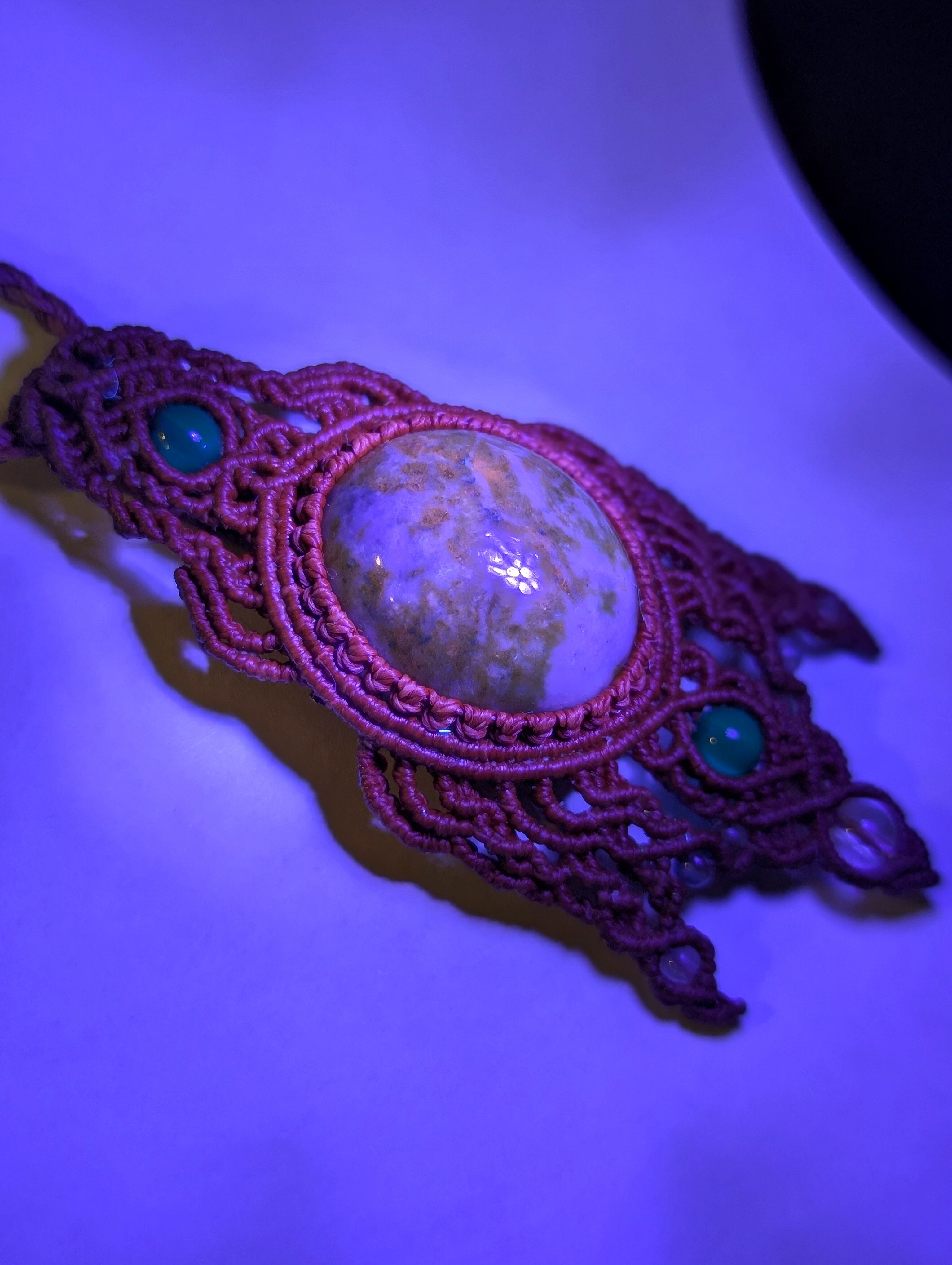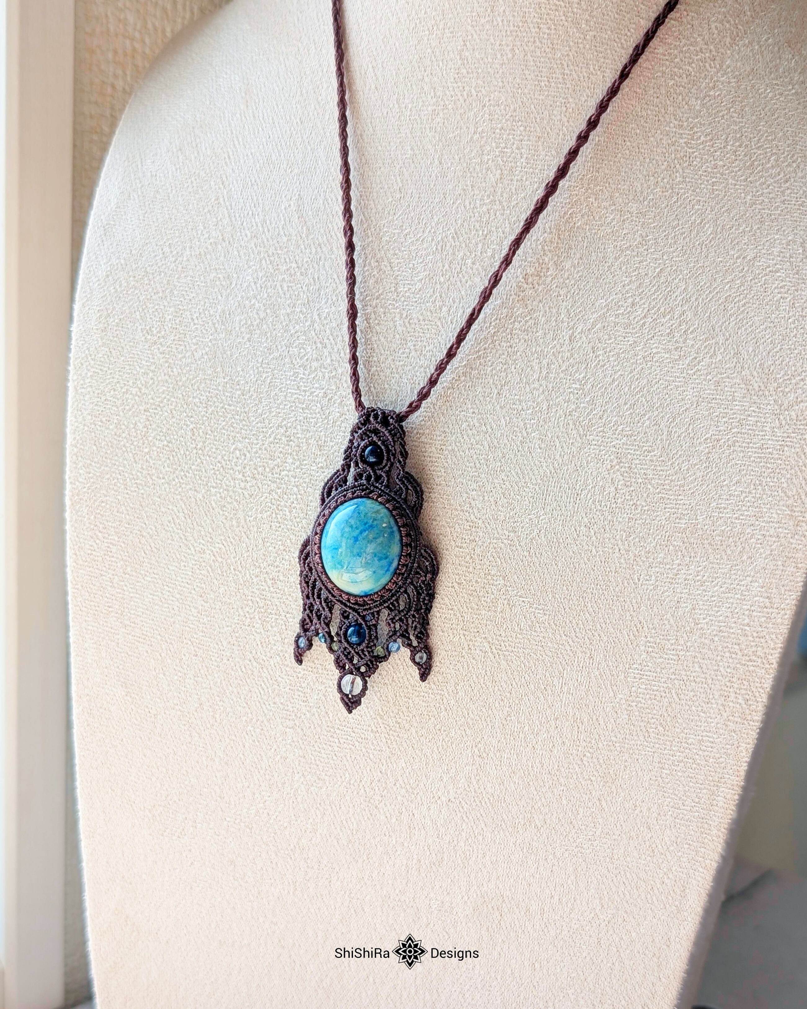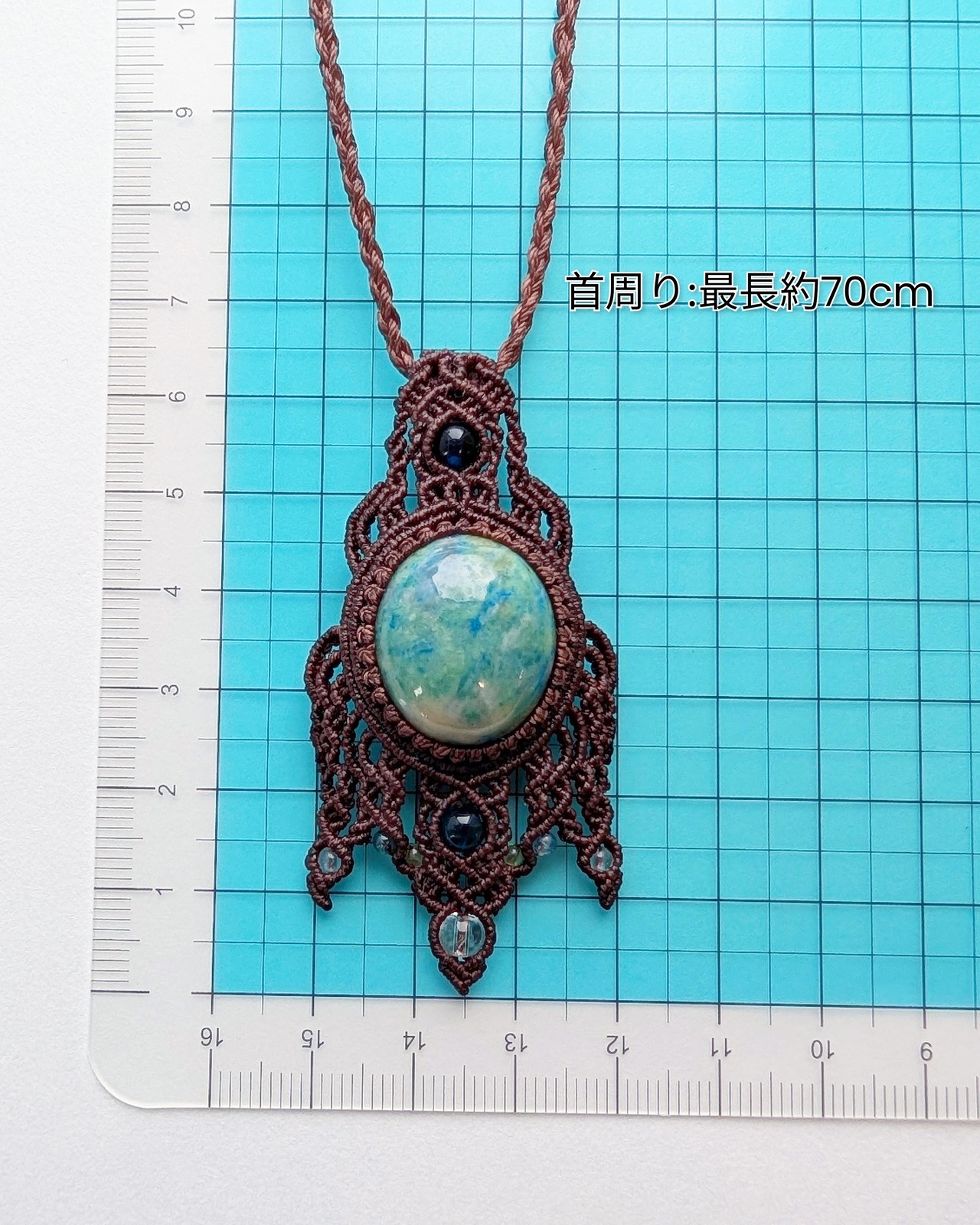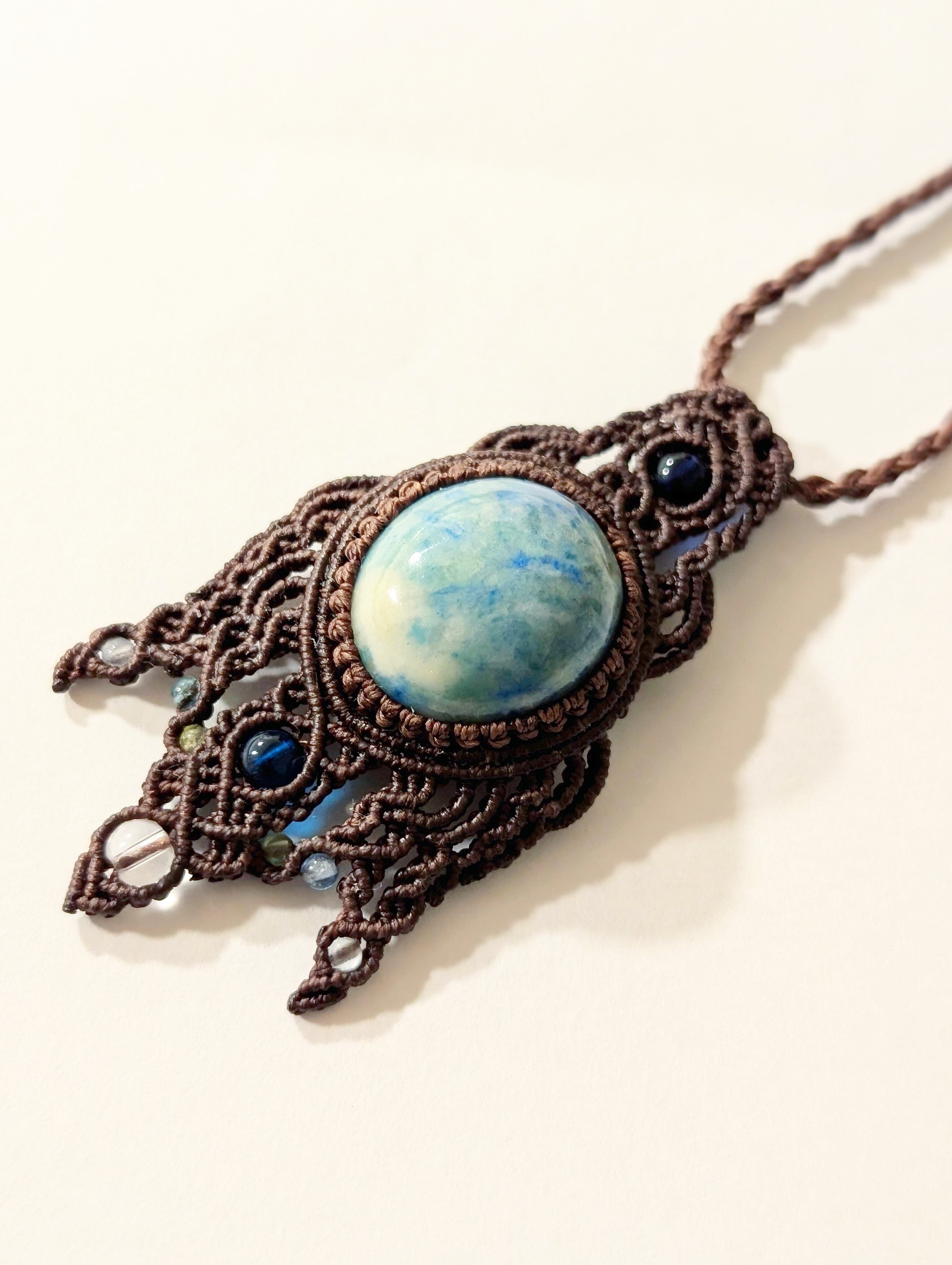 ワックスコードで天然石を編み込んだ一点物のマクラメペンダントです。