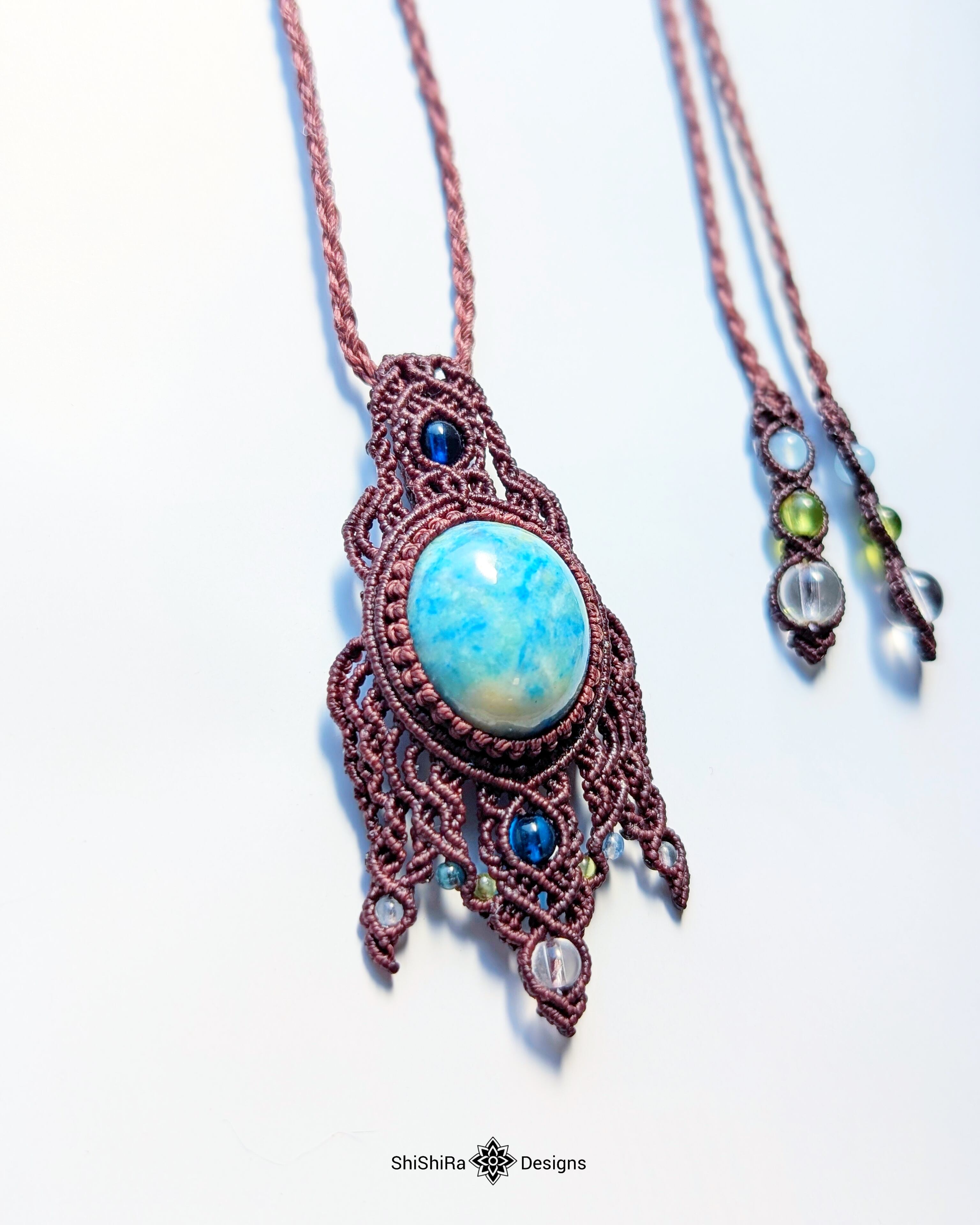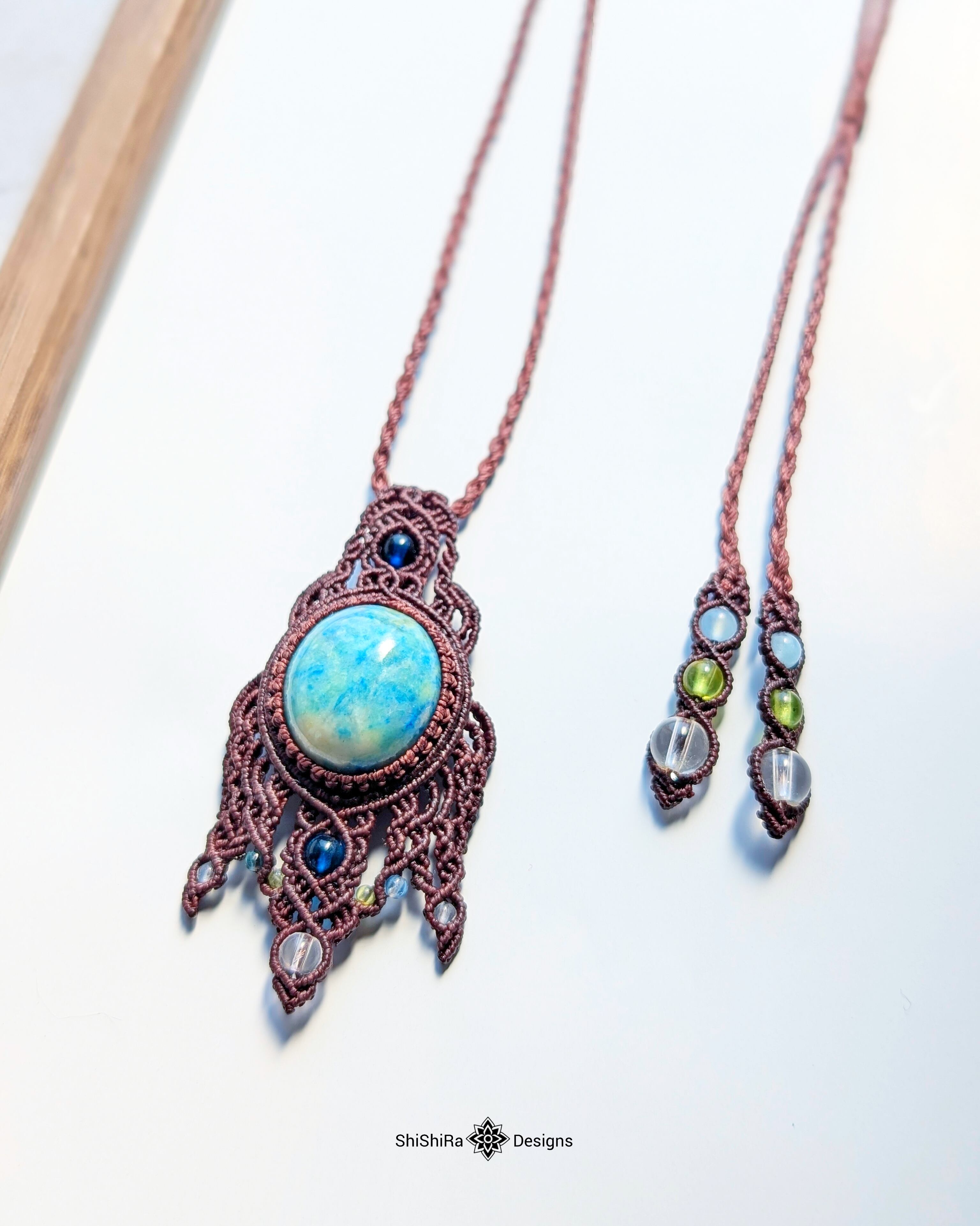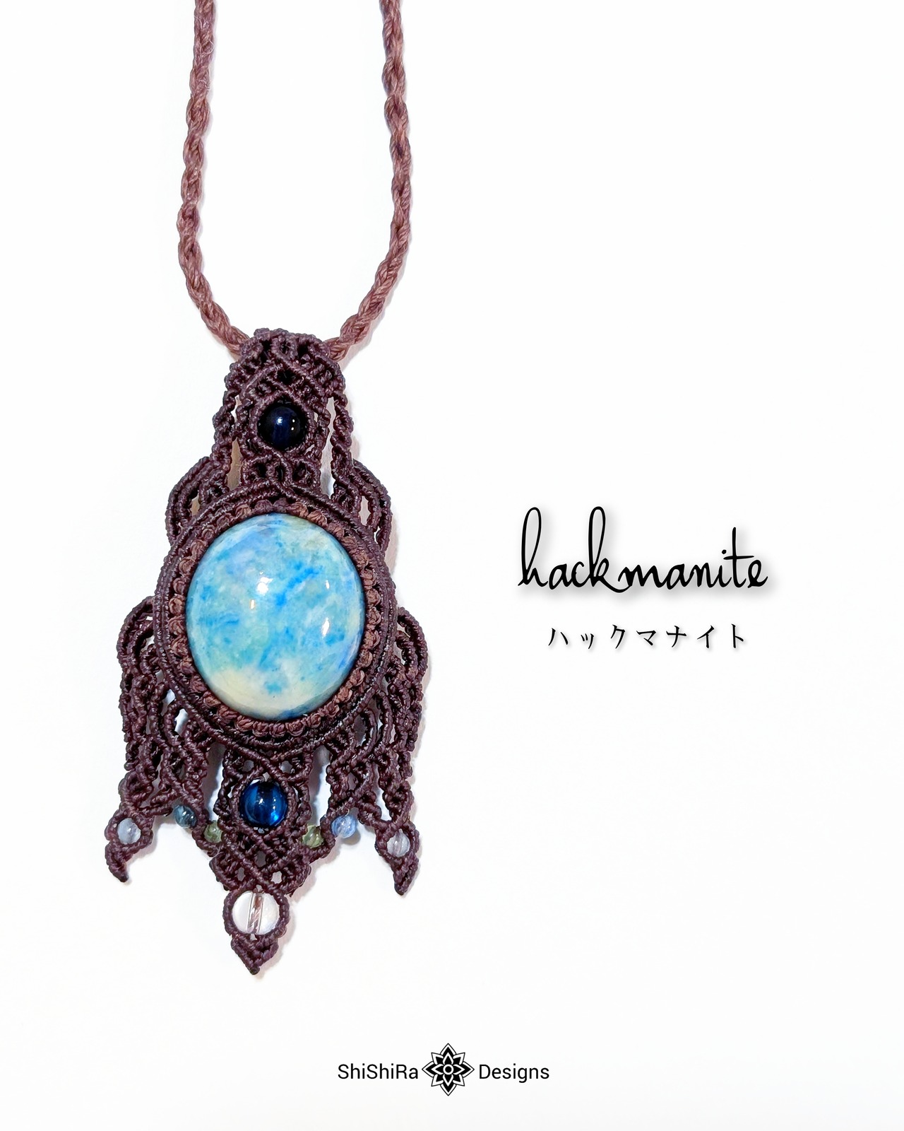 〘レア天然石〙希少石ハックマナイトとブルーアンバーのマクラメペンダント [金属アレルギー対応]