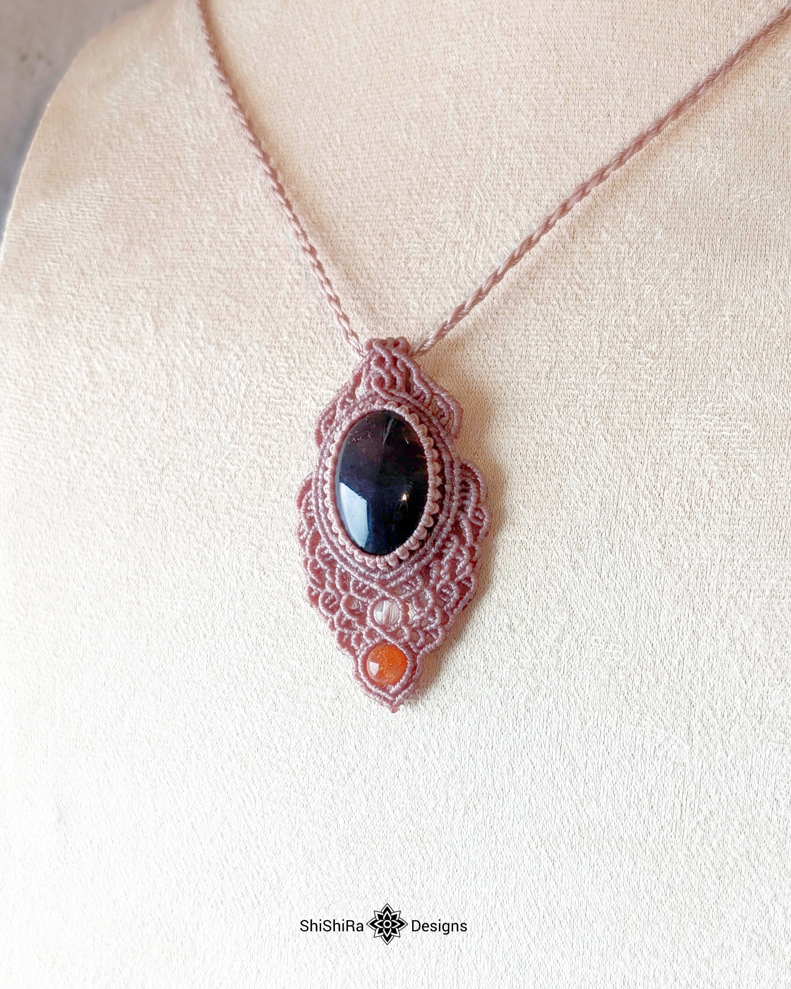 ワックスコードで天然石を編み込んだ一点物のマクラメペンダントです。