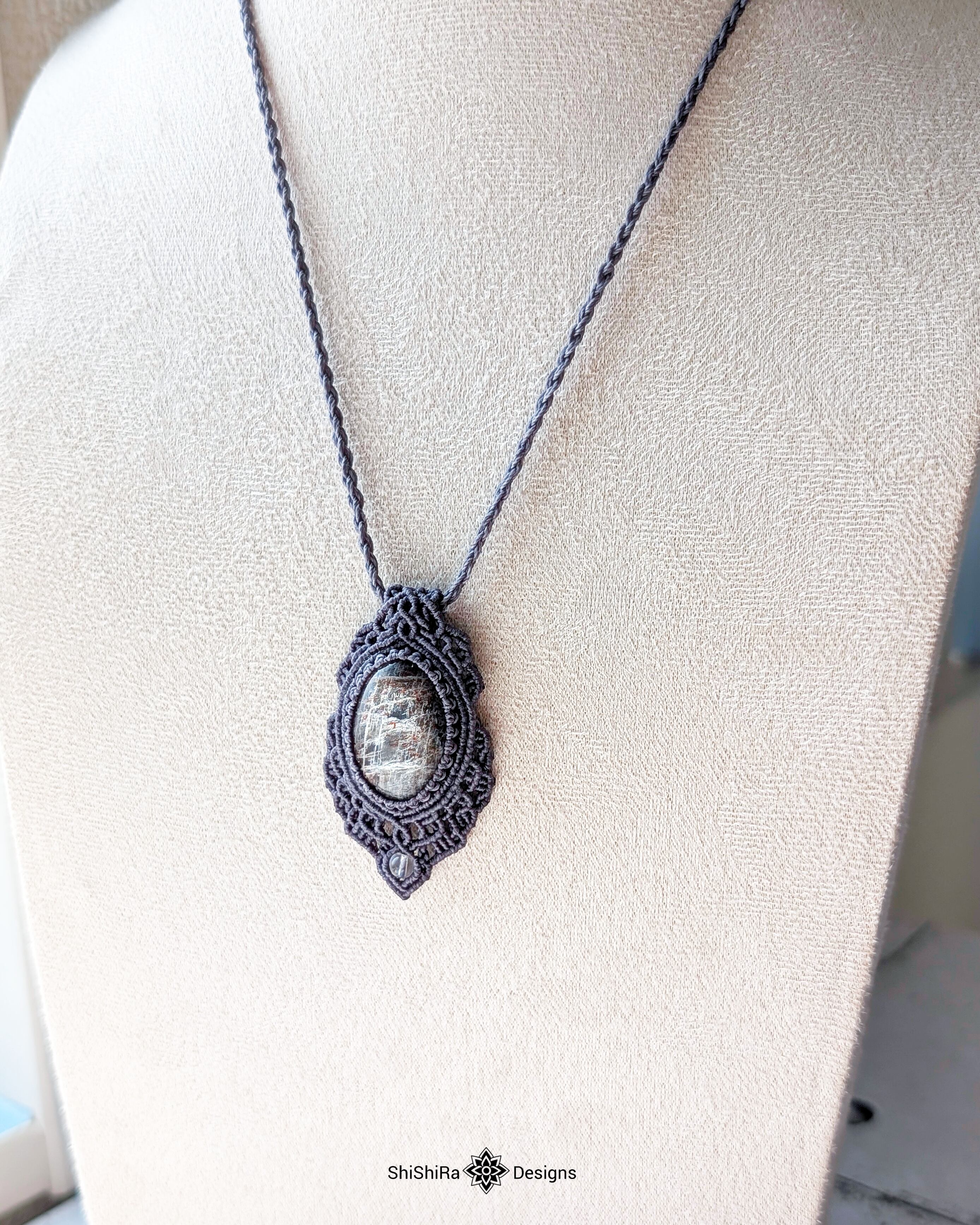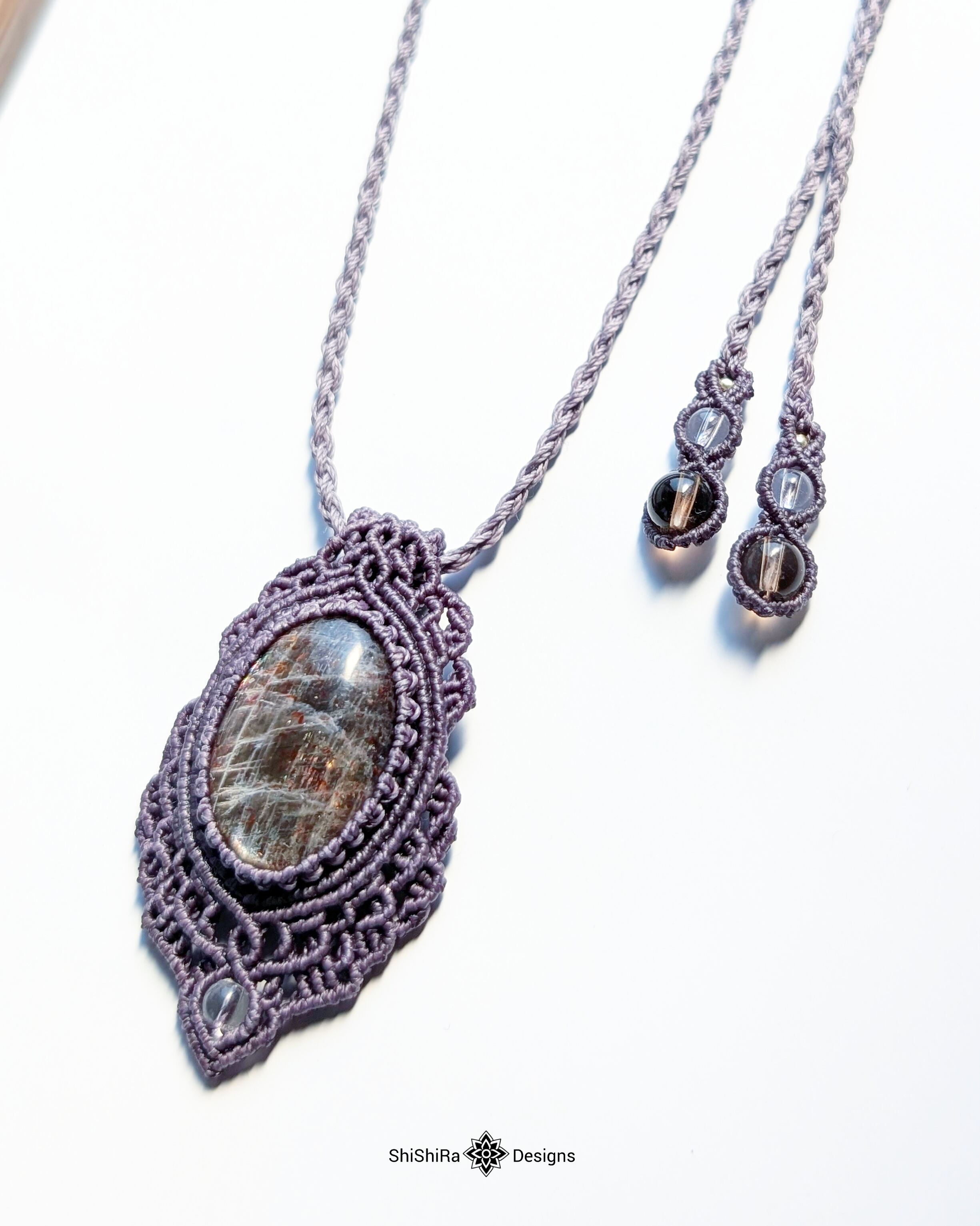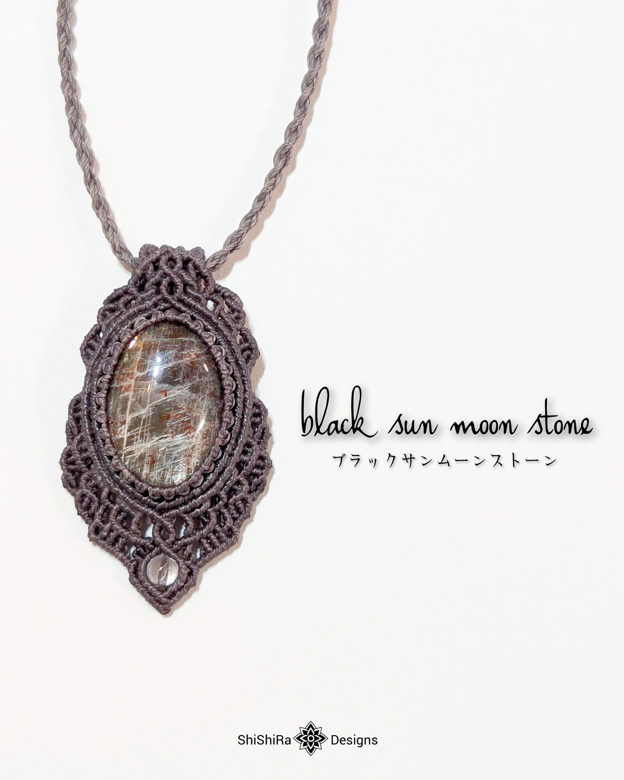 シルバーシラー輝くブラックサンムーンストーンのマクラメペンダント