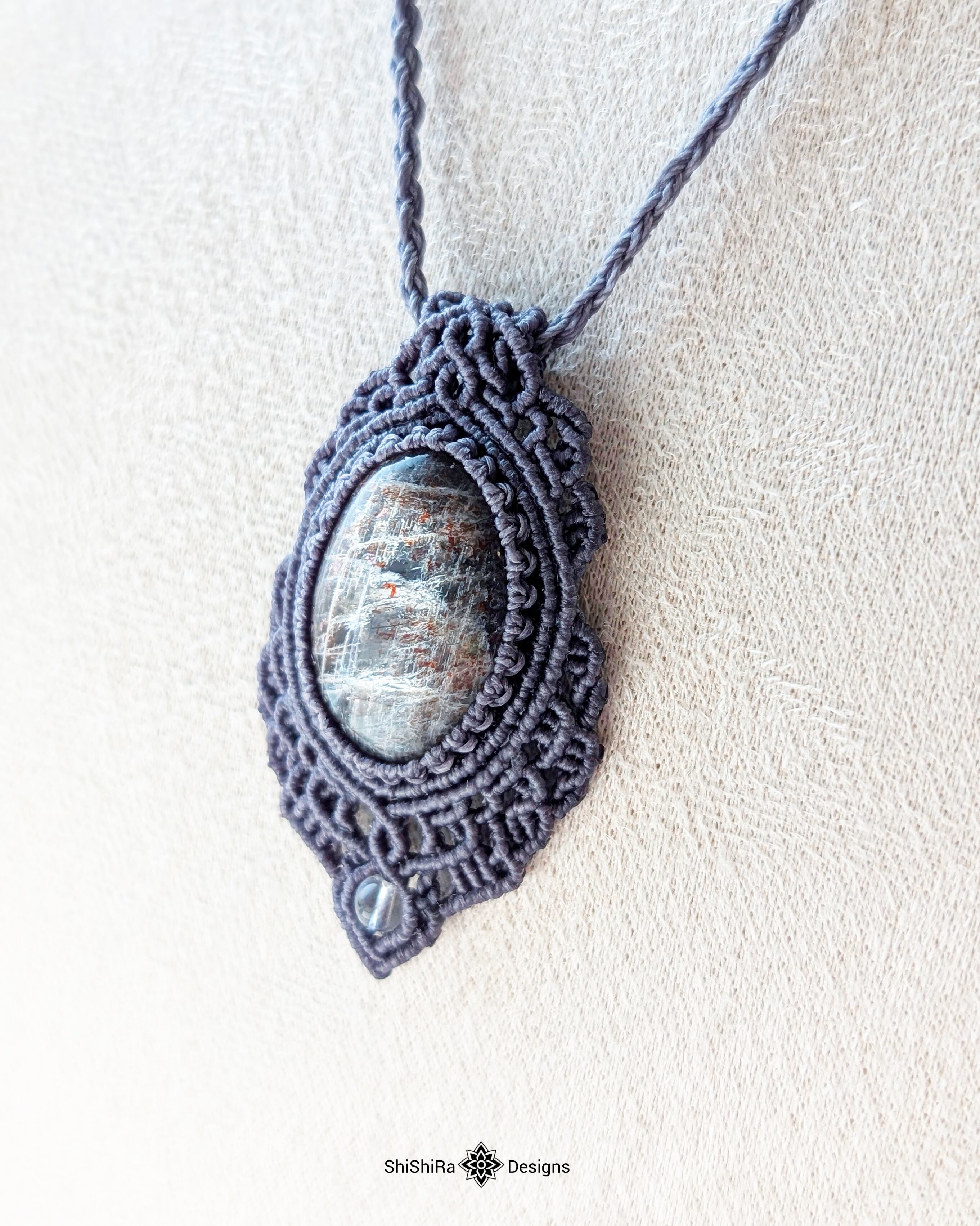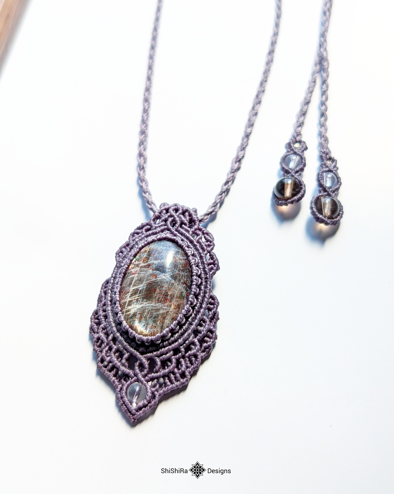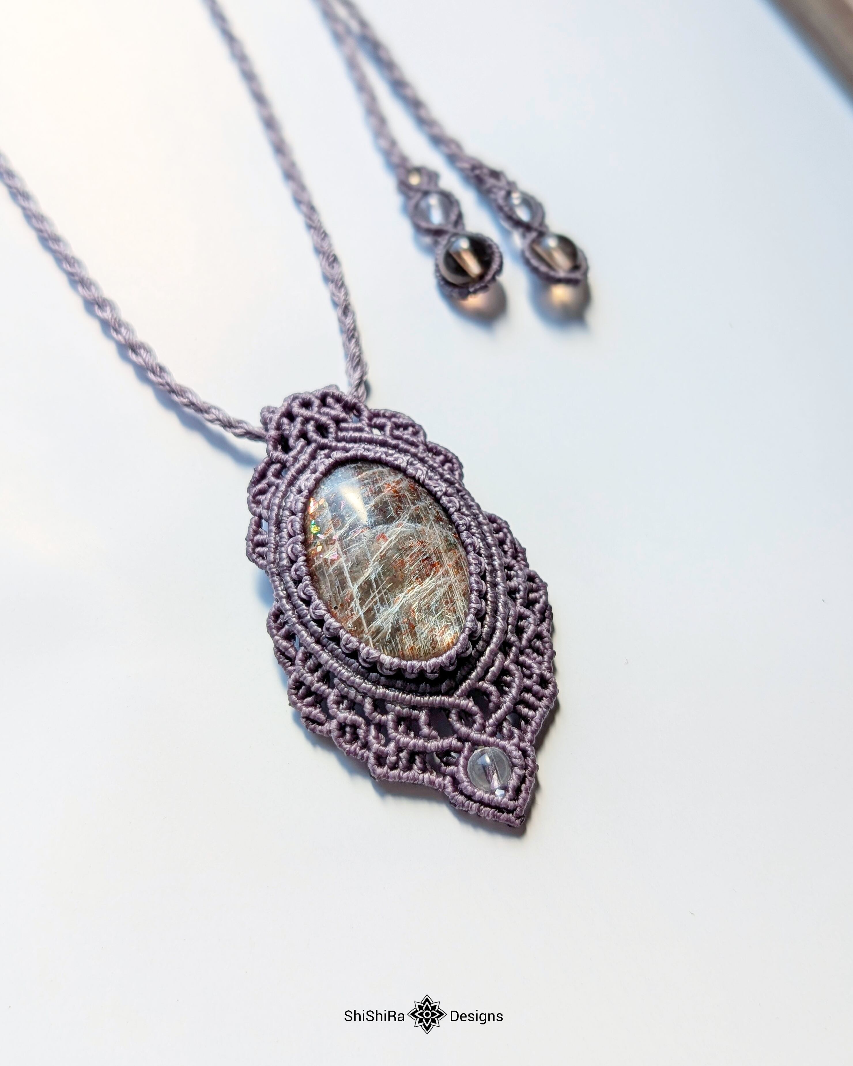 シルバーシラー輝くブラックサンムーンストーンのマクラメペンダント