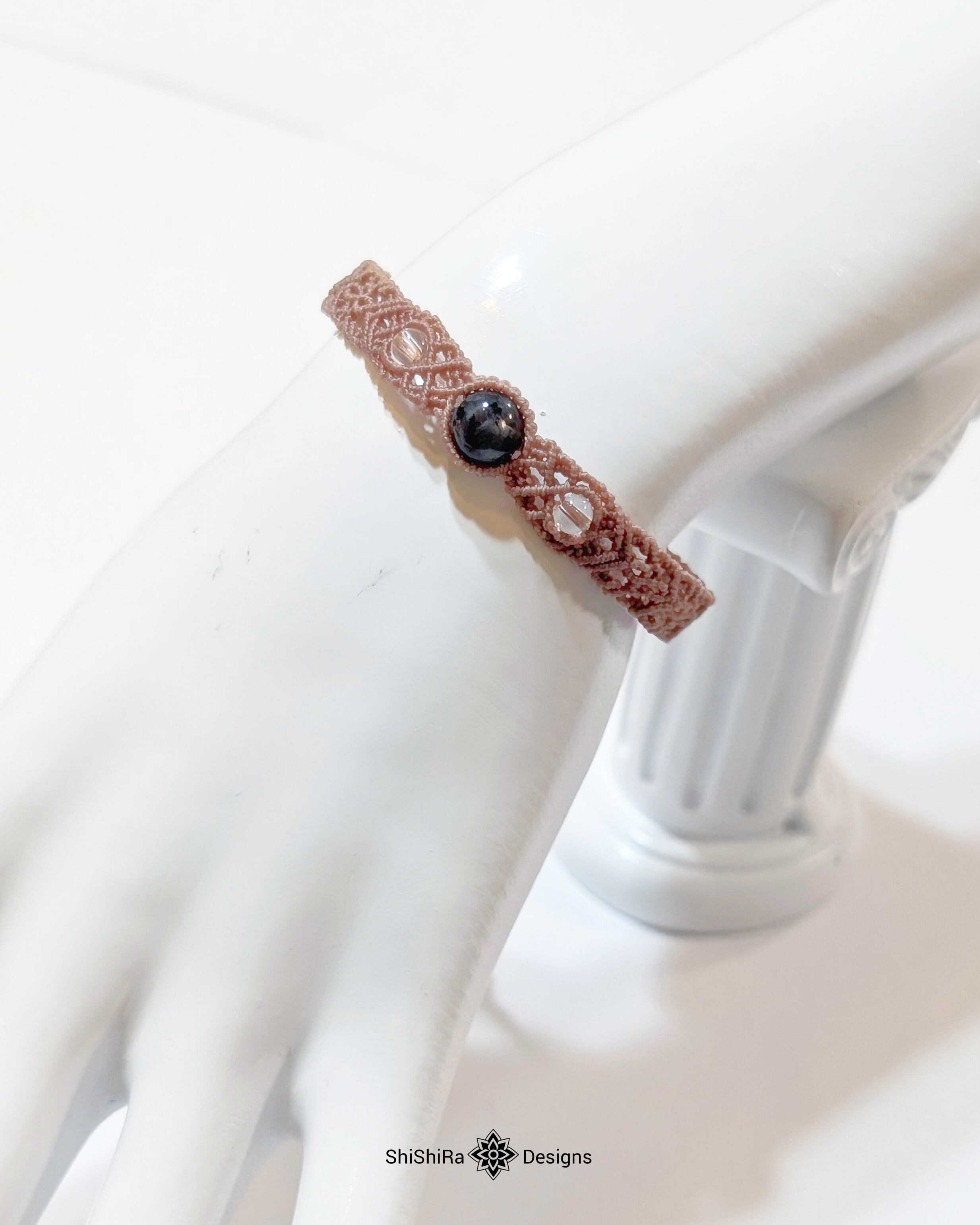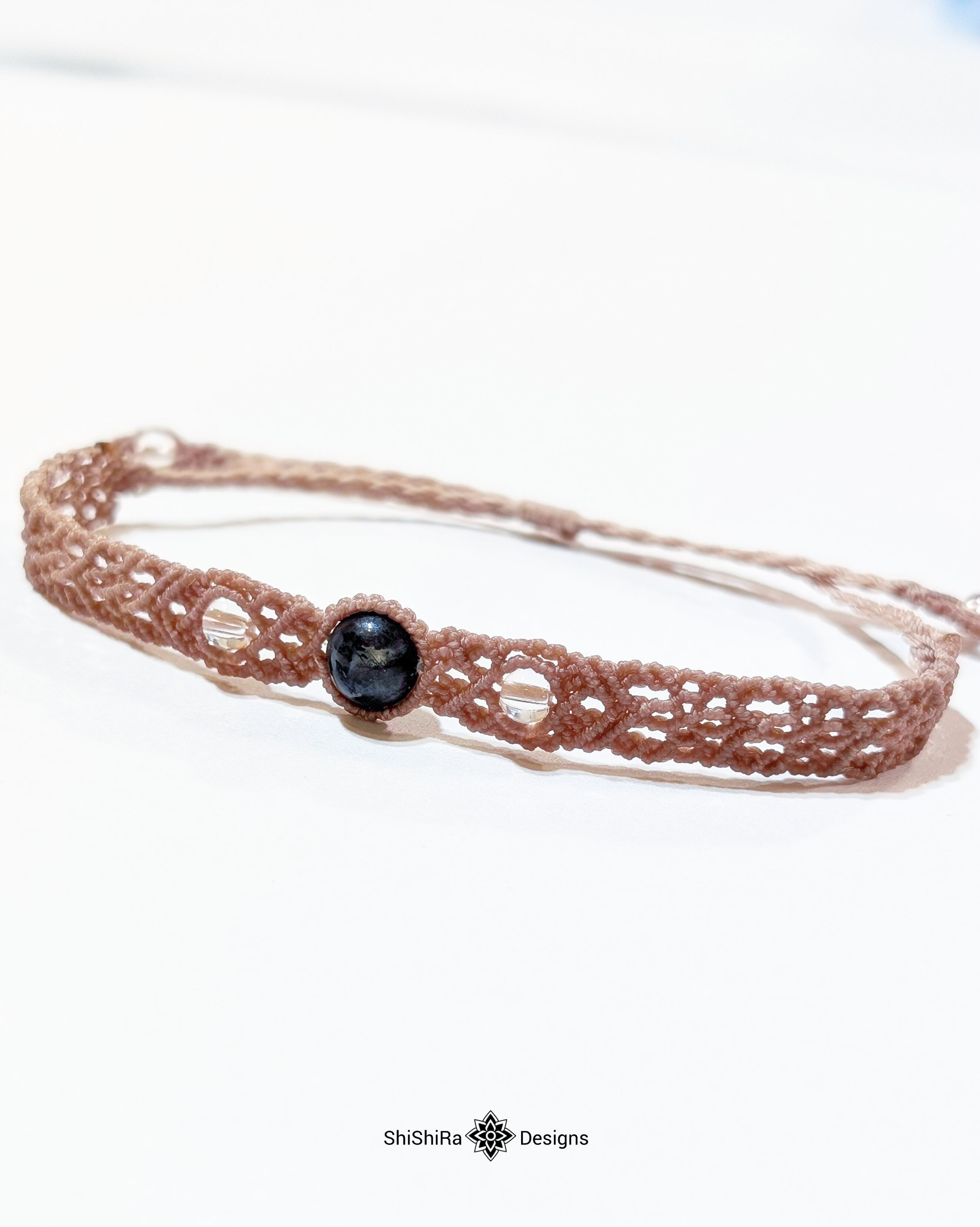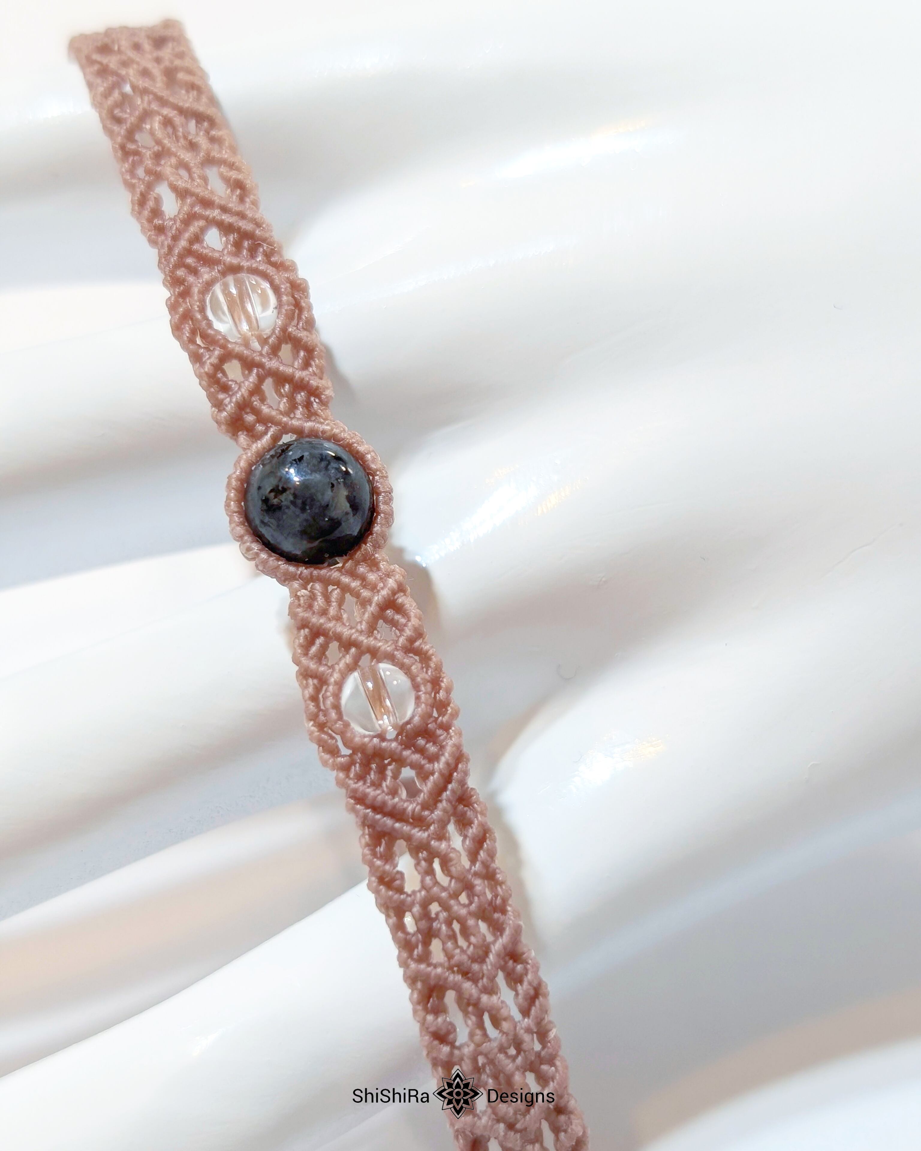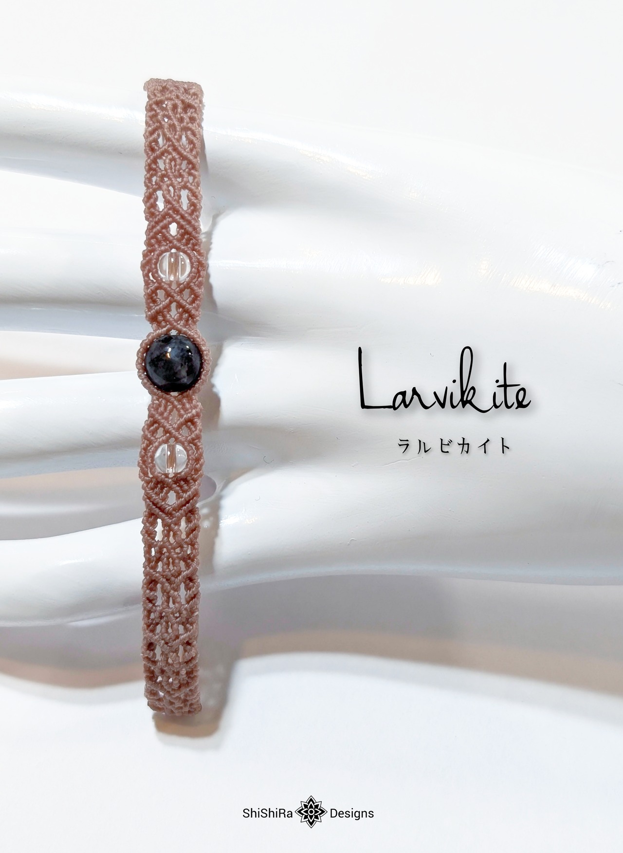 こちらはラルビカイトをマクラメ編みで編みこんだブレスレットです。