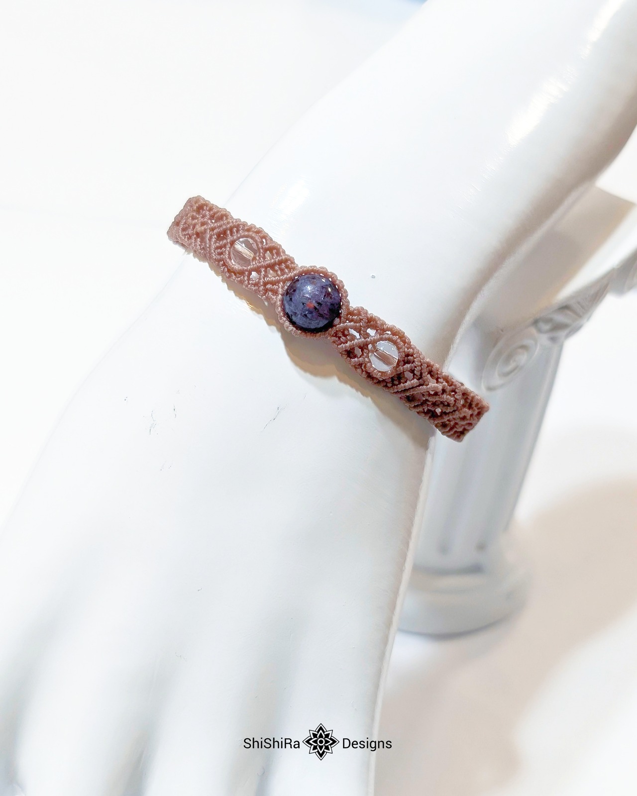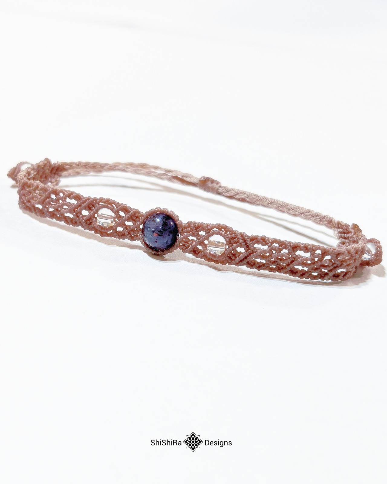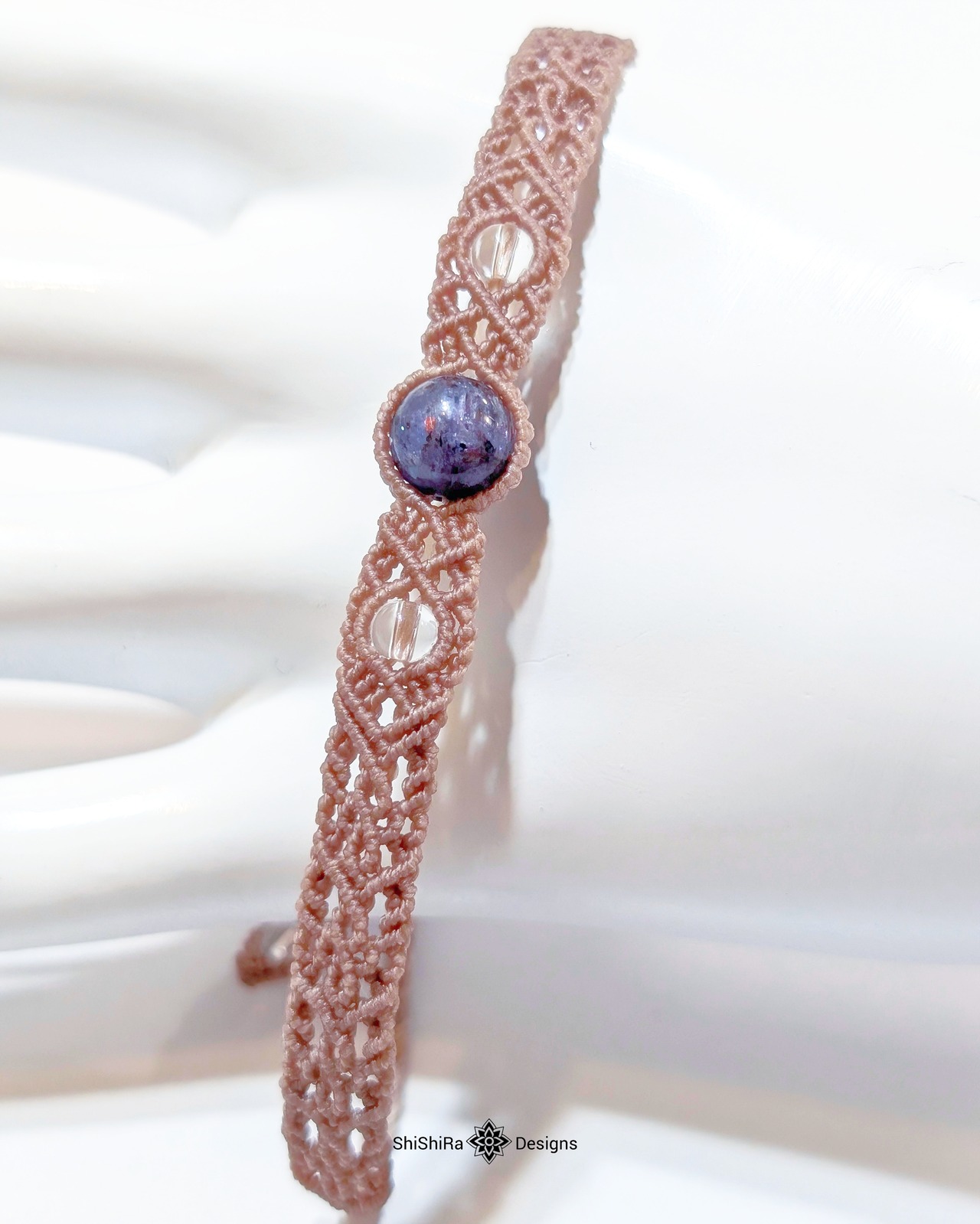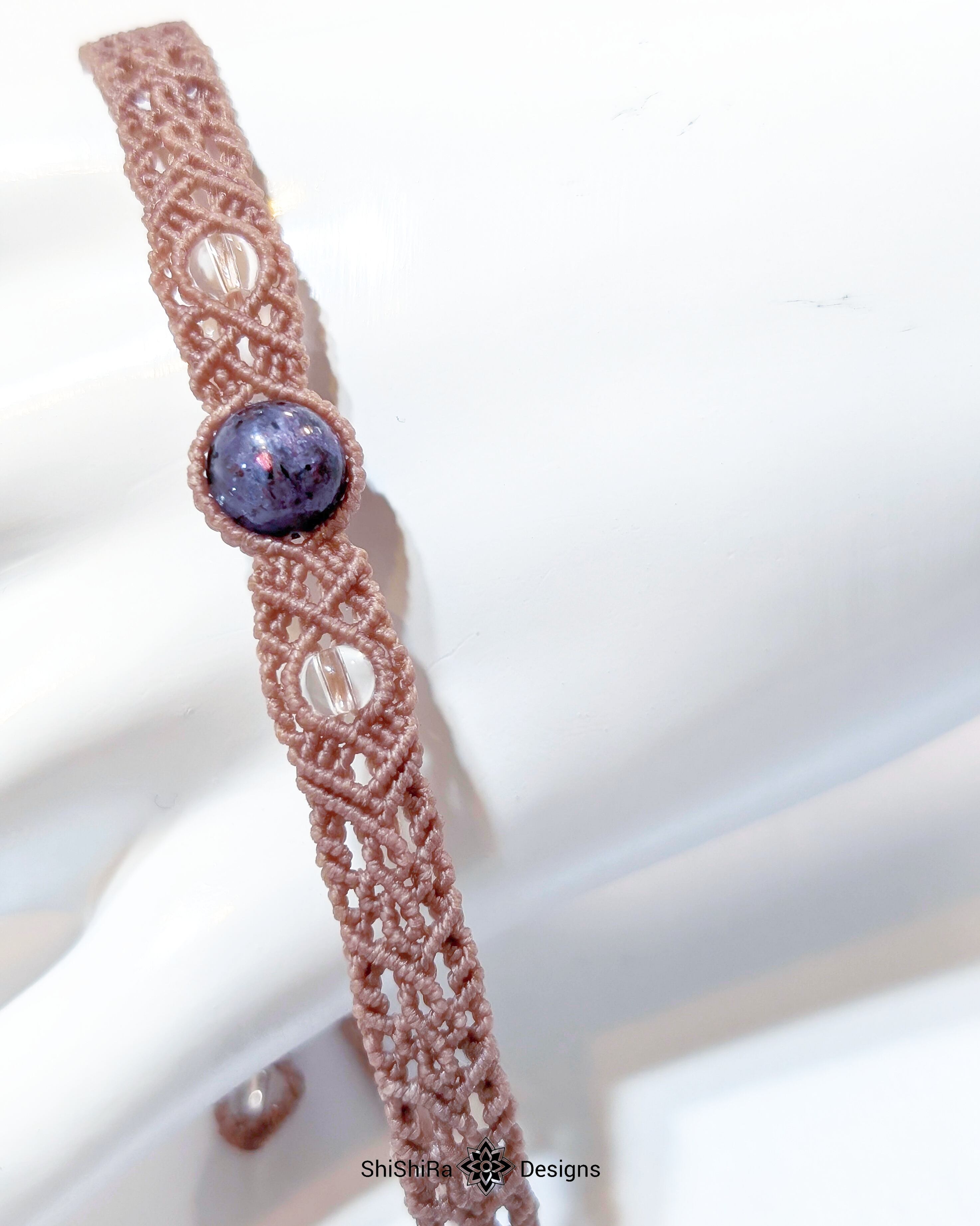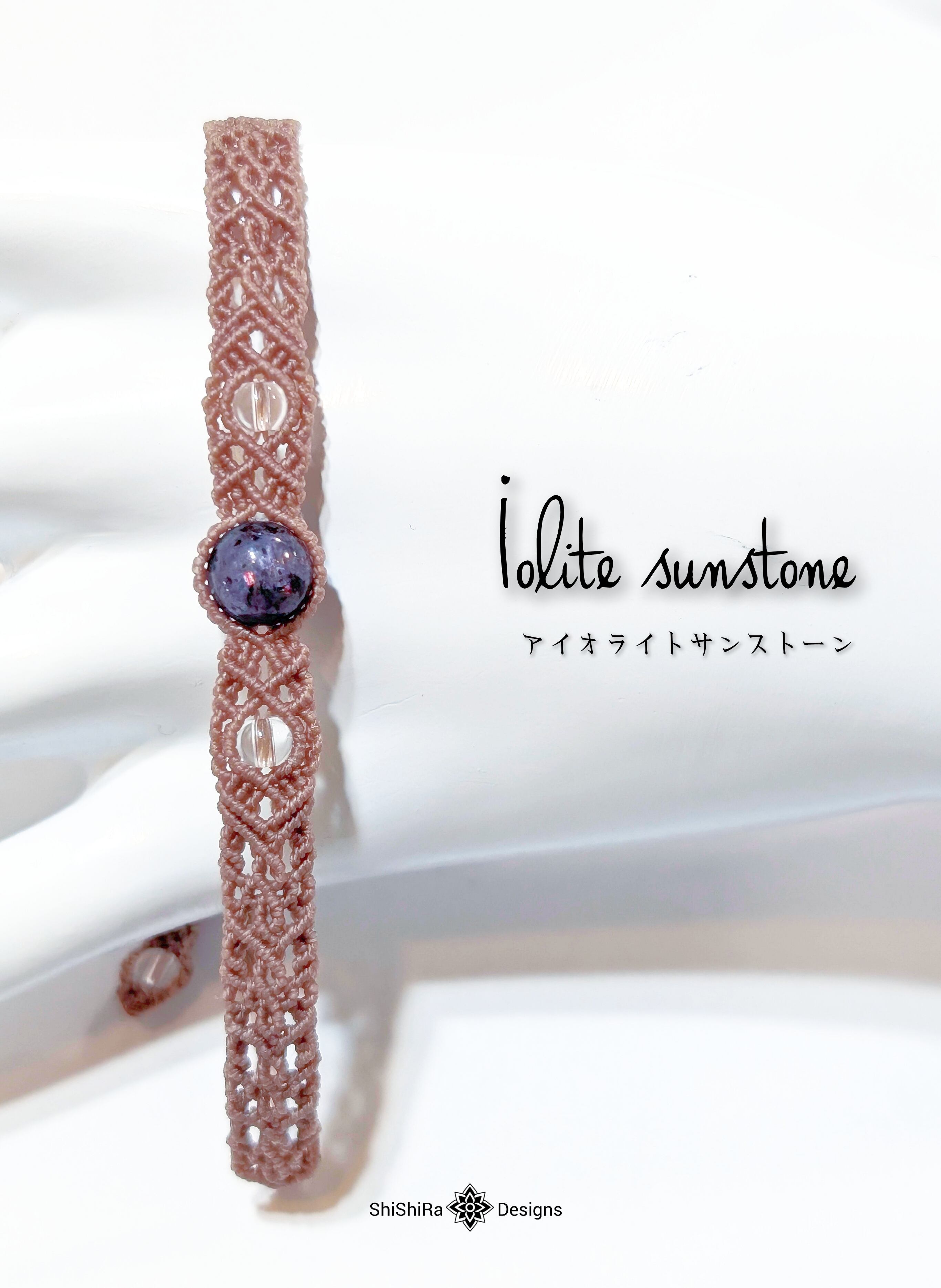 こちらはアイオライトサンストーンをマクラメ編みで編みこんだブレスレットです。