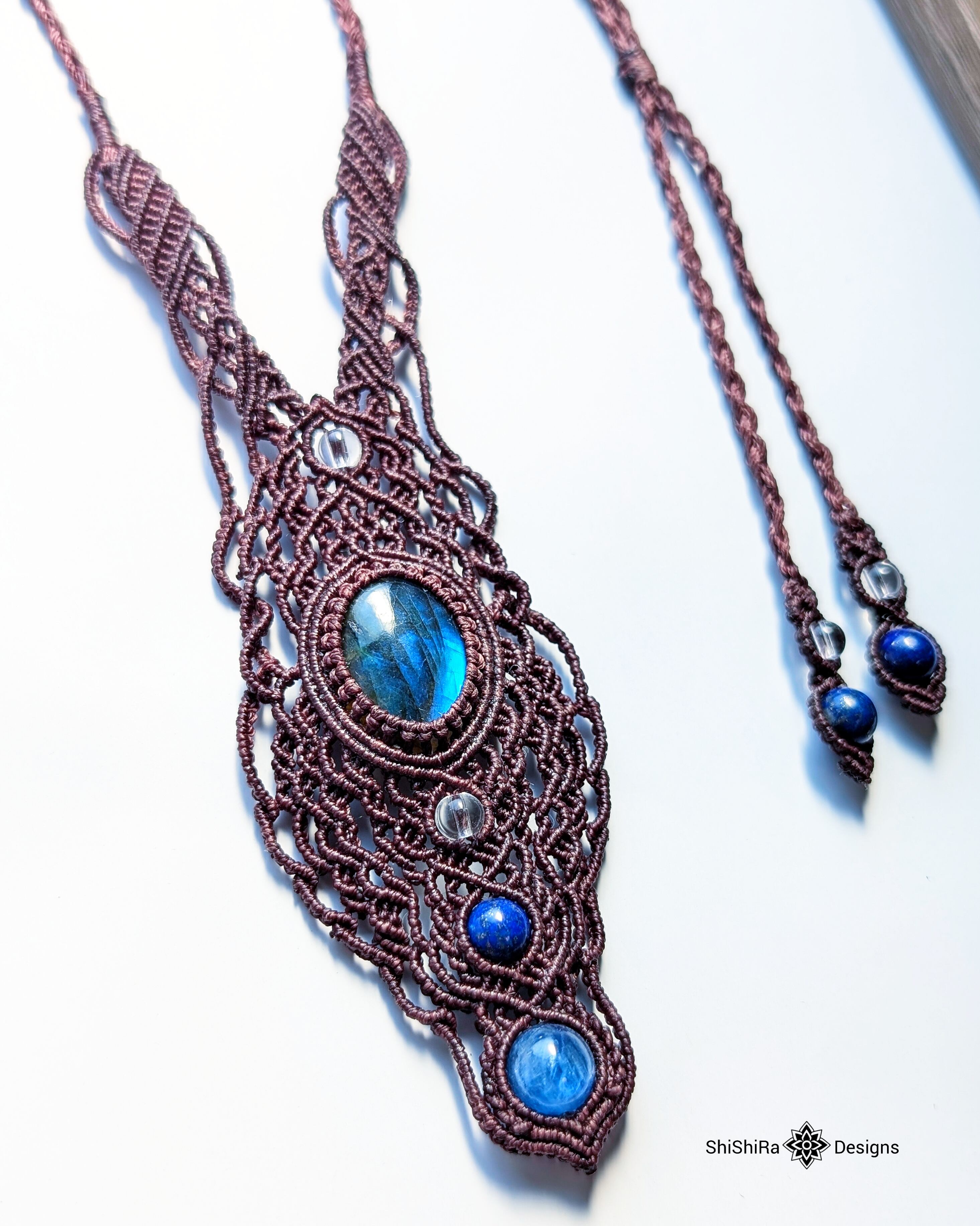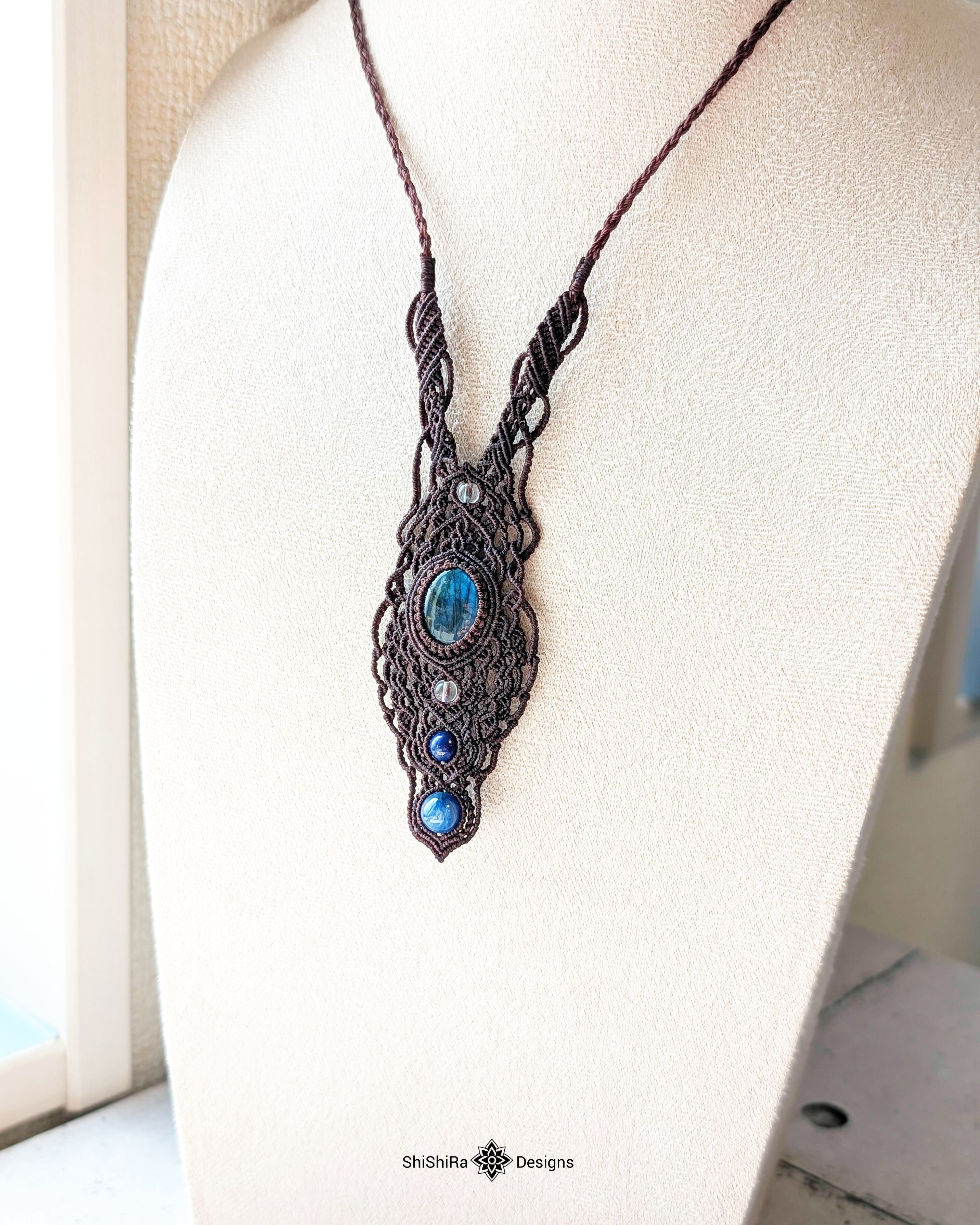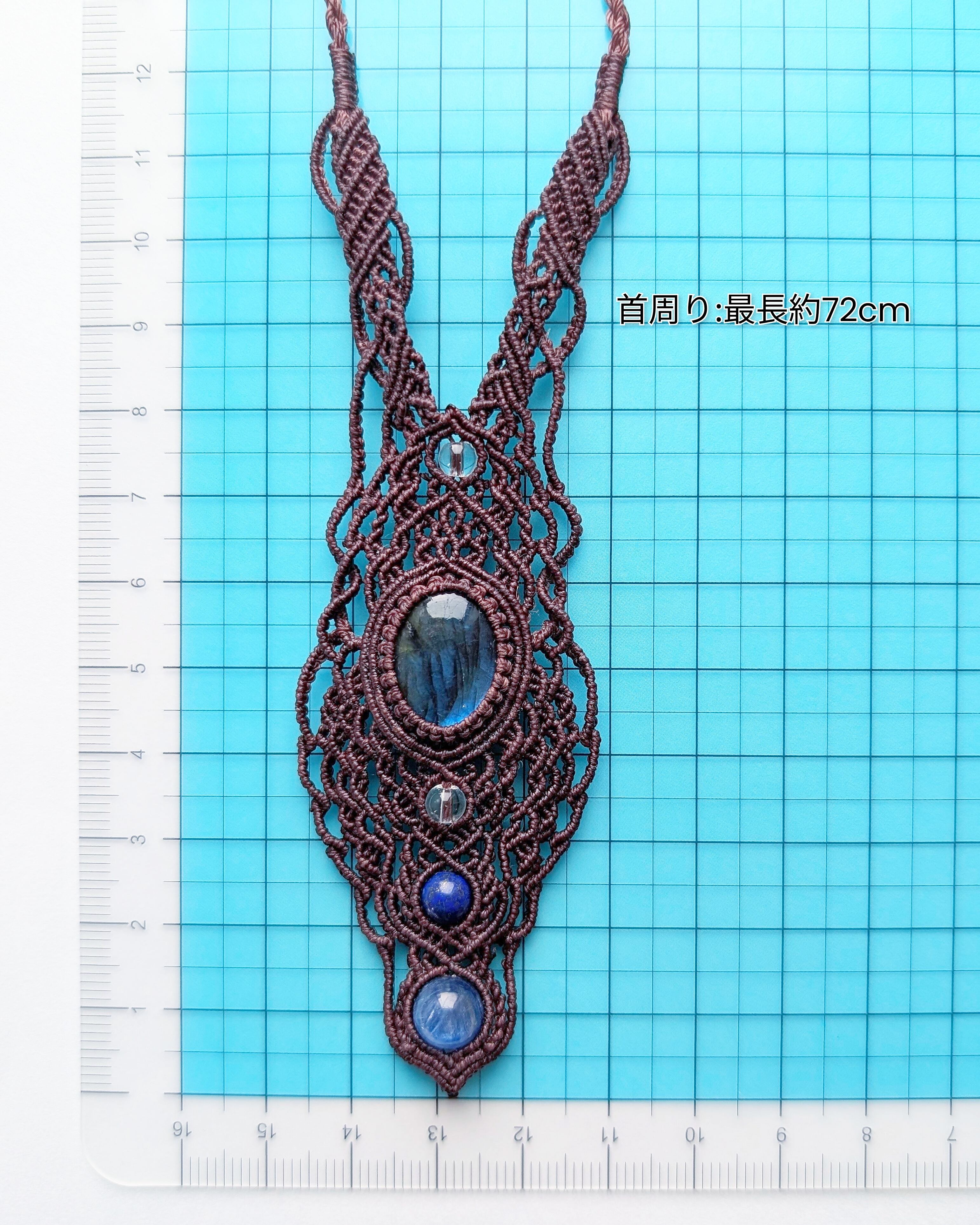 【大特価】神秘的なブルーシラーが輝く、ラブラドライトのデザインマクラメペンダント [金属アレルギー対応]