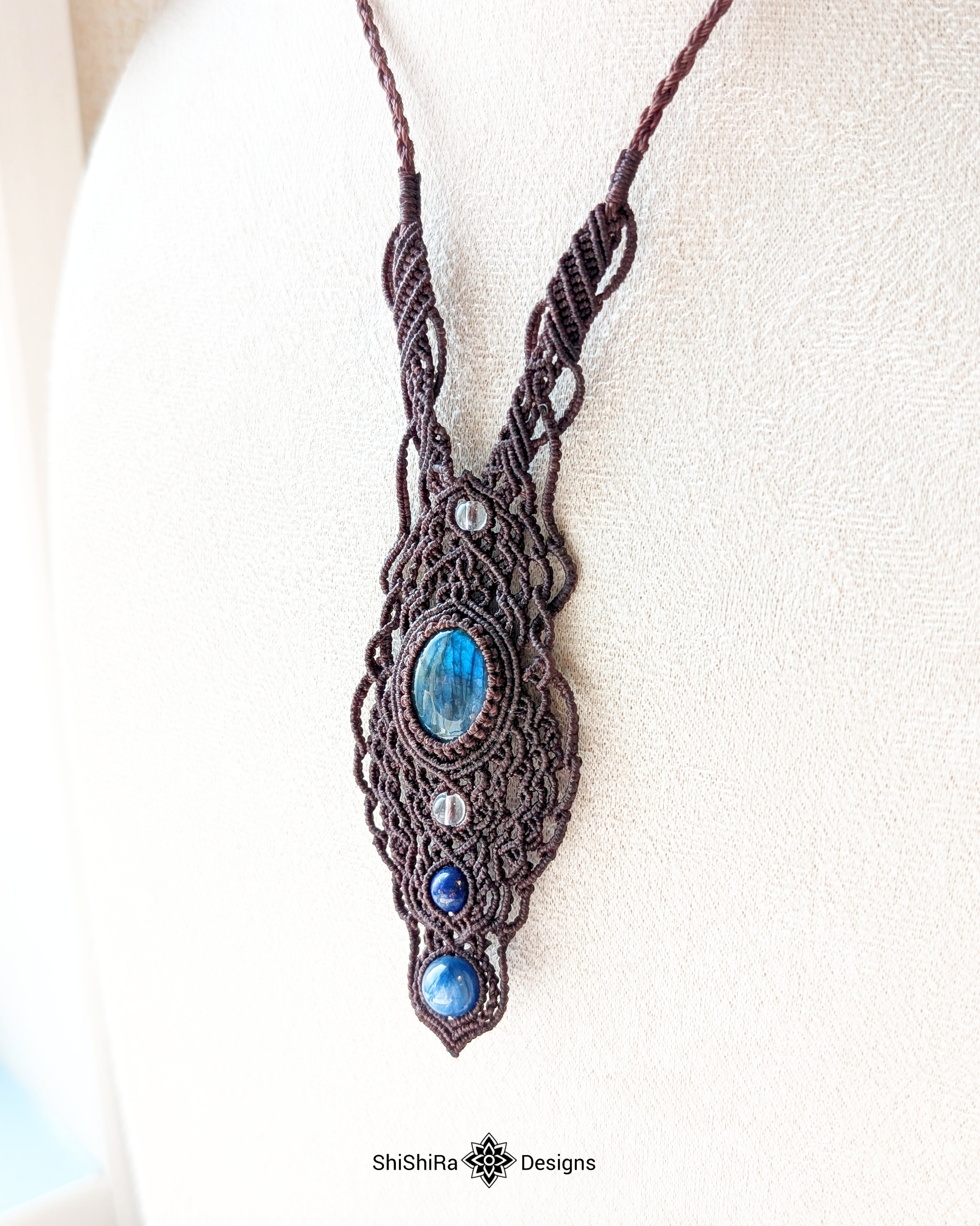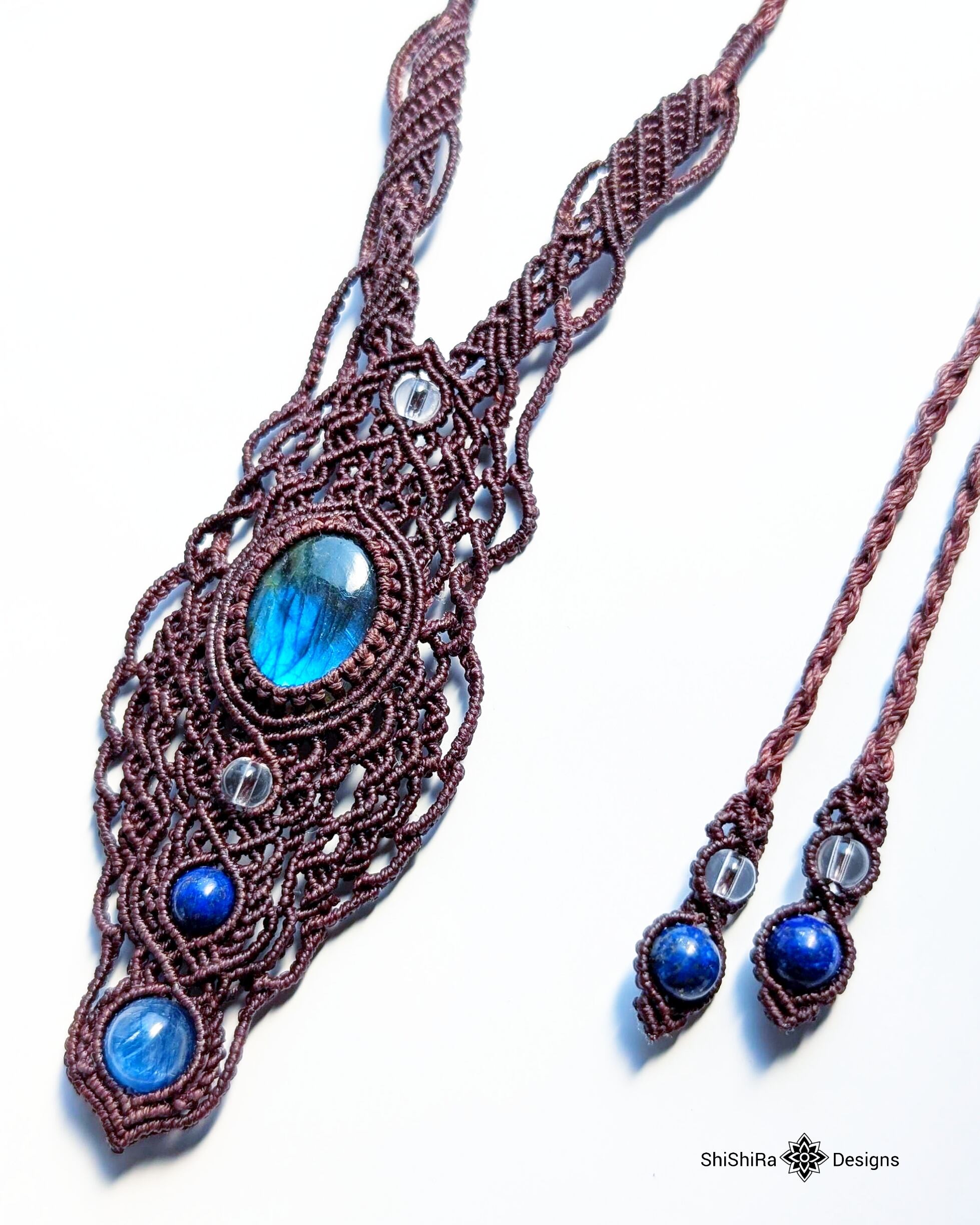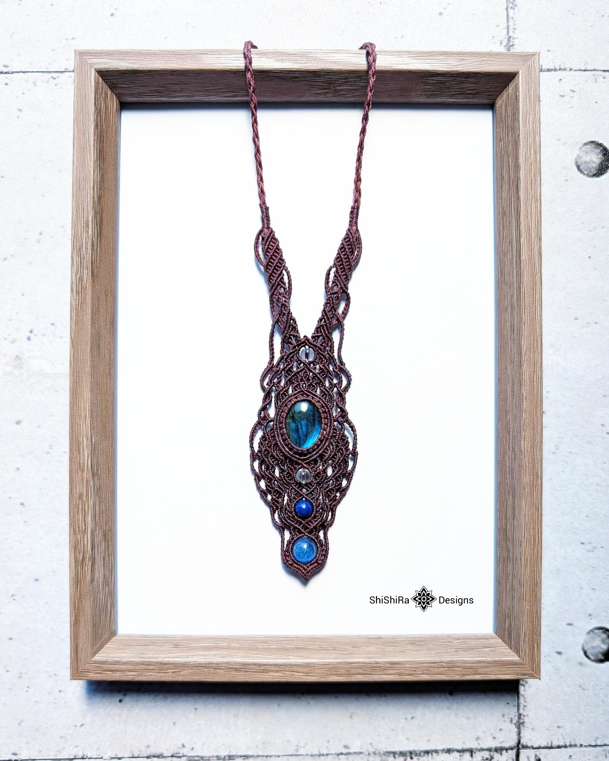 【大特価】神秘的なブルーシラーが輝く、ラブラドライトのデザインマクラメペンダント [金属アレルギー対応]