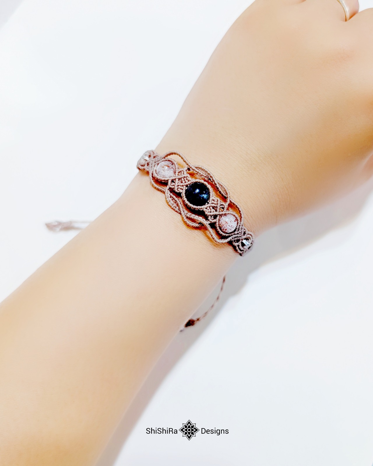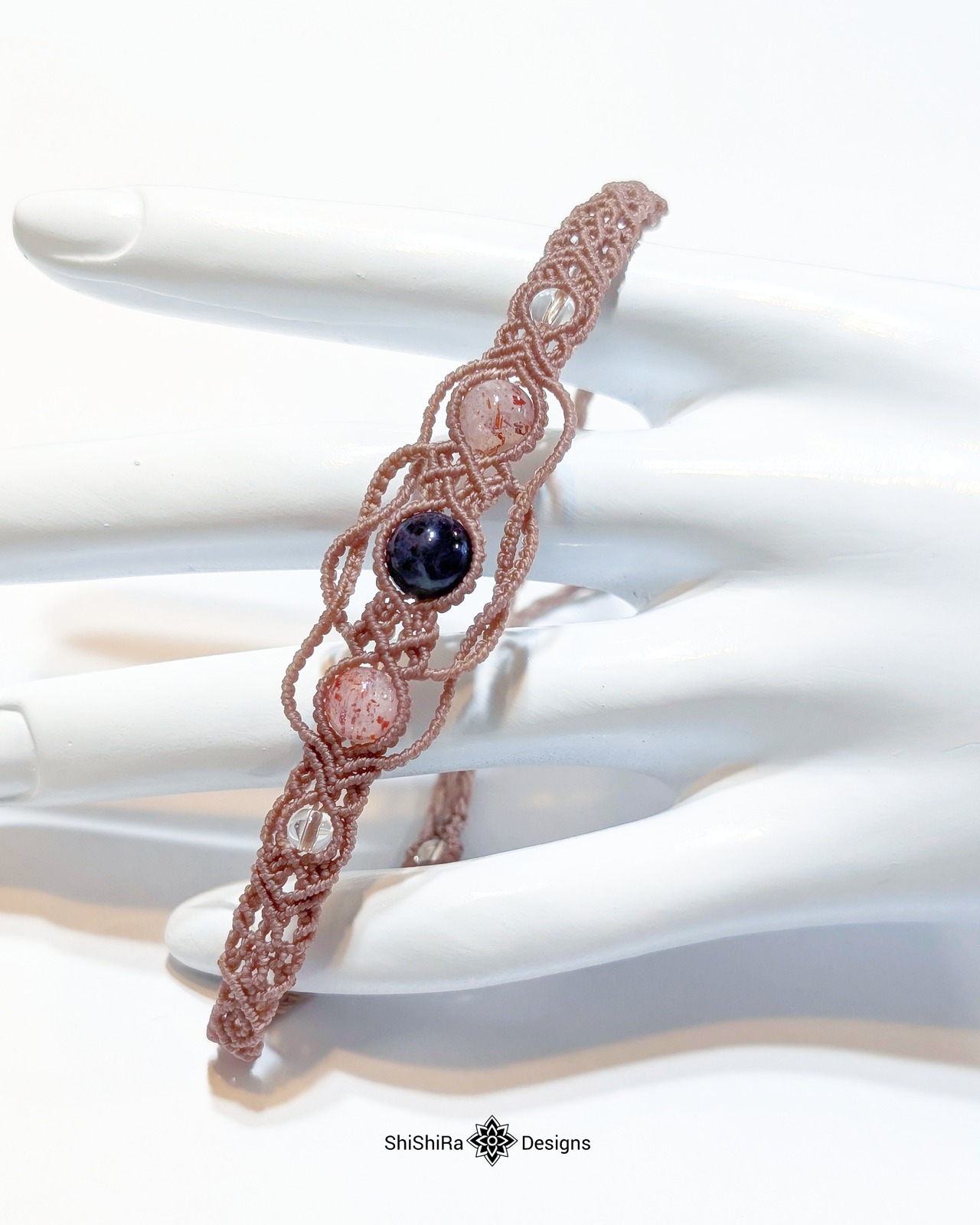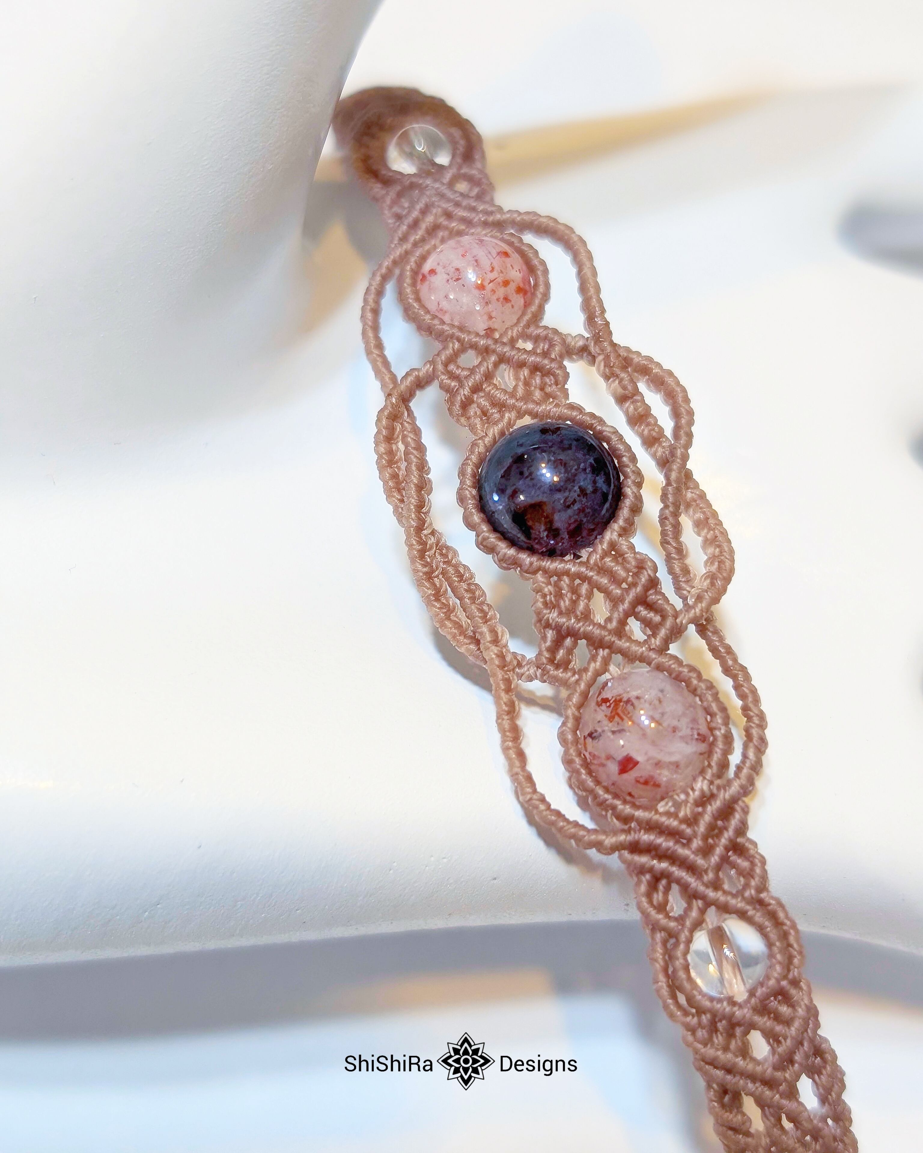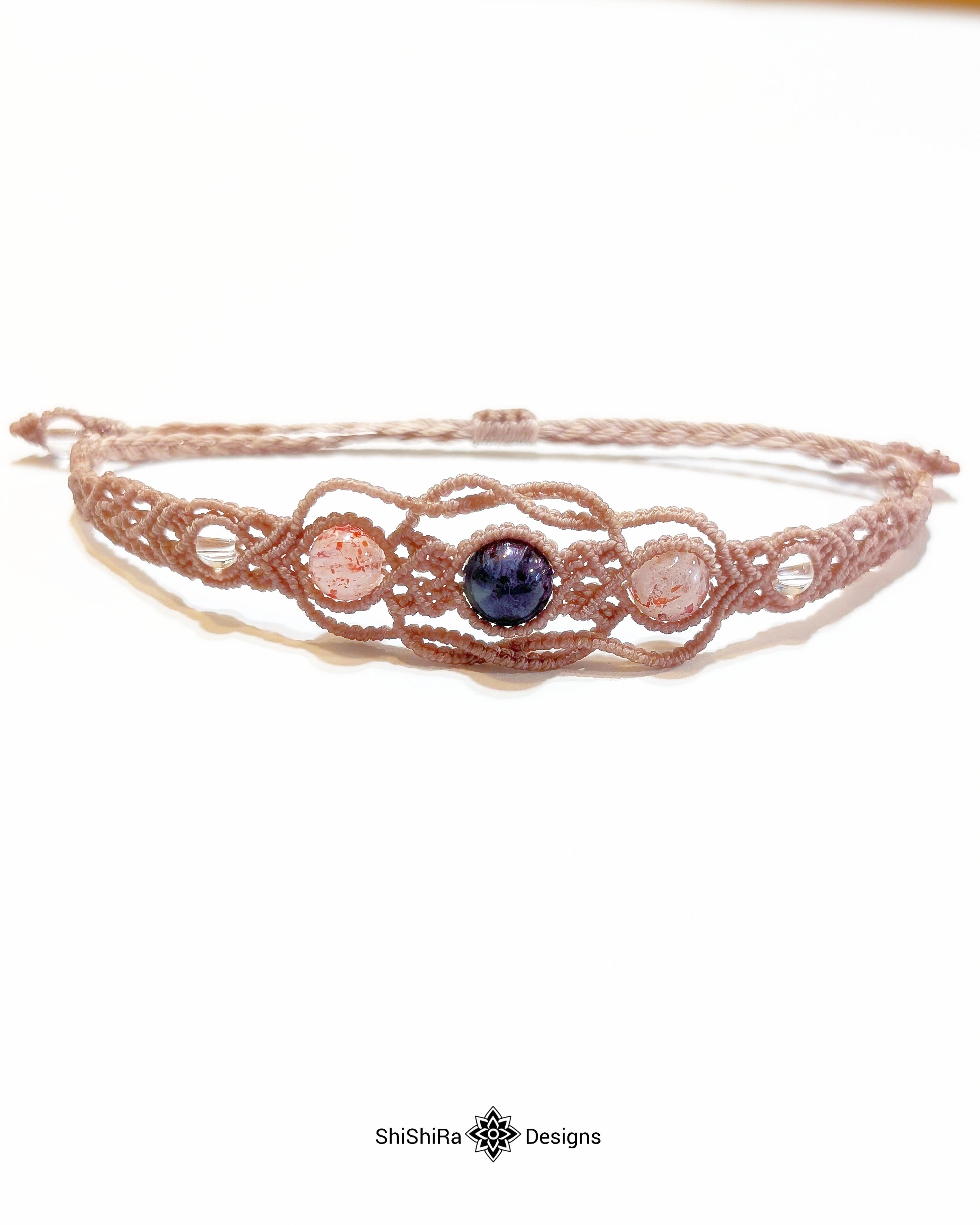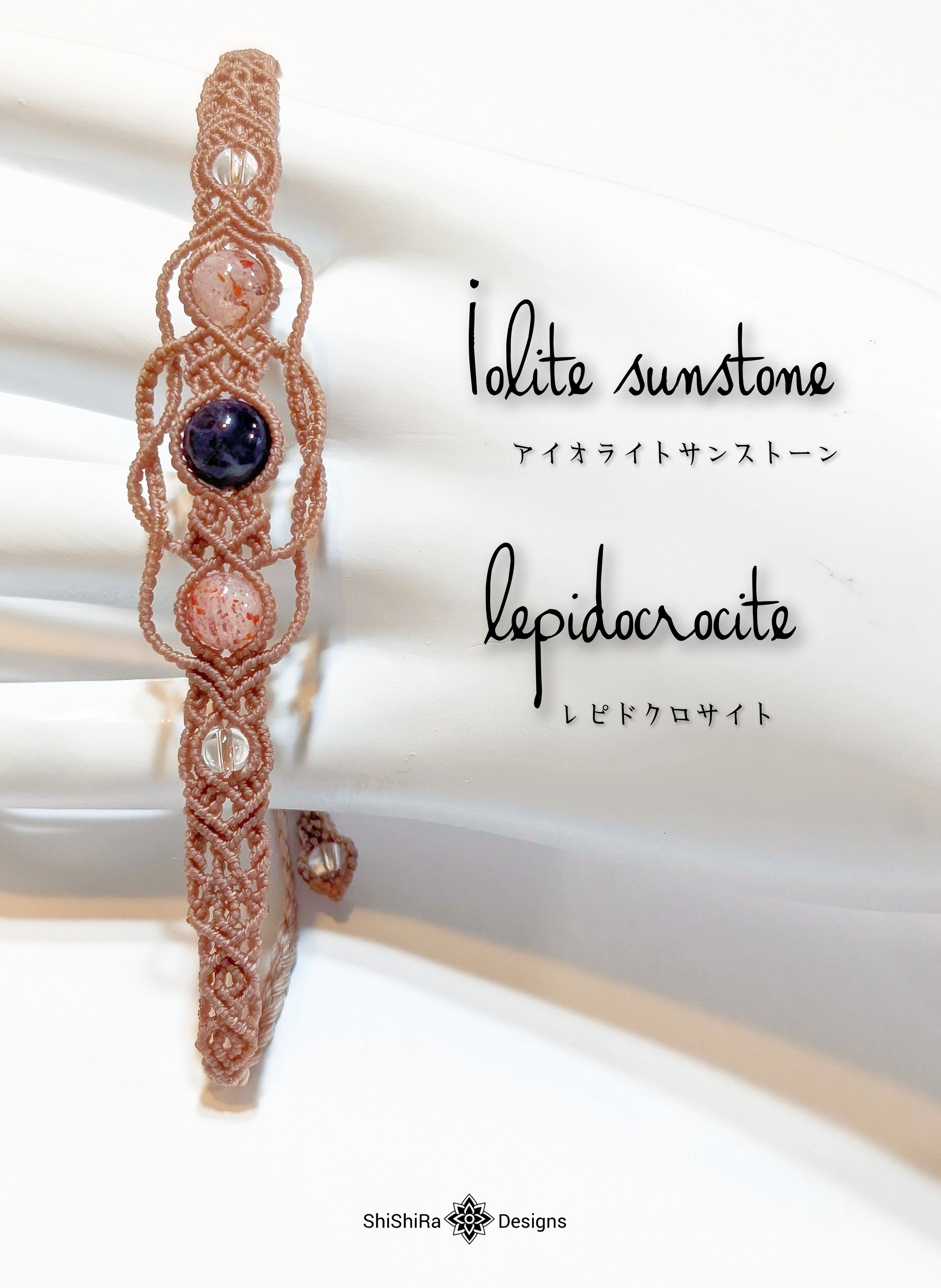 こちらはアイオライトサンストーンとレピドクロサイトをマクラメ編みで編みこんだブレスレットです。