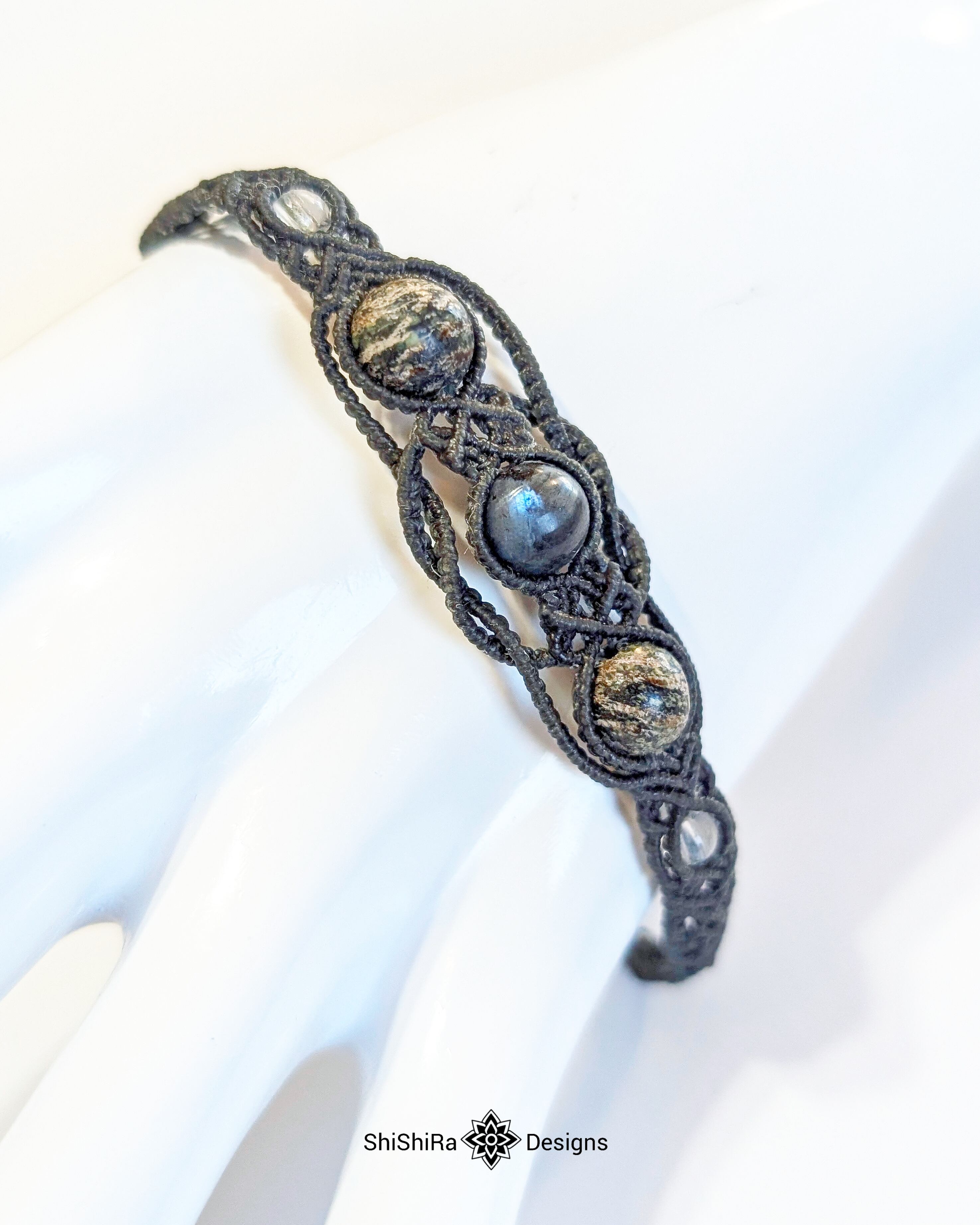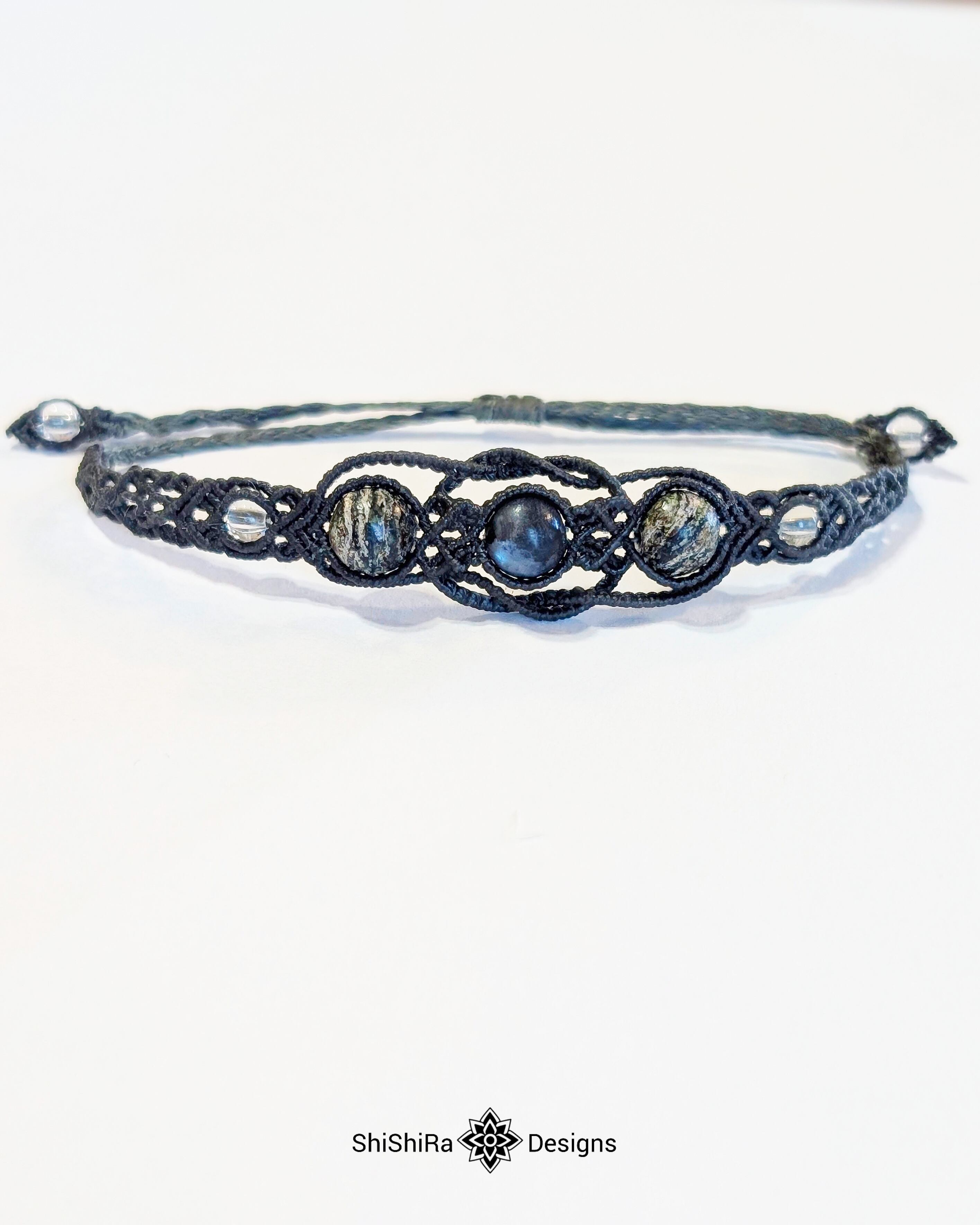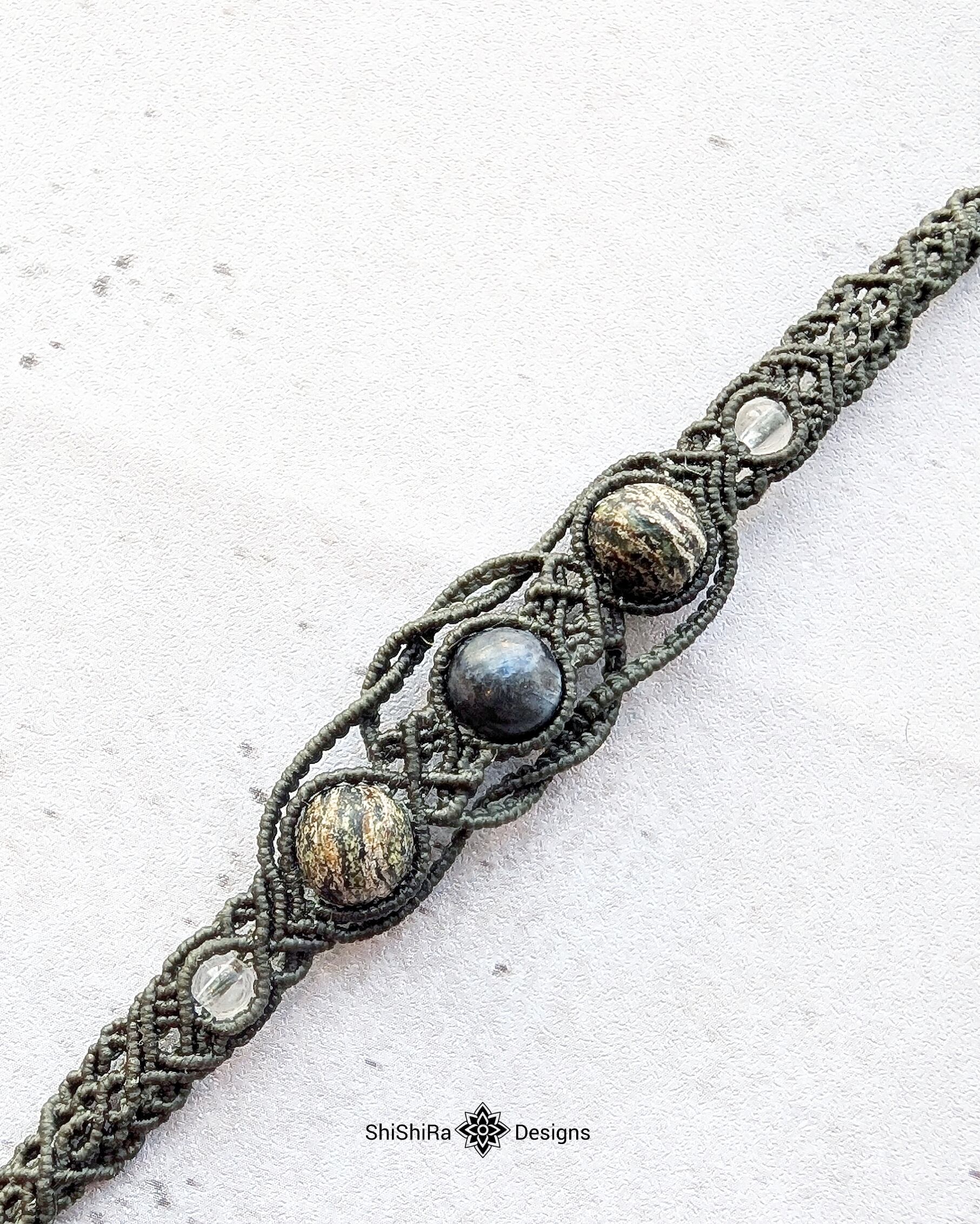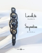 こちらはラルビカイトとサーペンティンをマクラメ編みで編みこんだブレスレットです。