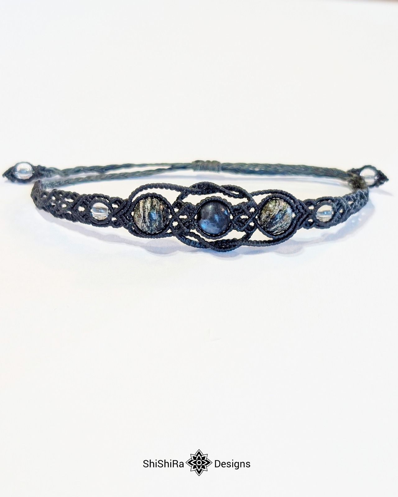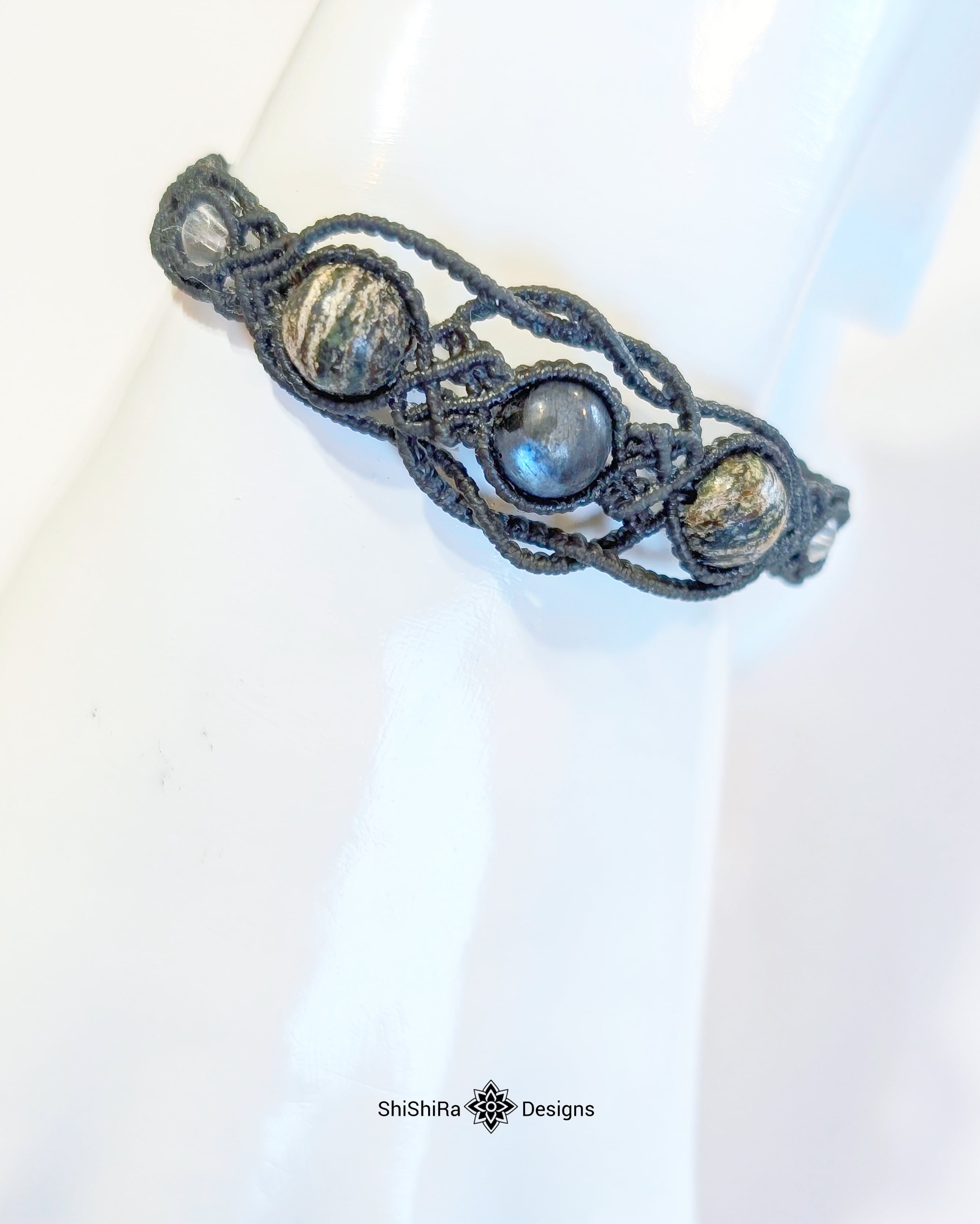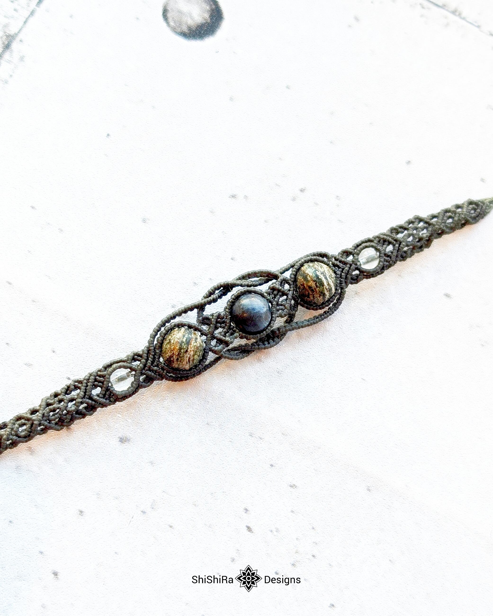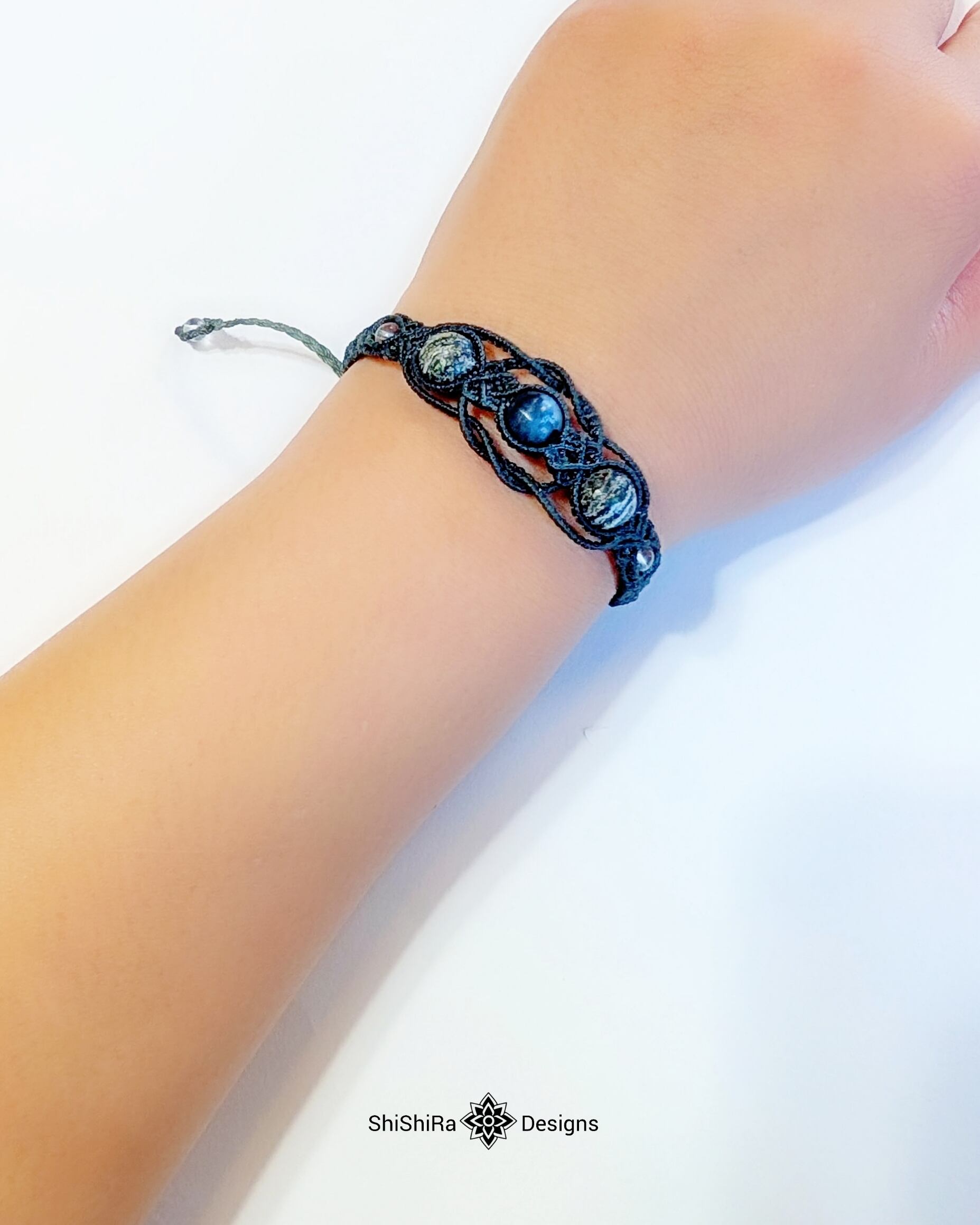 こちらはラルビカイトとサーペンティンをマクラメ編みで編みこんだブレスレットです。
