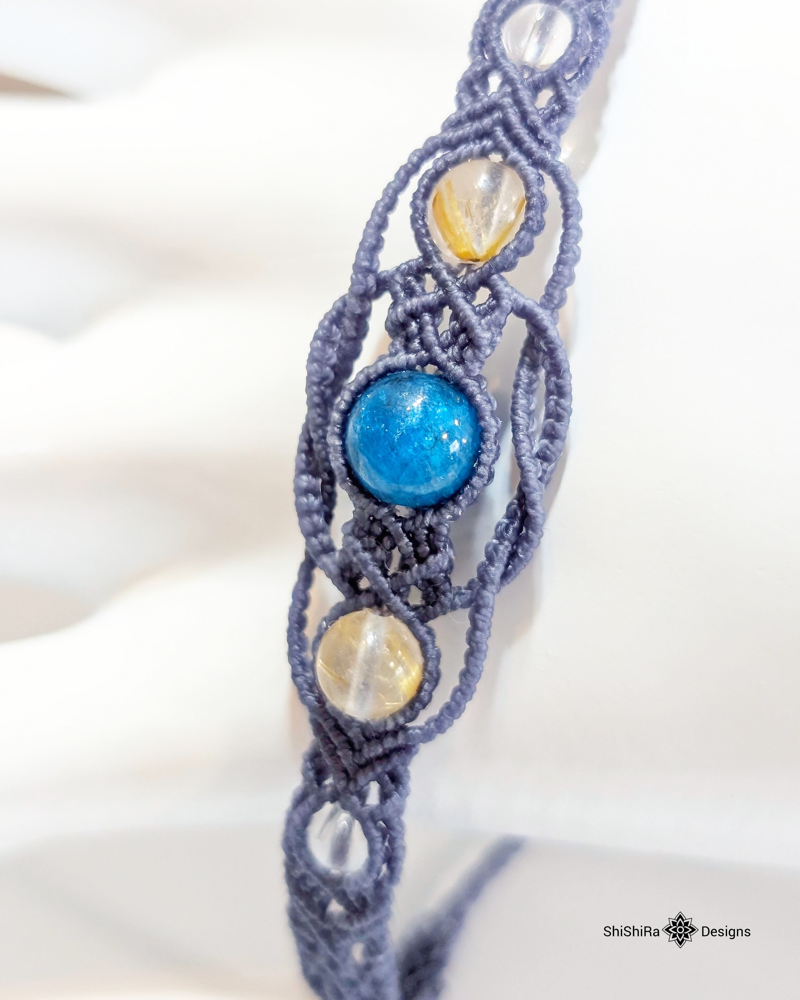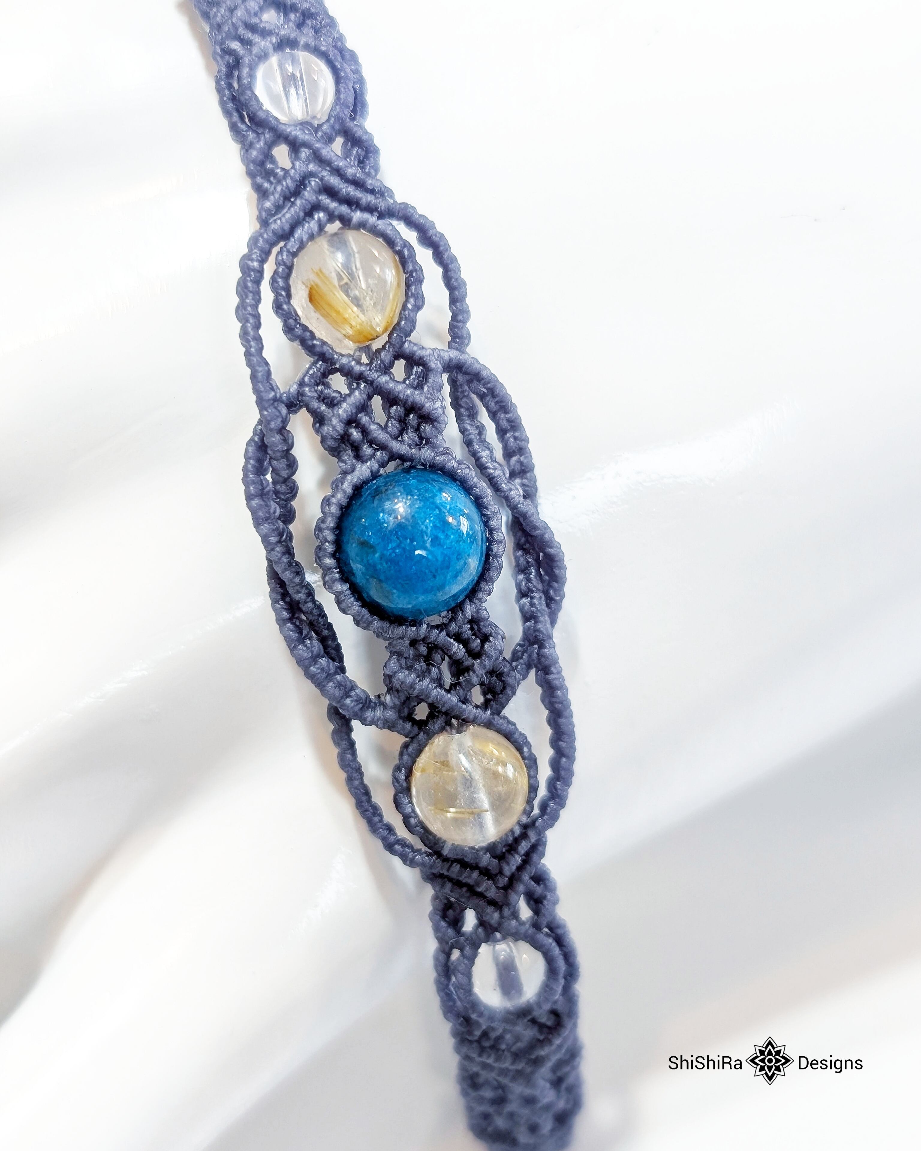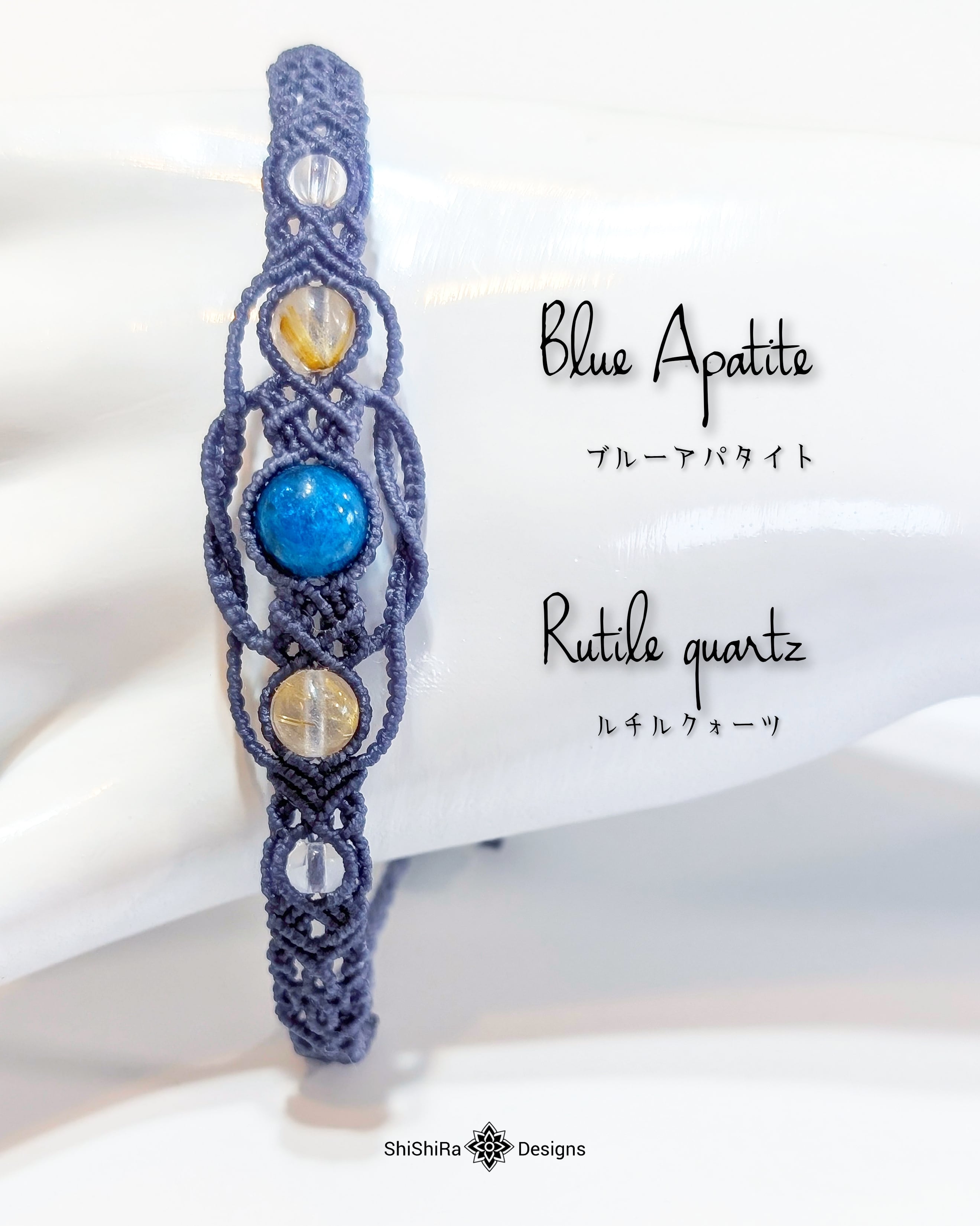 鮮やかな色彩が魅力 ブルーアパタイトとルチルクォーツのうねうねマクラメブレスレット