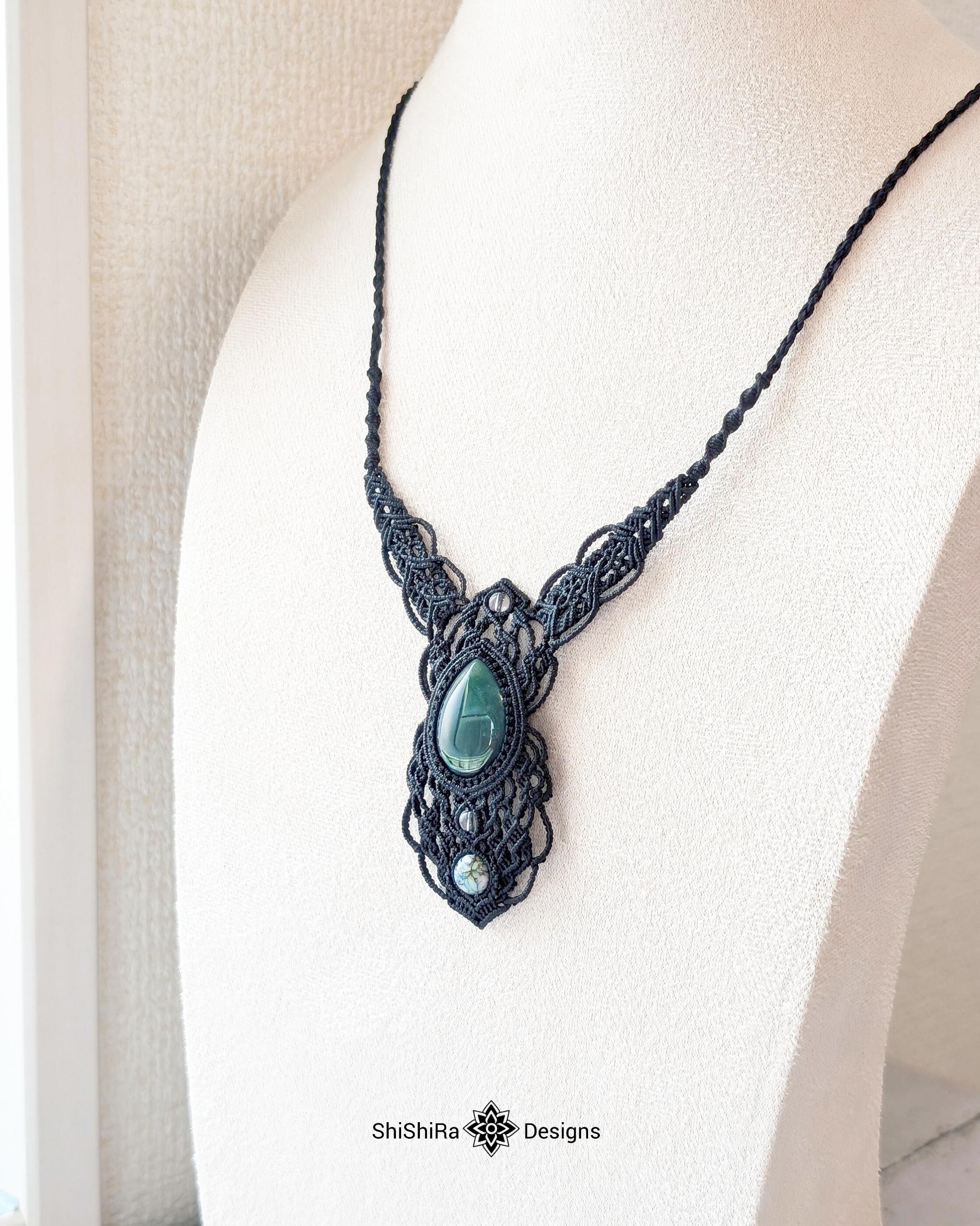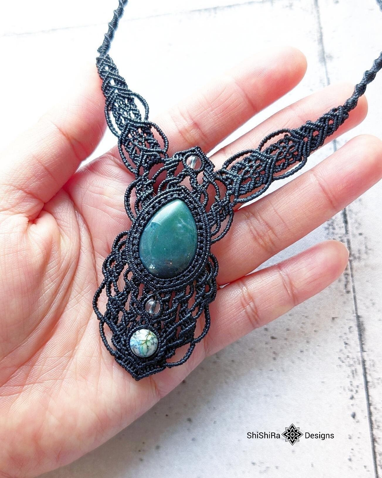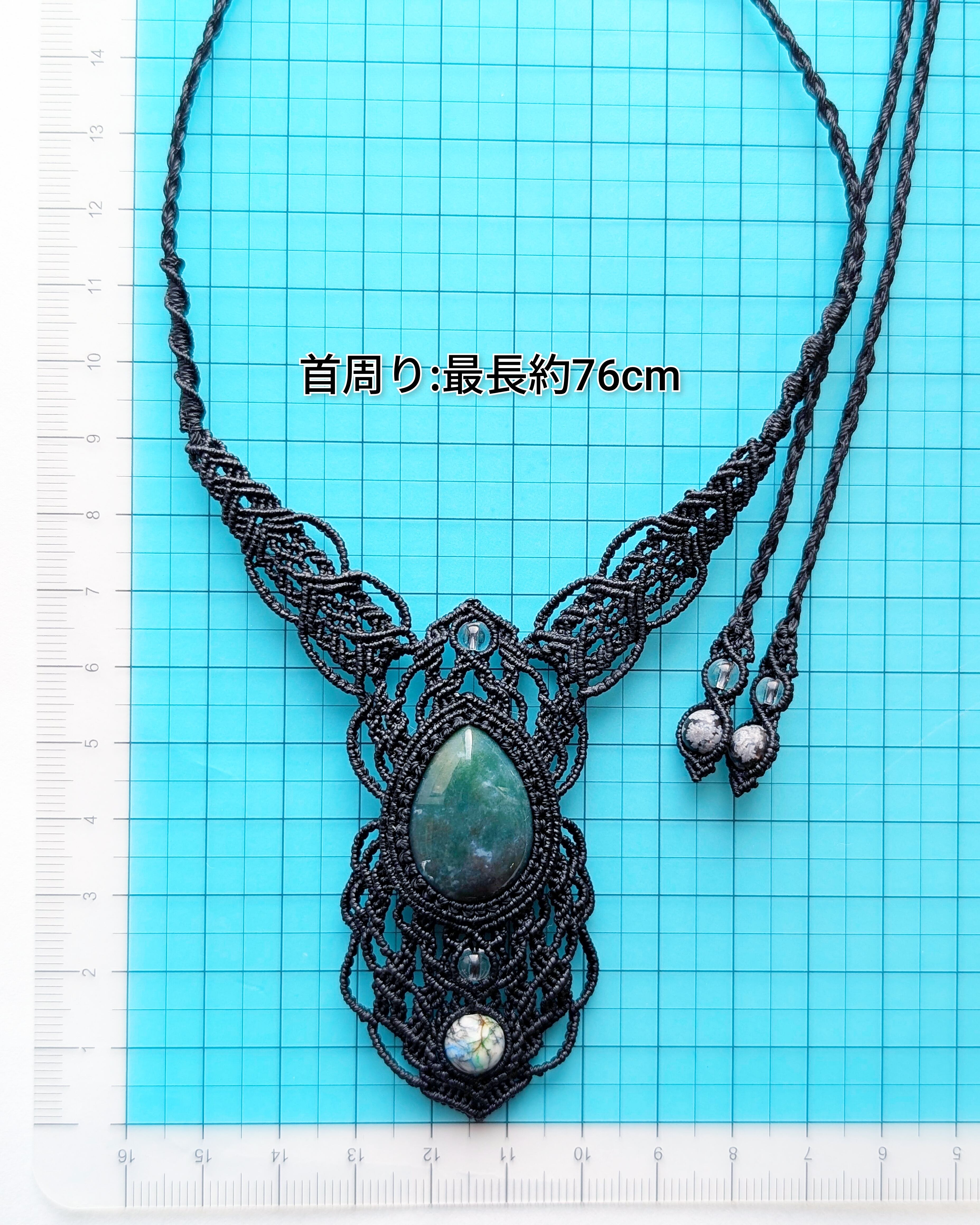 ワックスコードで天然石を編み込んだマクラメペンダントです。