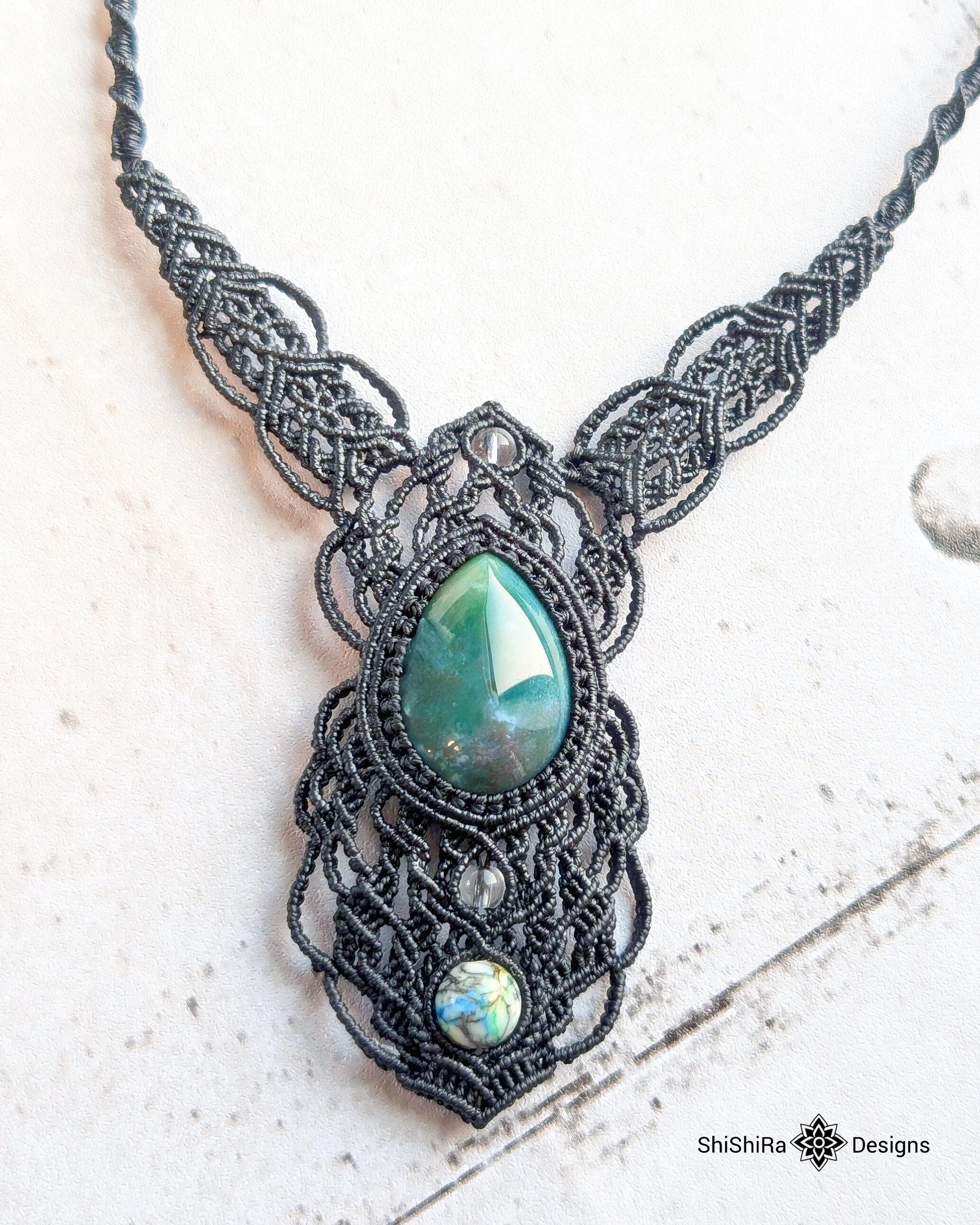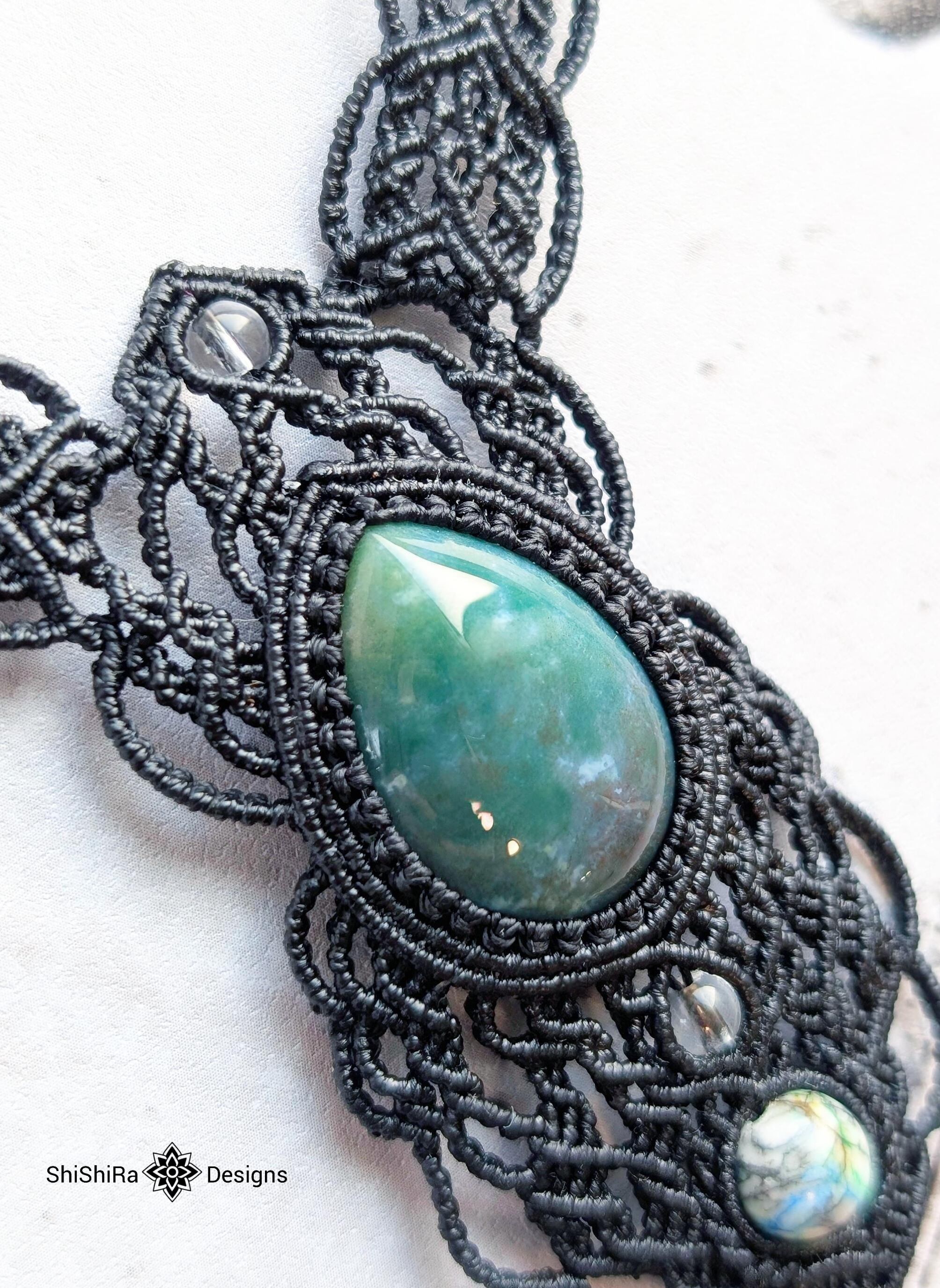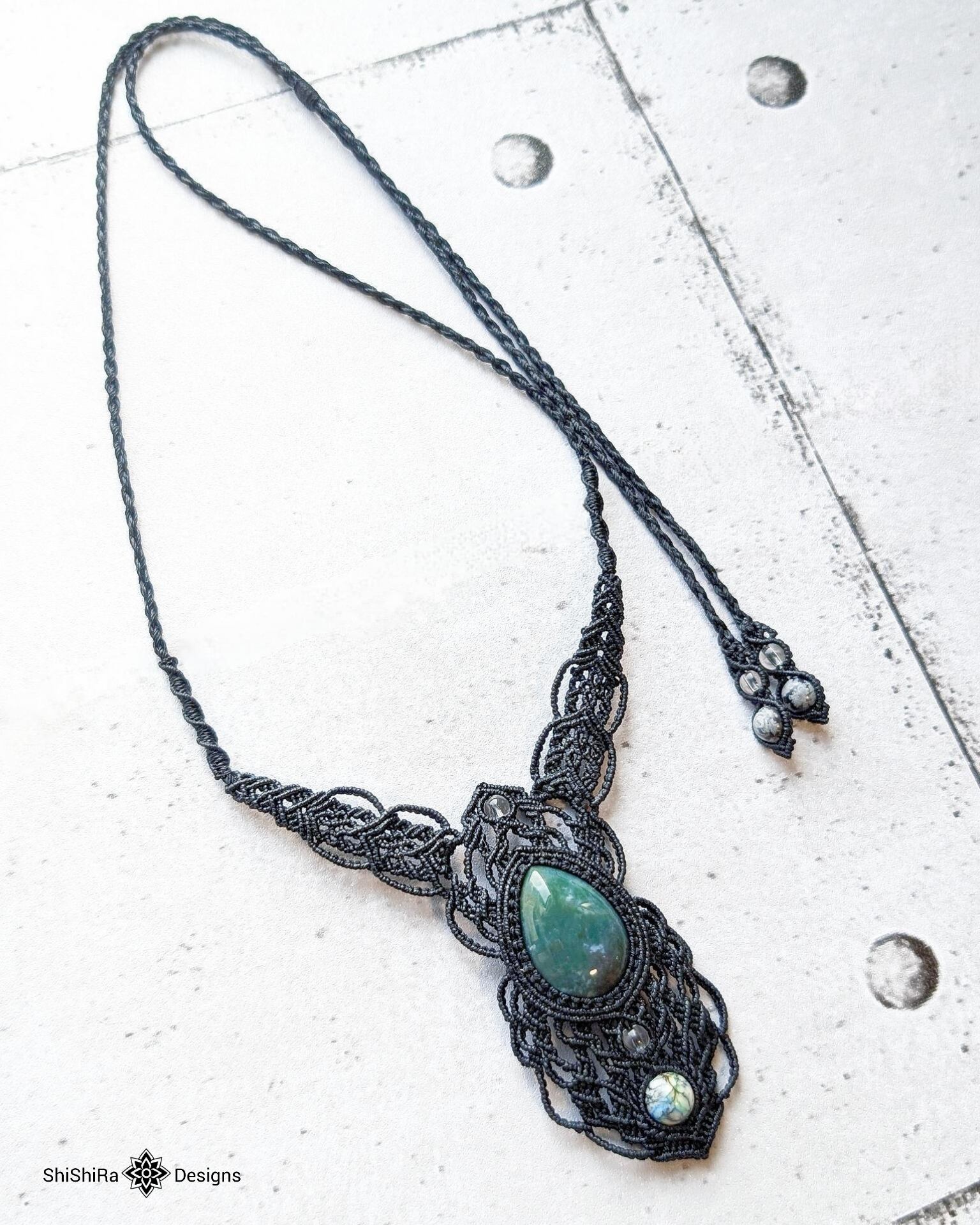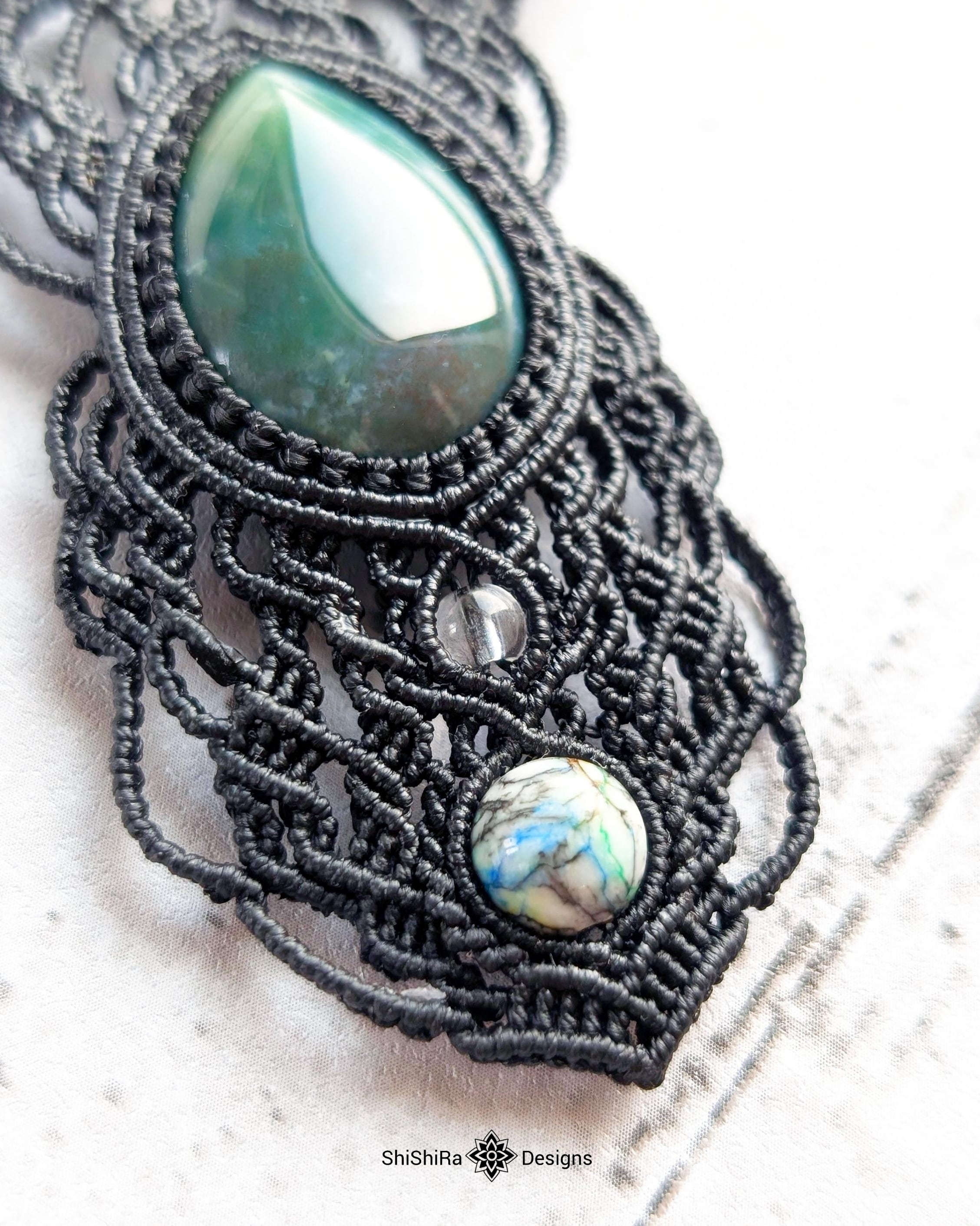 ワックスコードで天然石を編み込んだマクラメペンダントです。