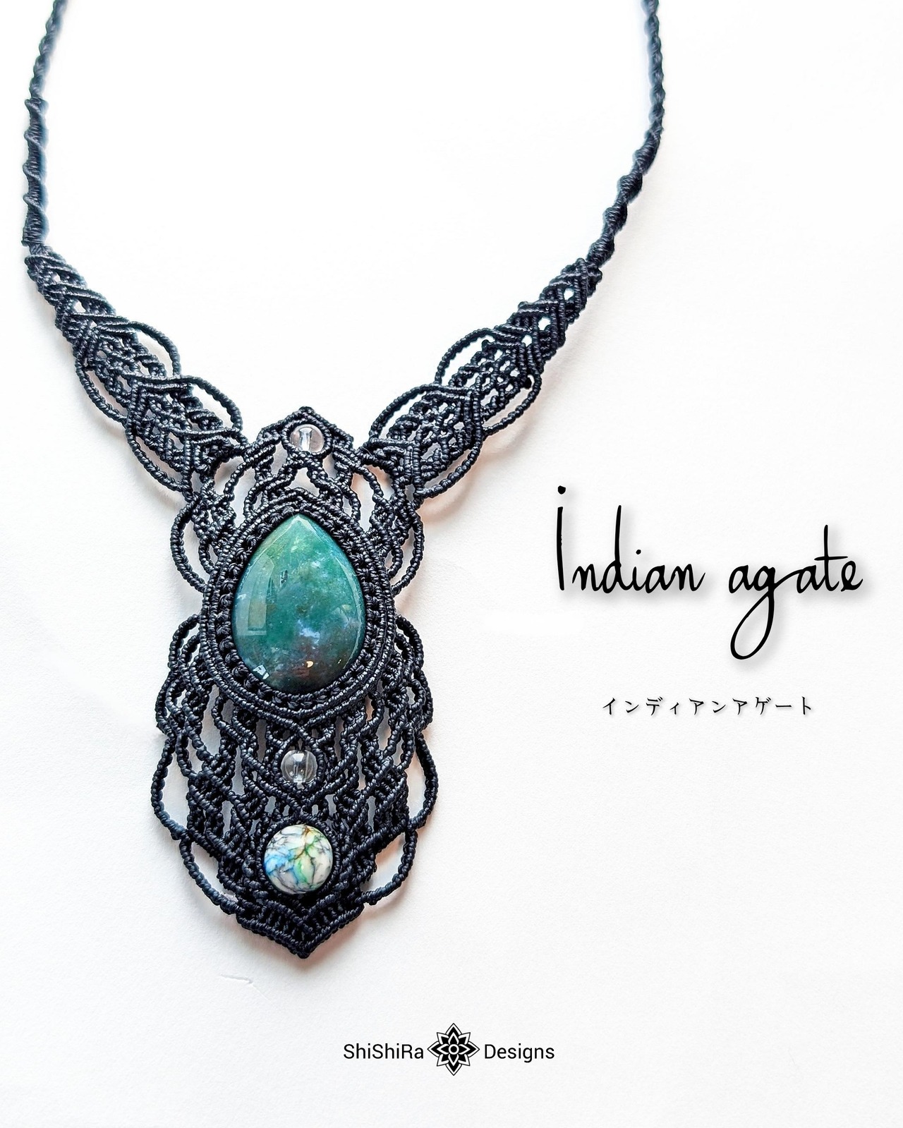 大地の息吹を感じる インディアンアゲートとアズライトインバライトのマクラメペンダント [金属アレルギー対応]