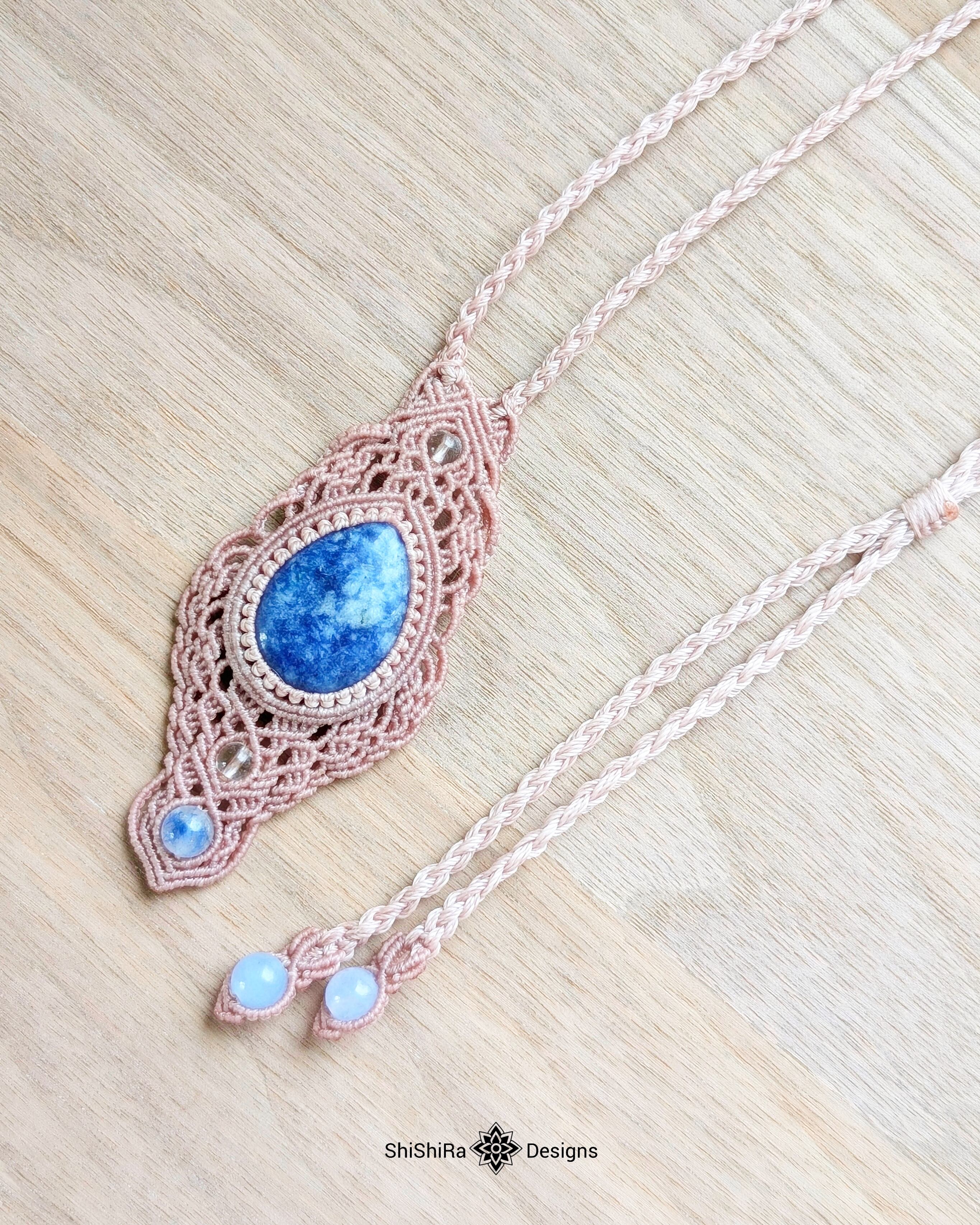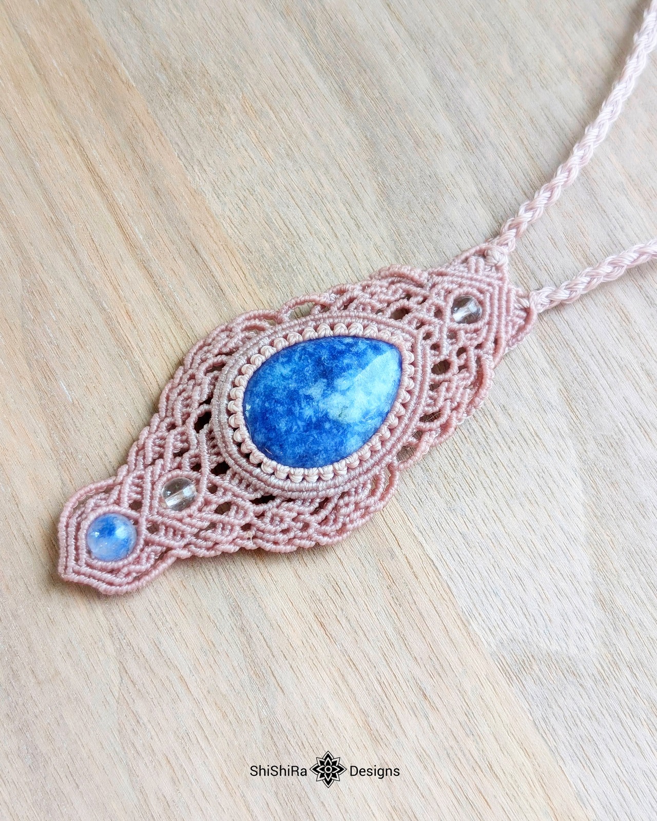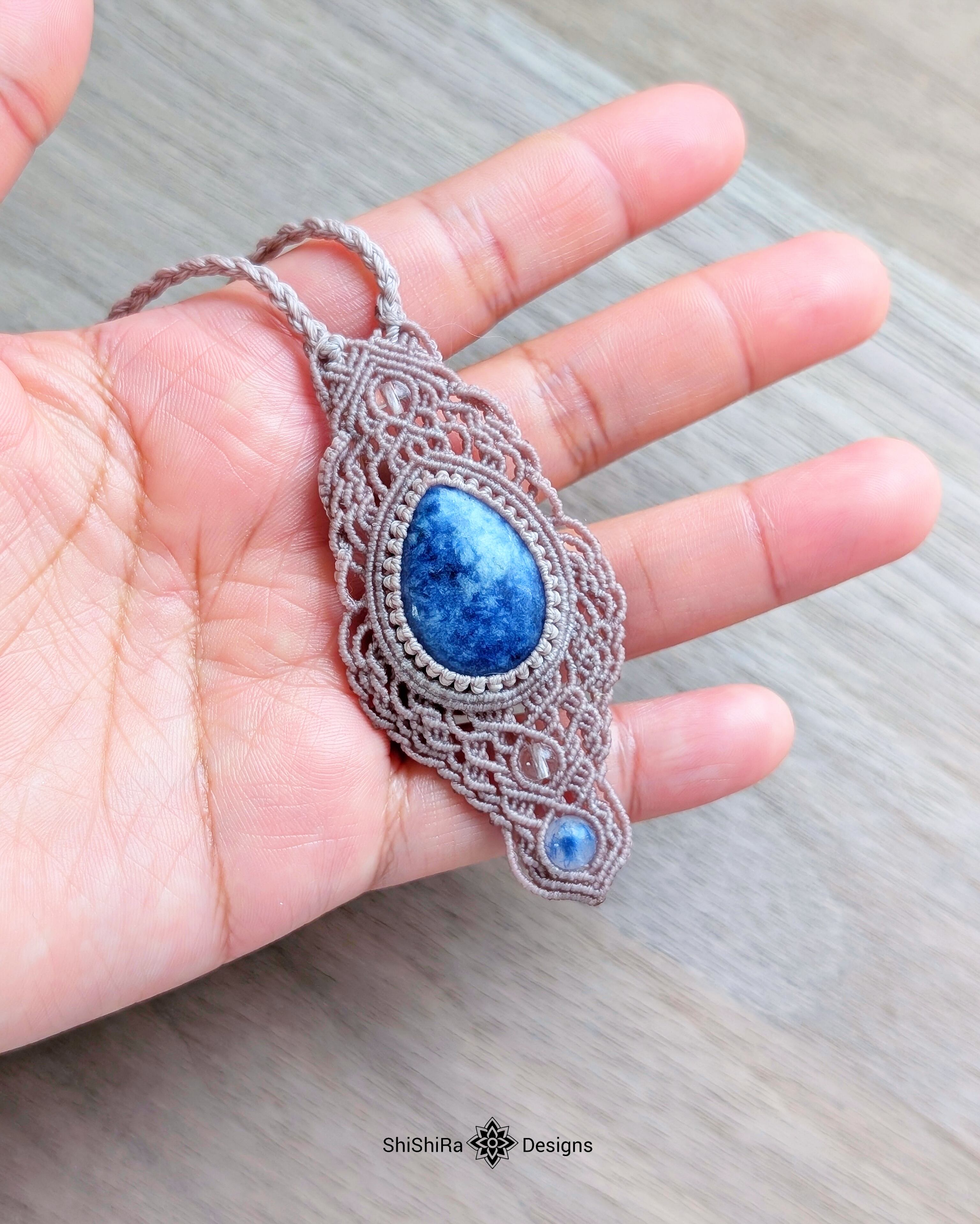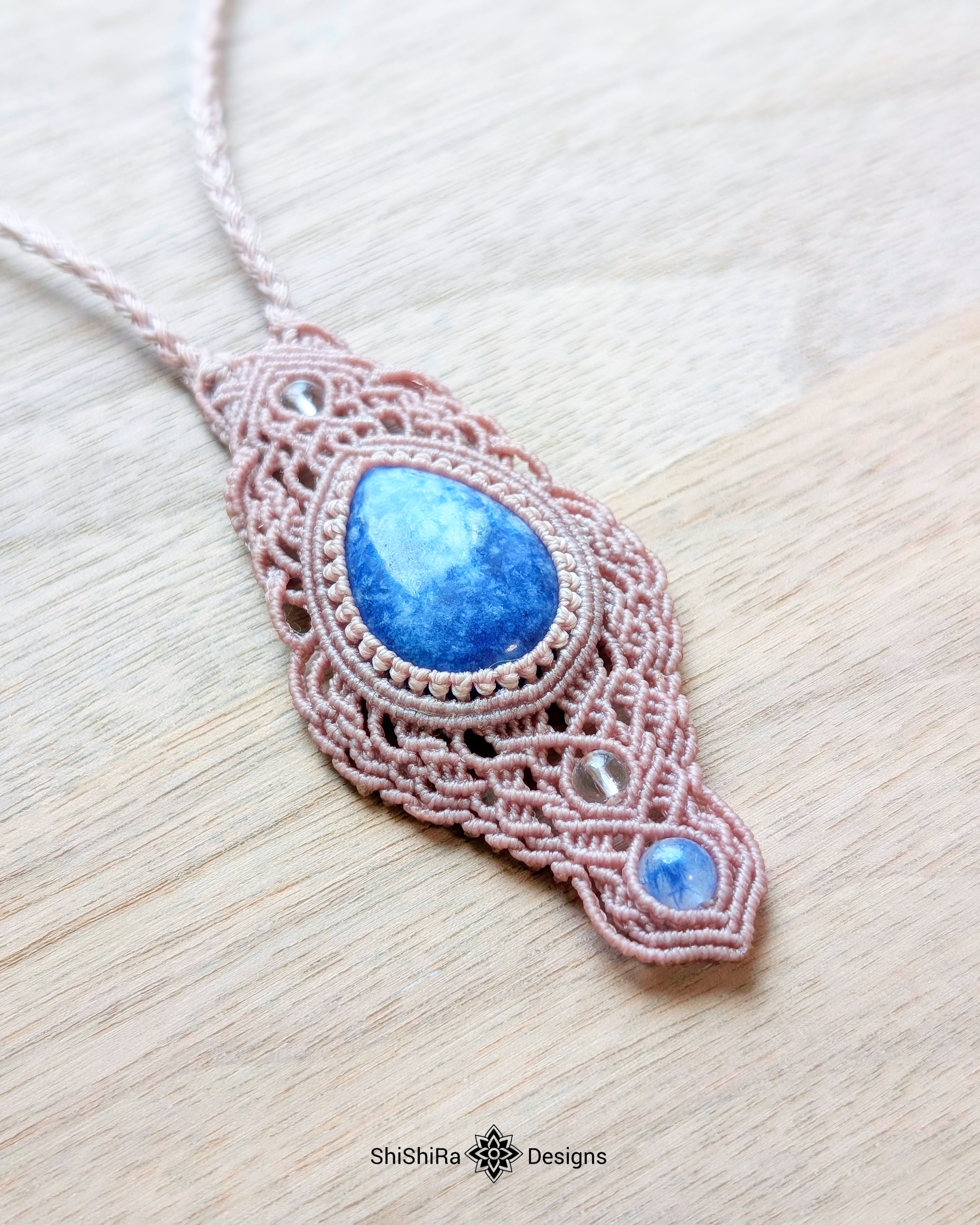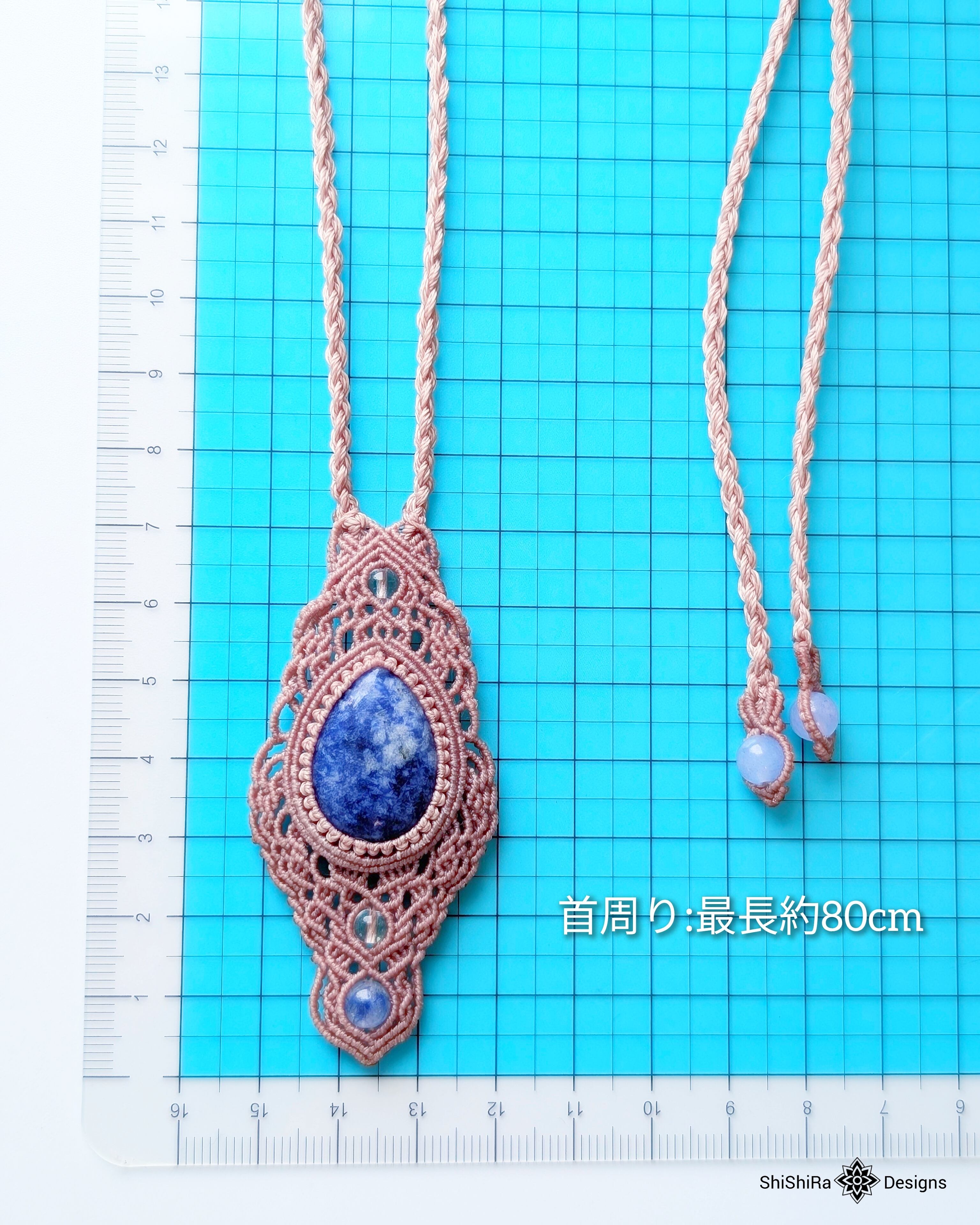 鮮やかなブルーが目を惹く、ドロップ型ソーダライトの一点物マクラメペンダントです。