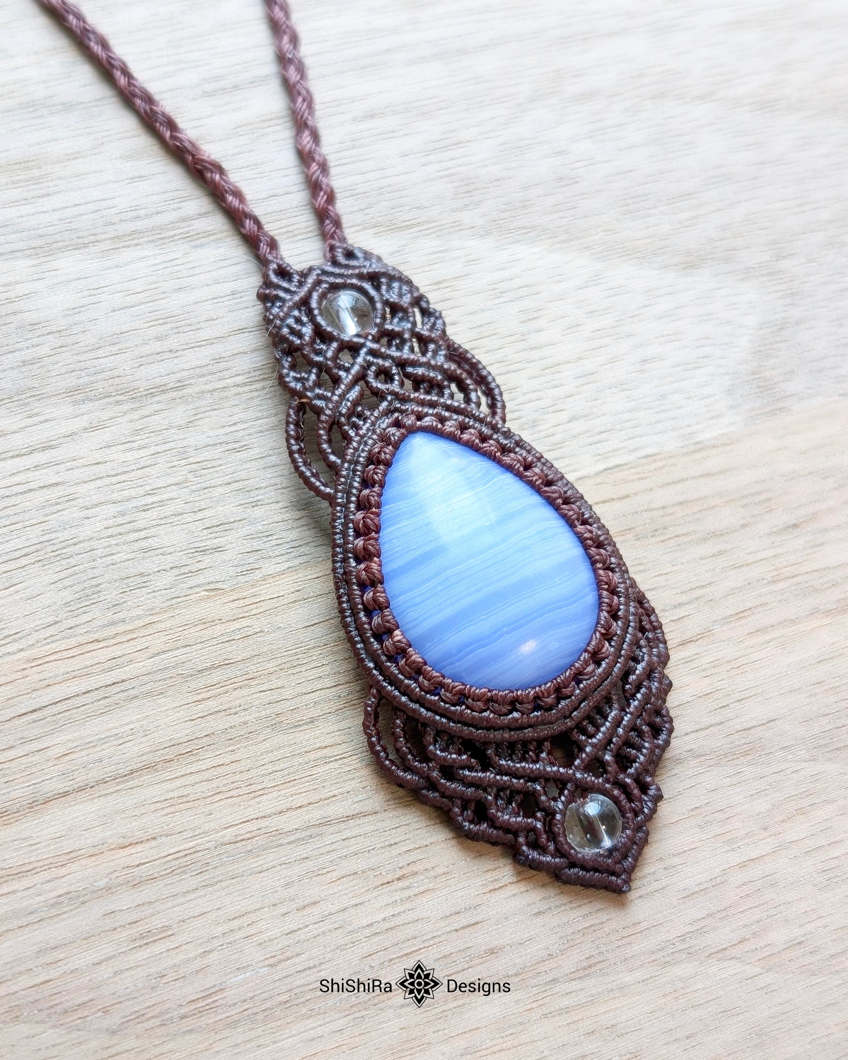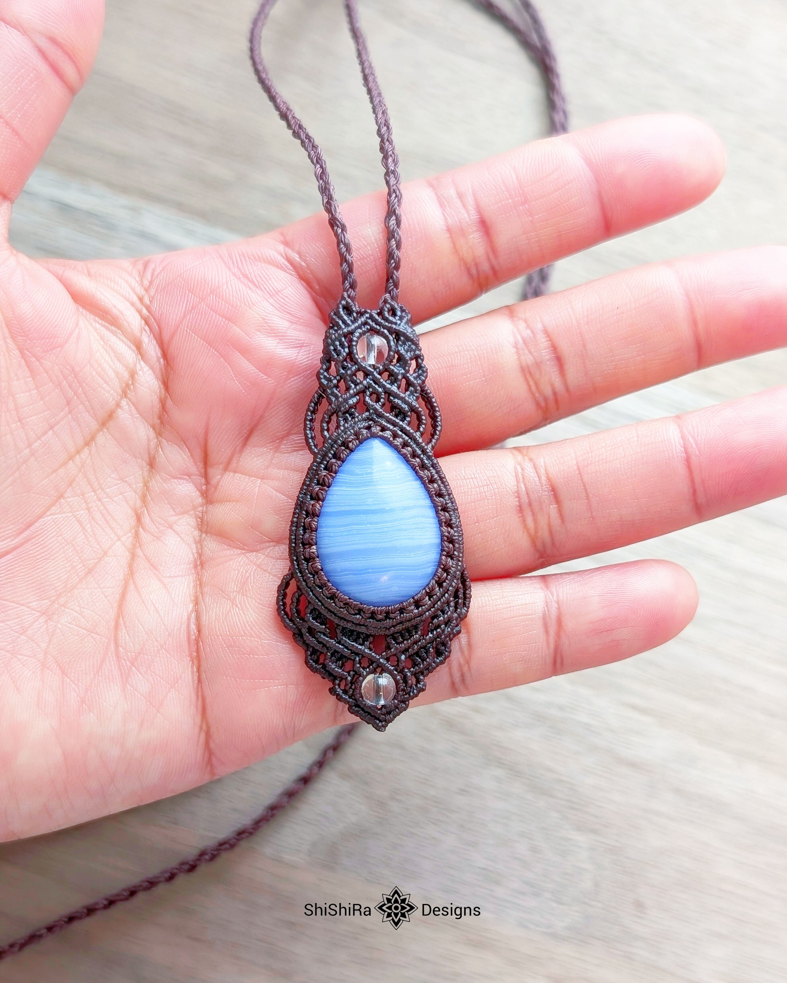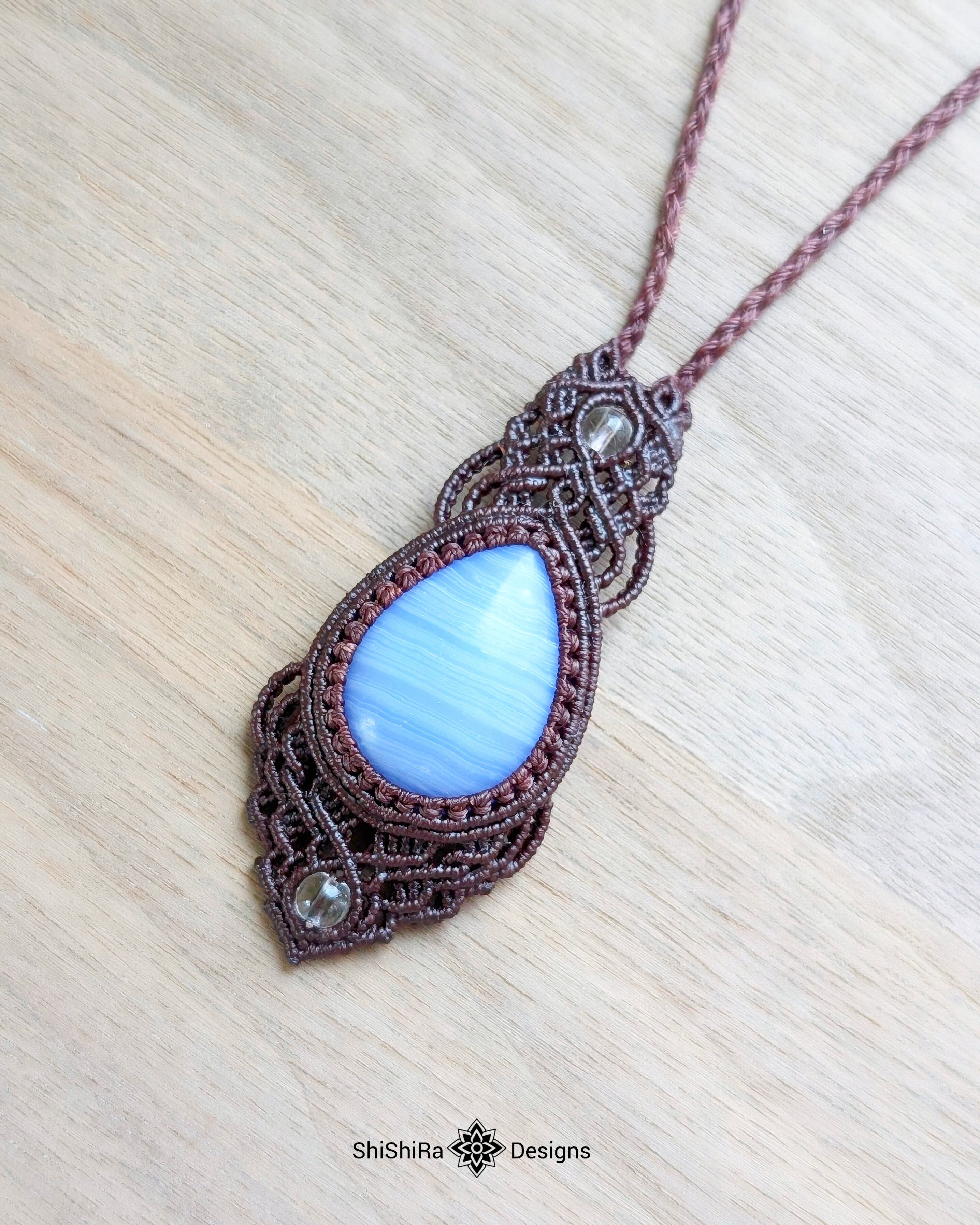 清らかな水面のようなブルーレースアゲートのマクラメペンダント。