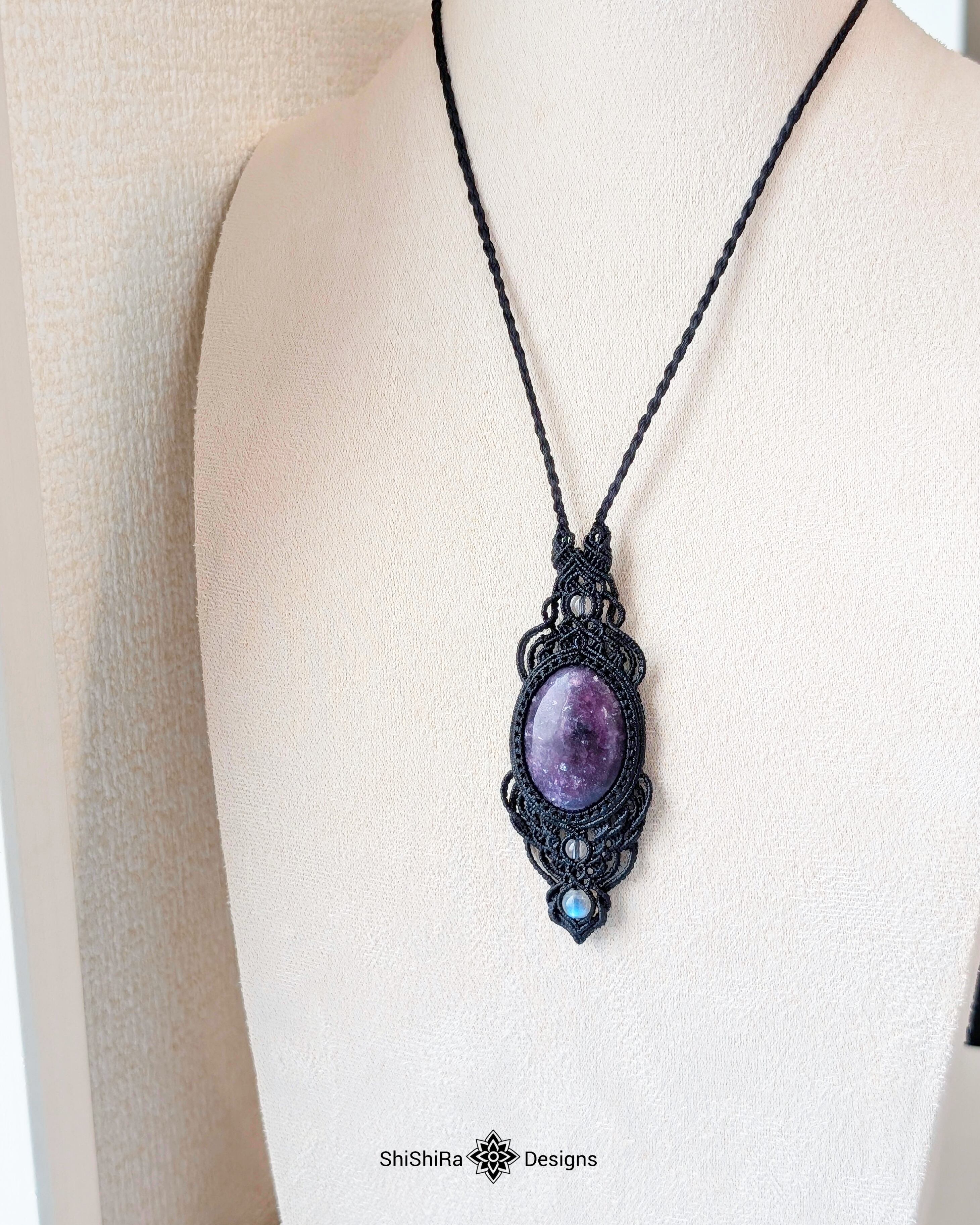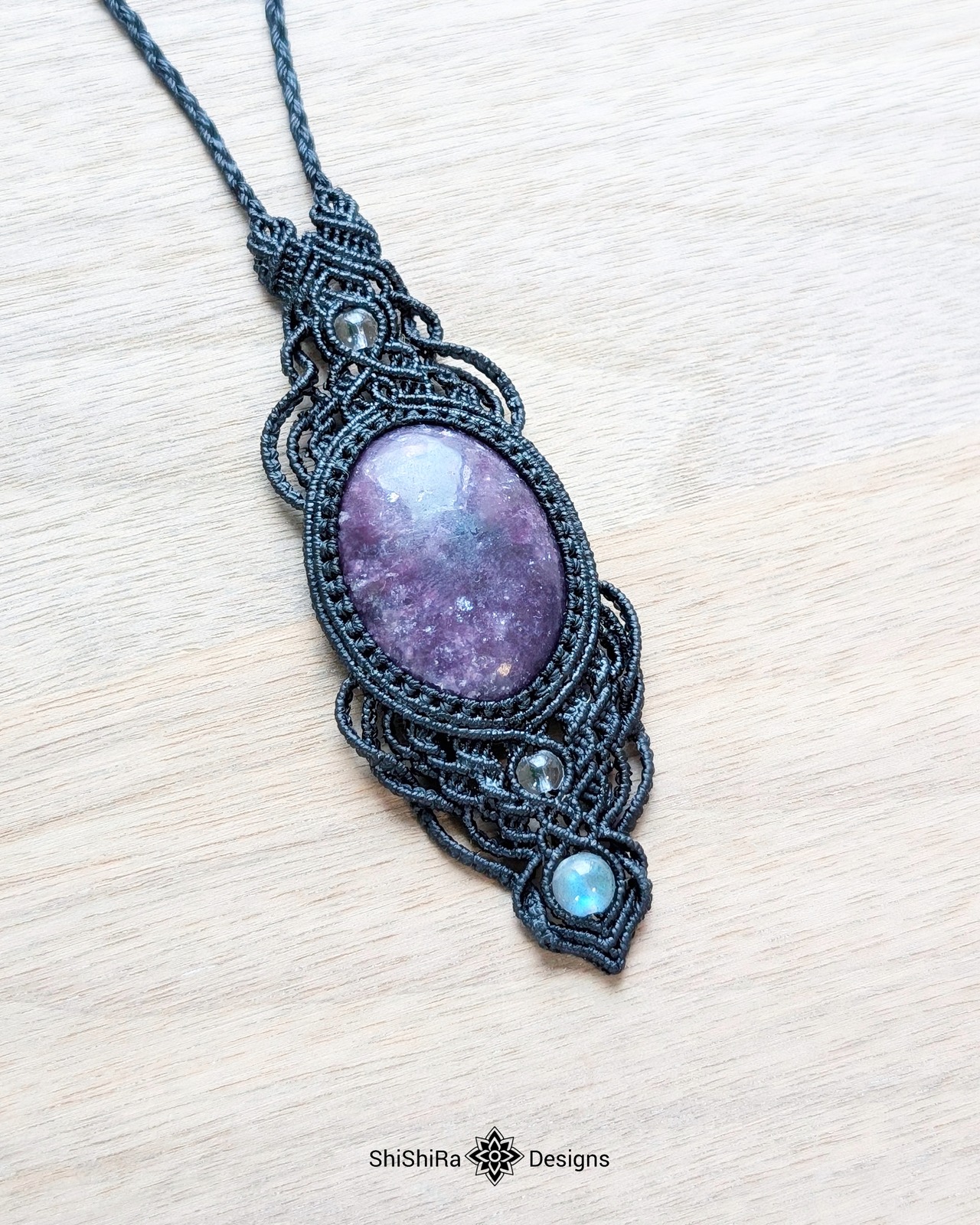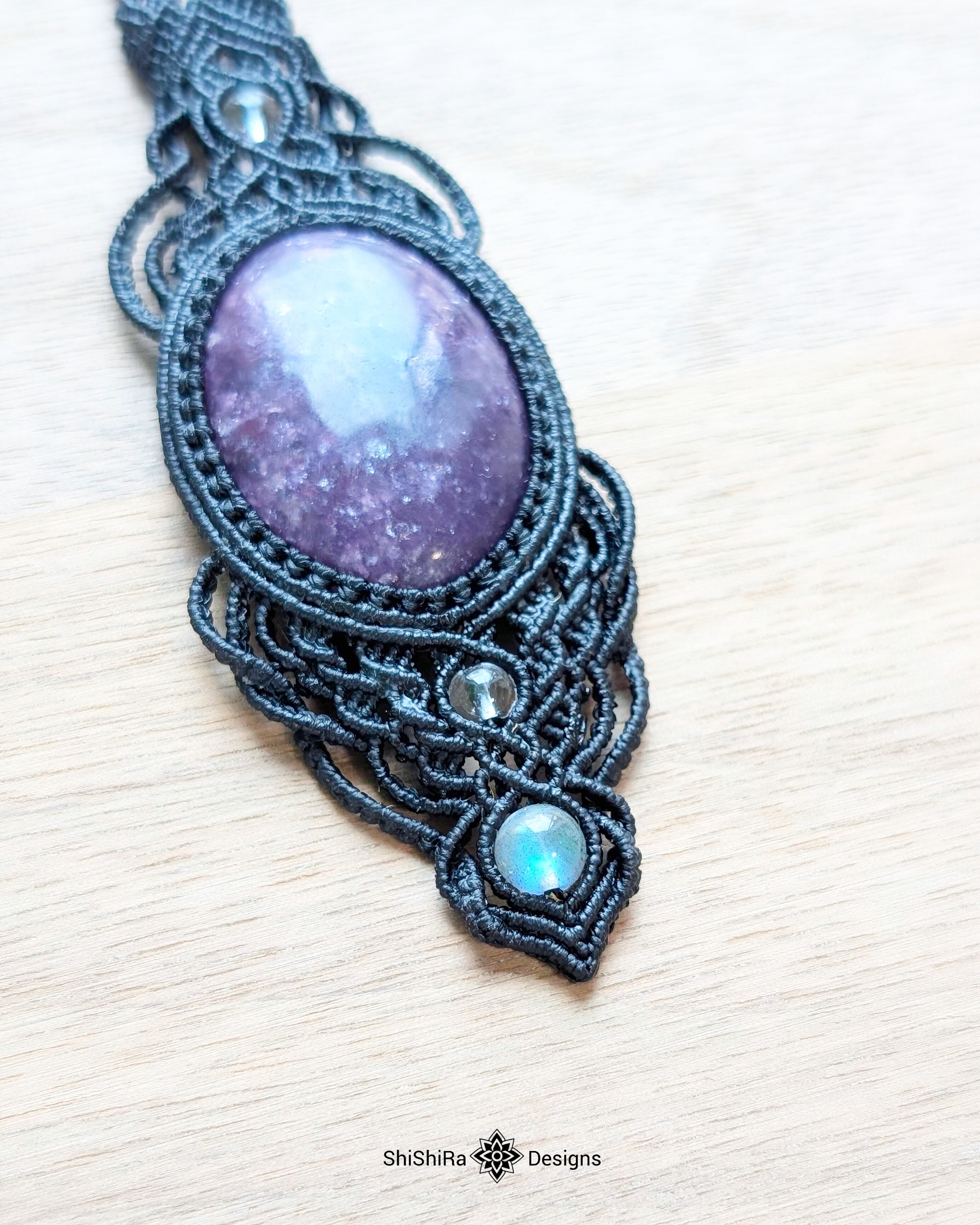 心身のバランスを整える レピドライトとラブラドライトのマクラメペンダント [金属アレルギー対応]