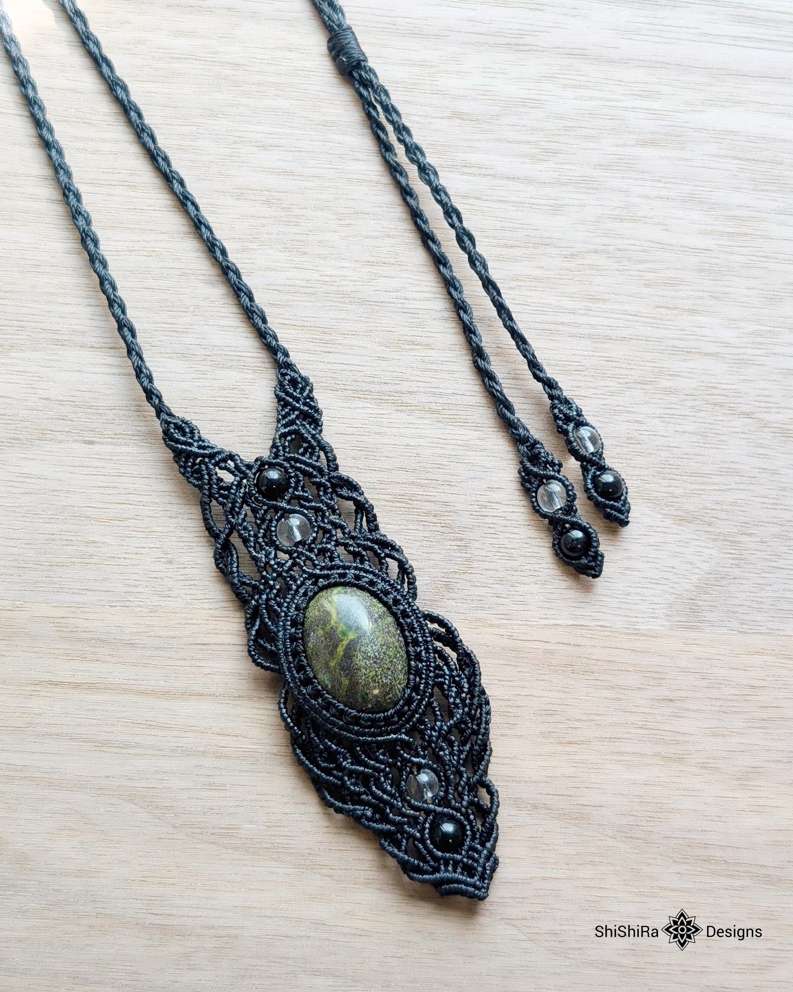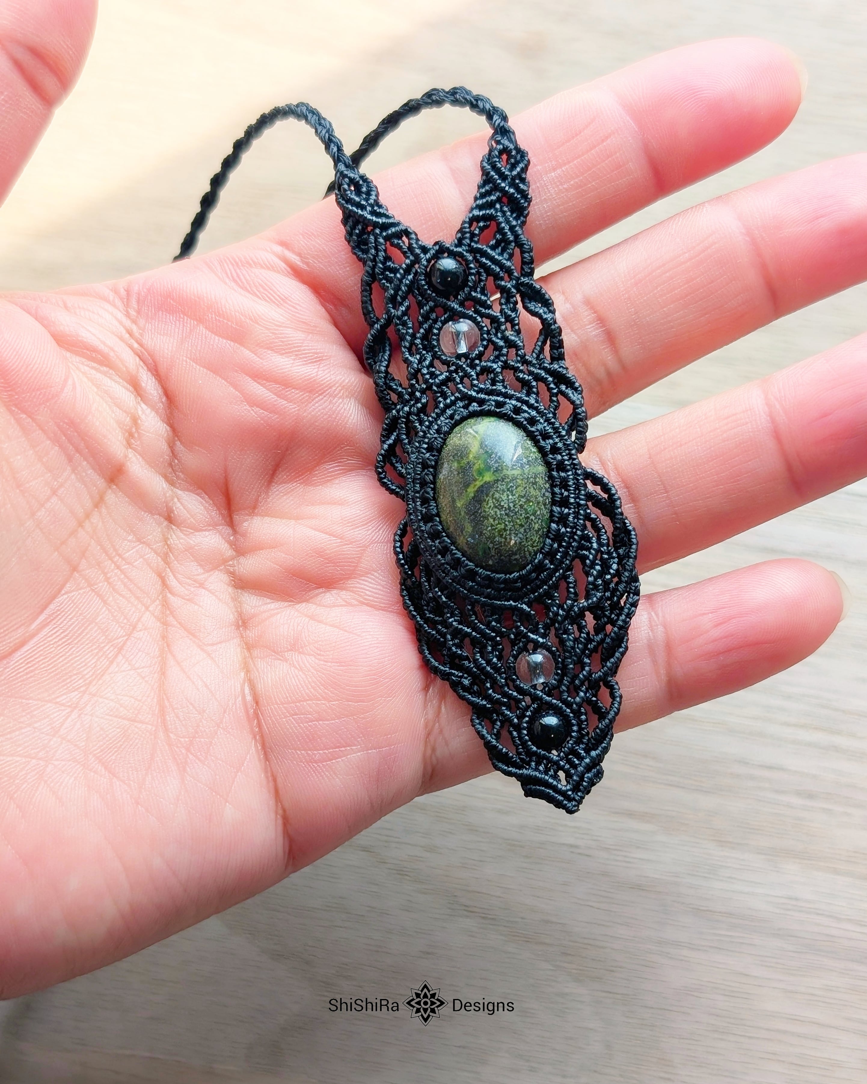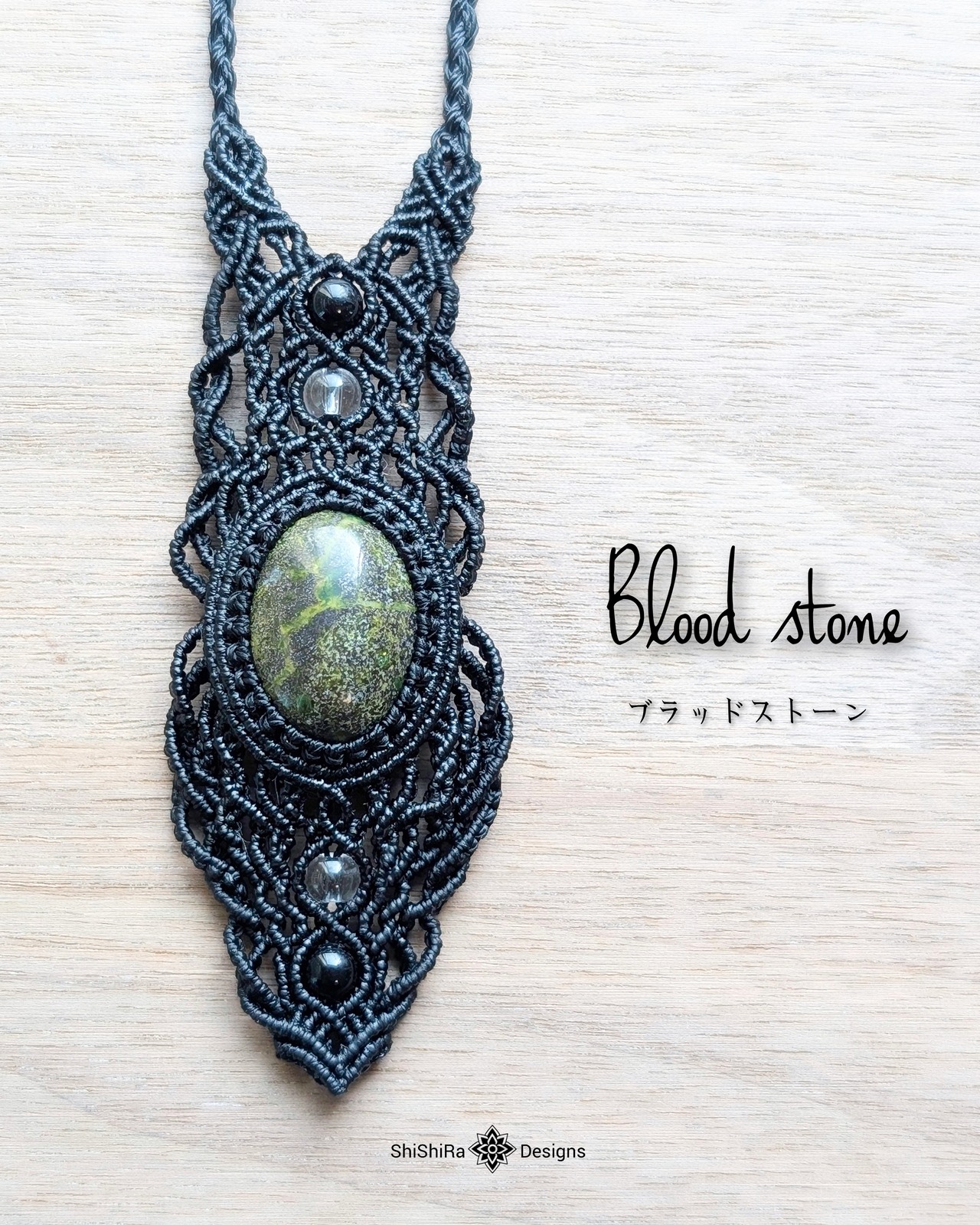 まるで森の奥深くでひっそりと息づく、自然の神秘を閉じかめたかのようなブラッドストーンをマクラメ編みで丁寧に編み込みました。