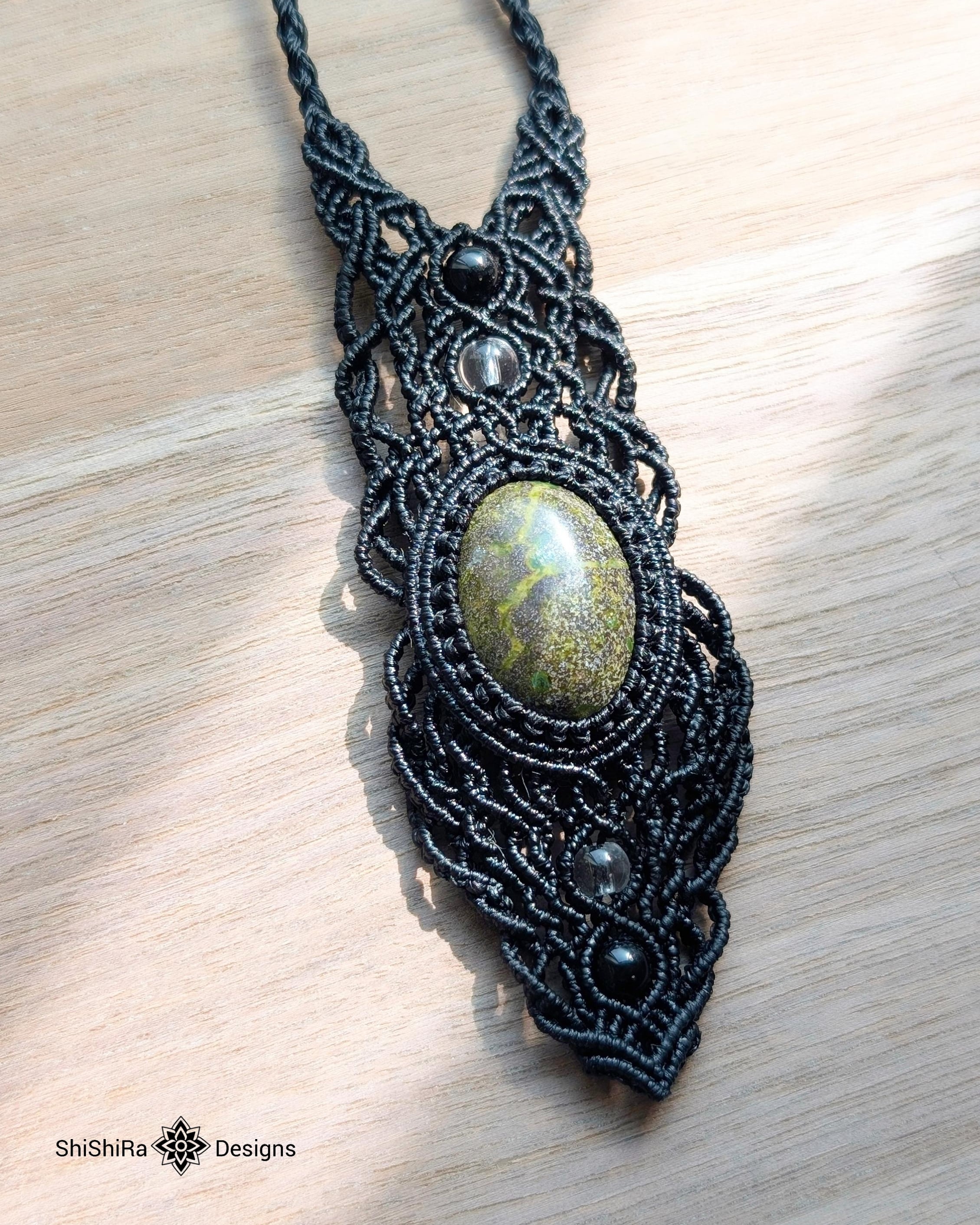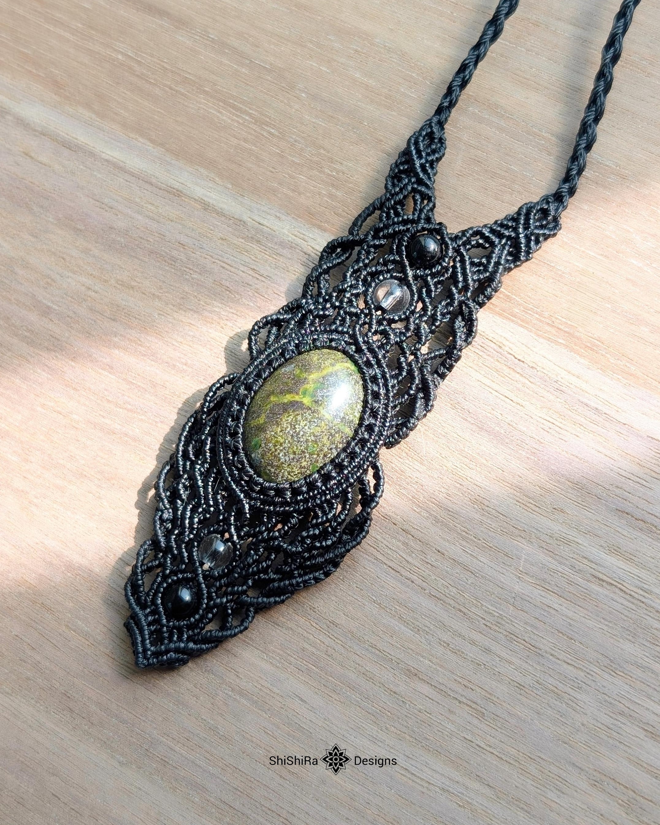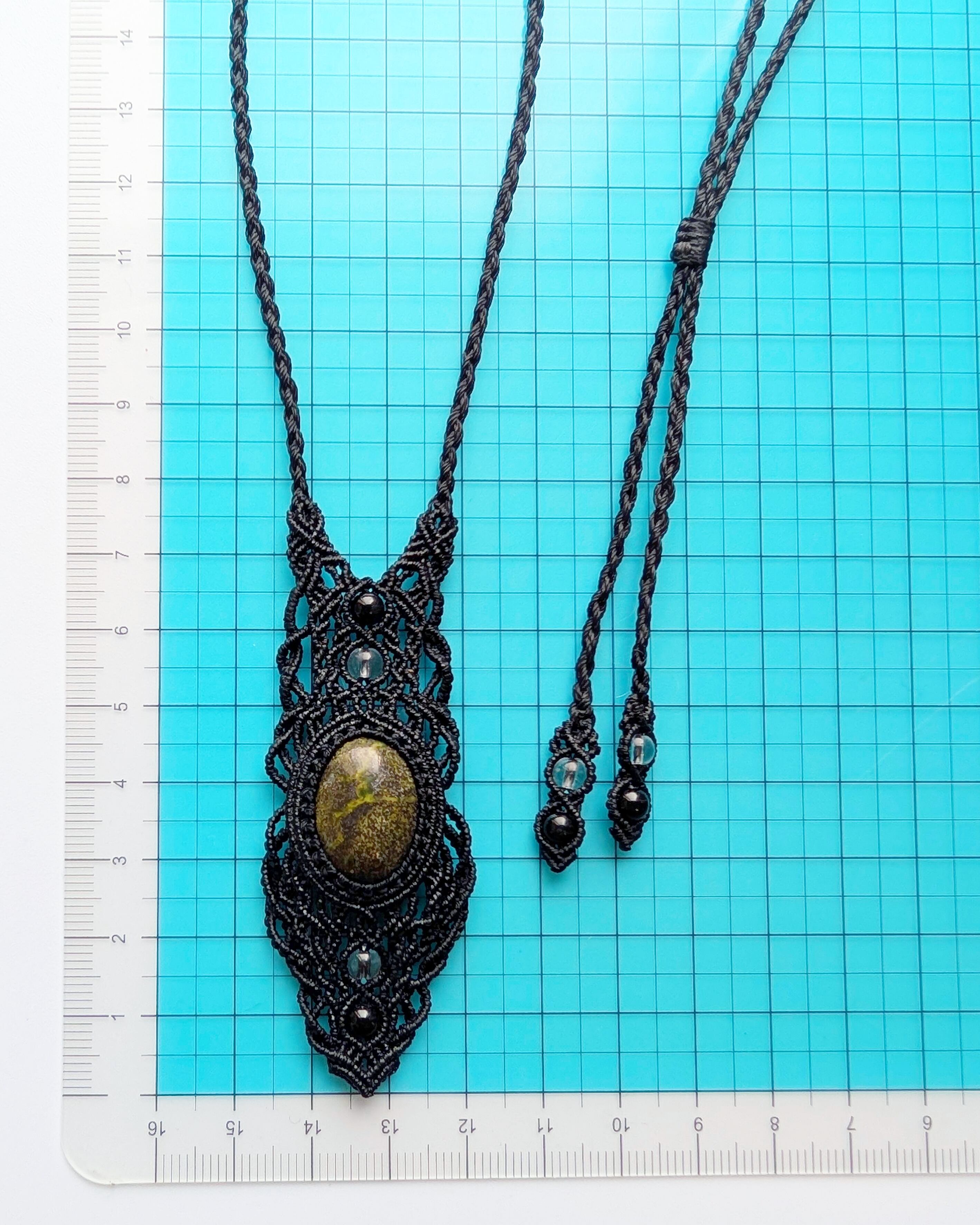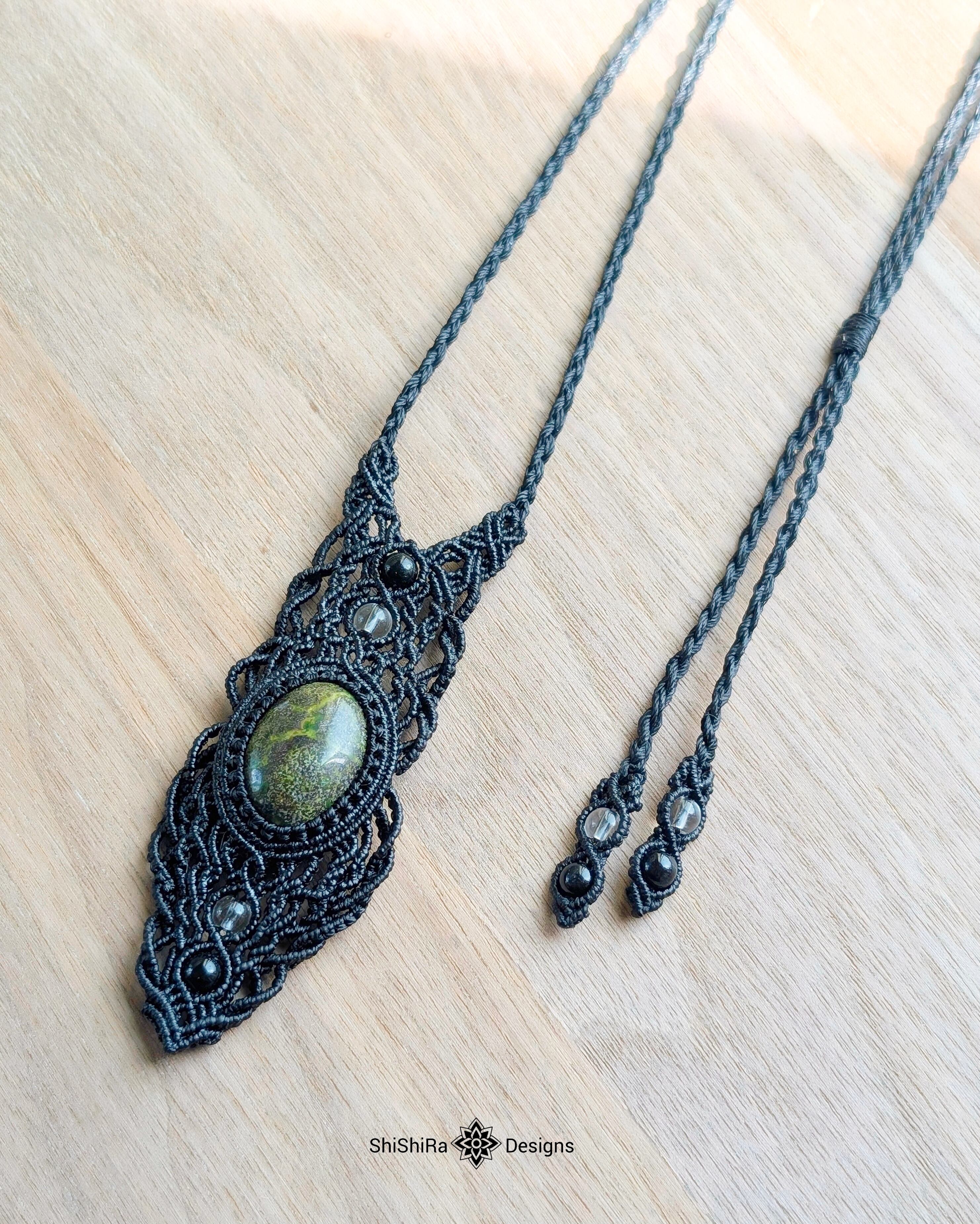 まるで森の奥深くでひっそりと息づく、自然の神秘を閉じかめたかのようなブラッドストーンをマクラメ編みで丁寧に編み込みました。