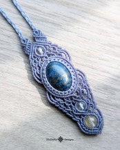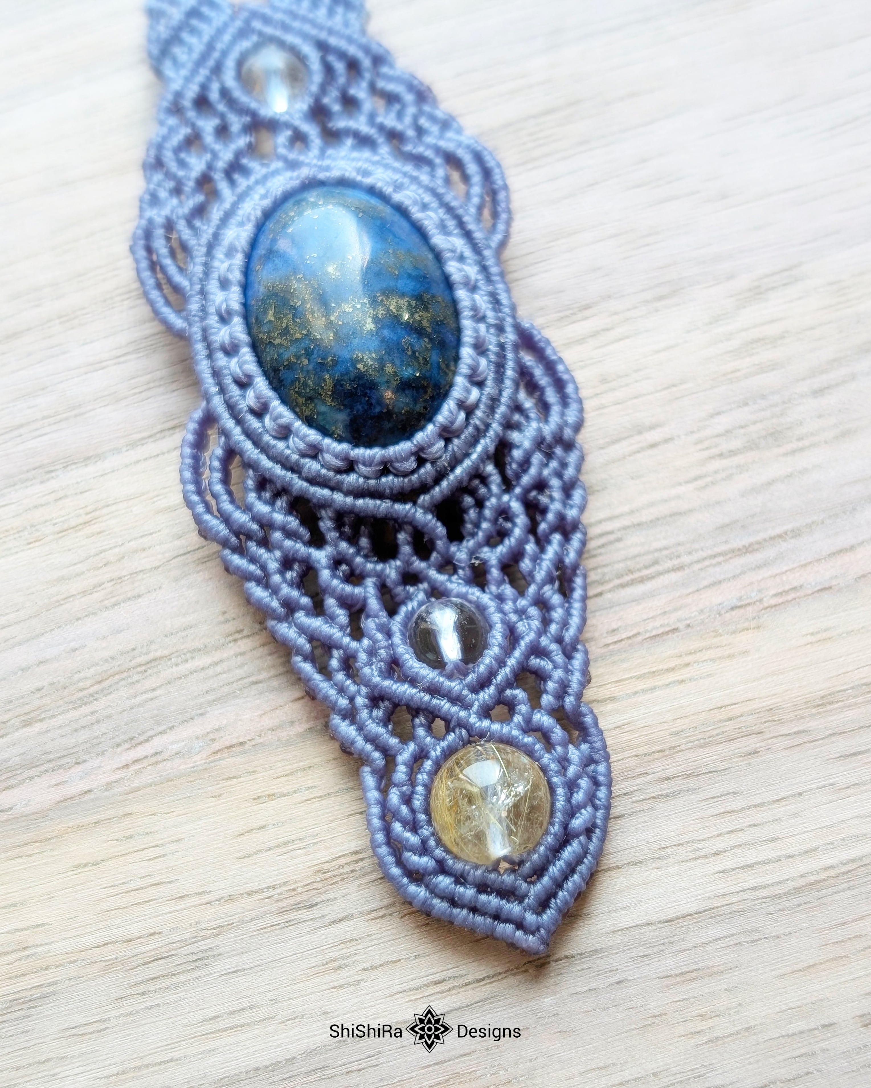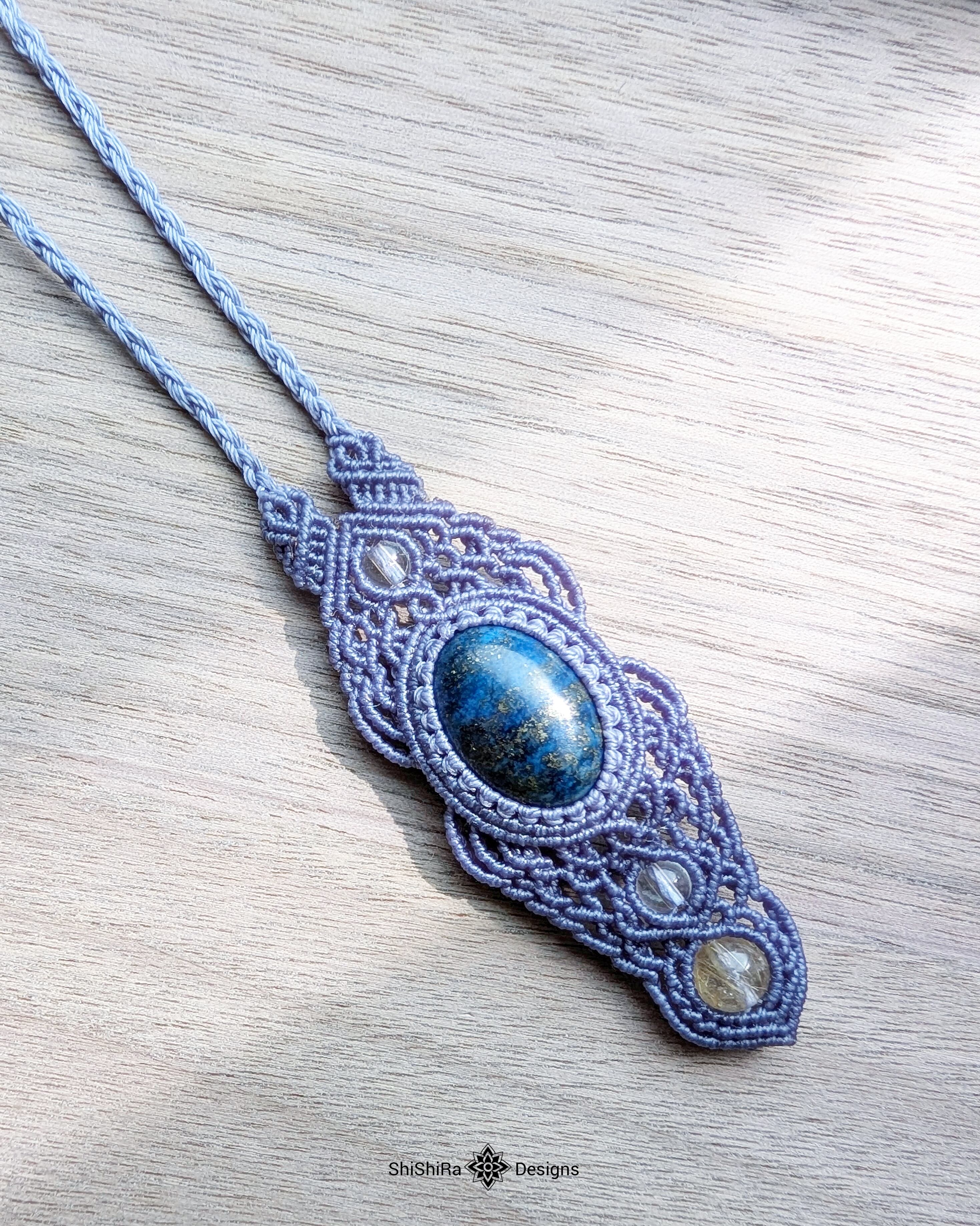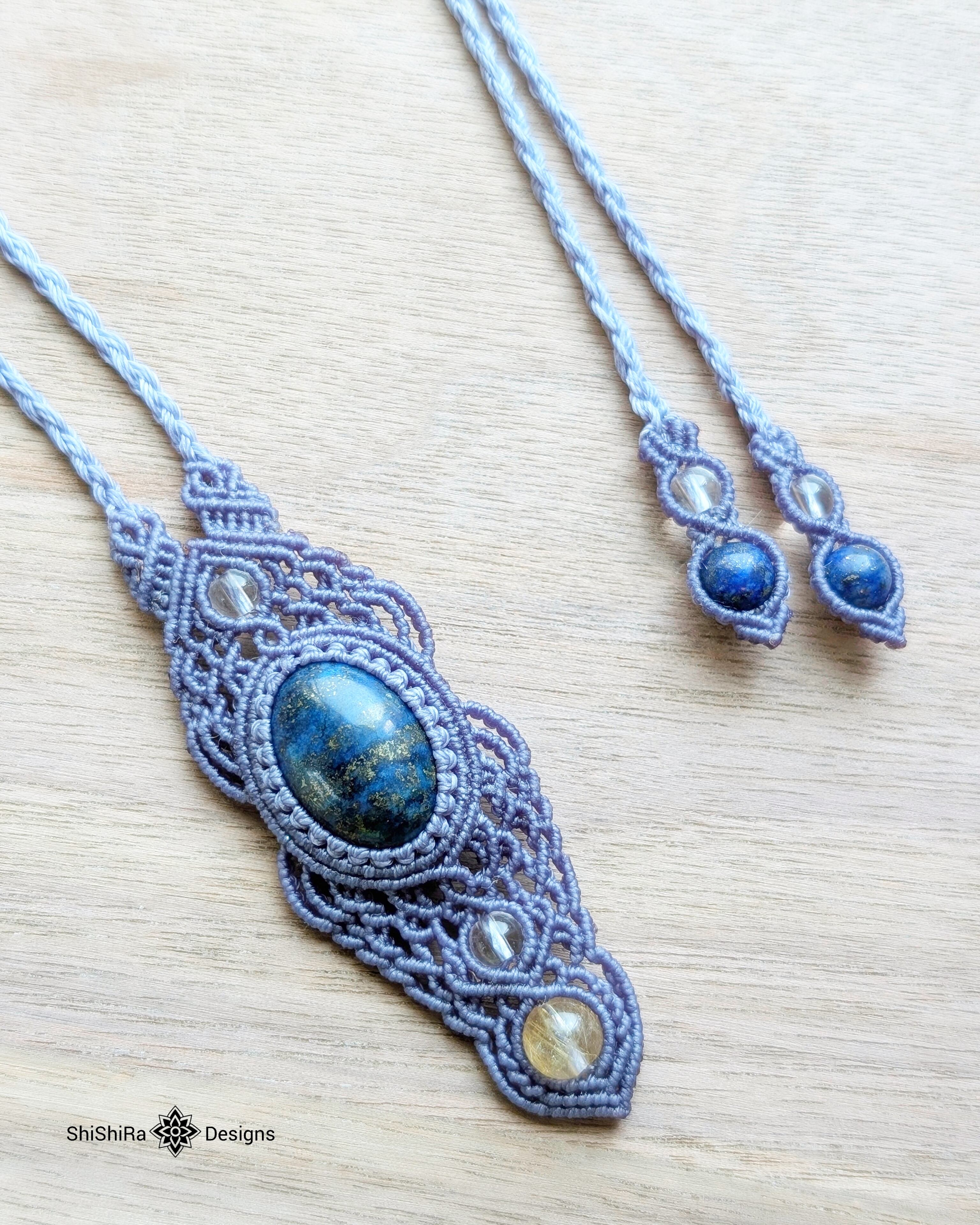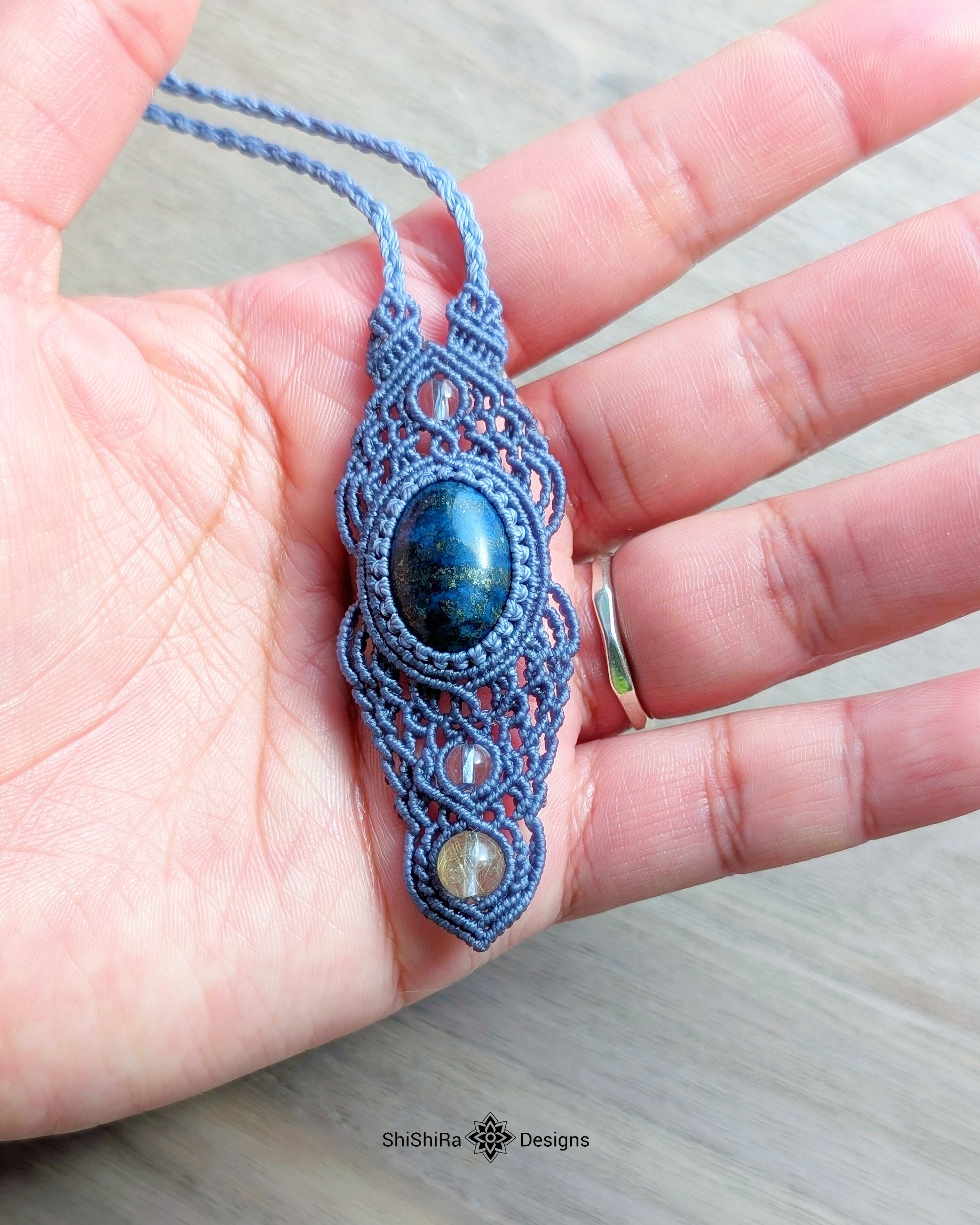 パイライトたっぷりのラピスラズリと針たっぷりのルチルクォーツを編み込んだマクラメペンダントです。