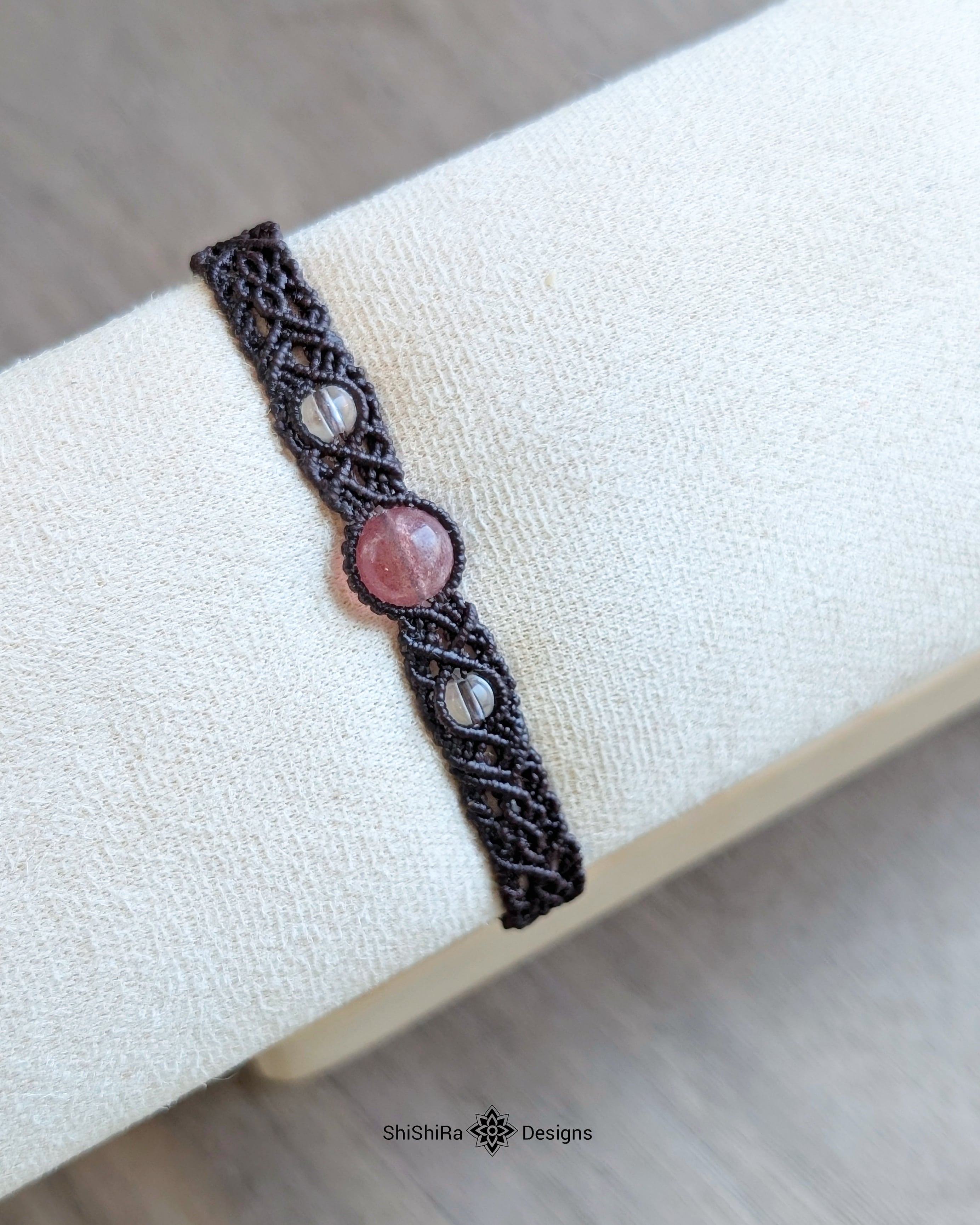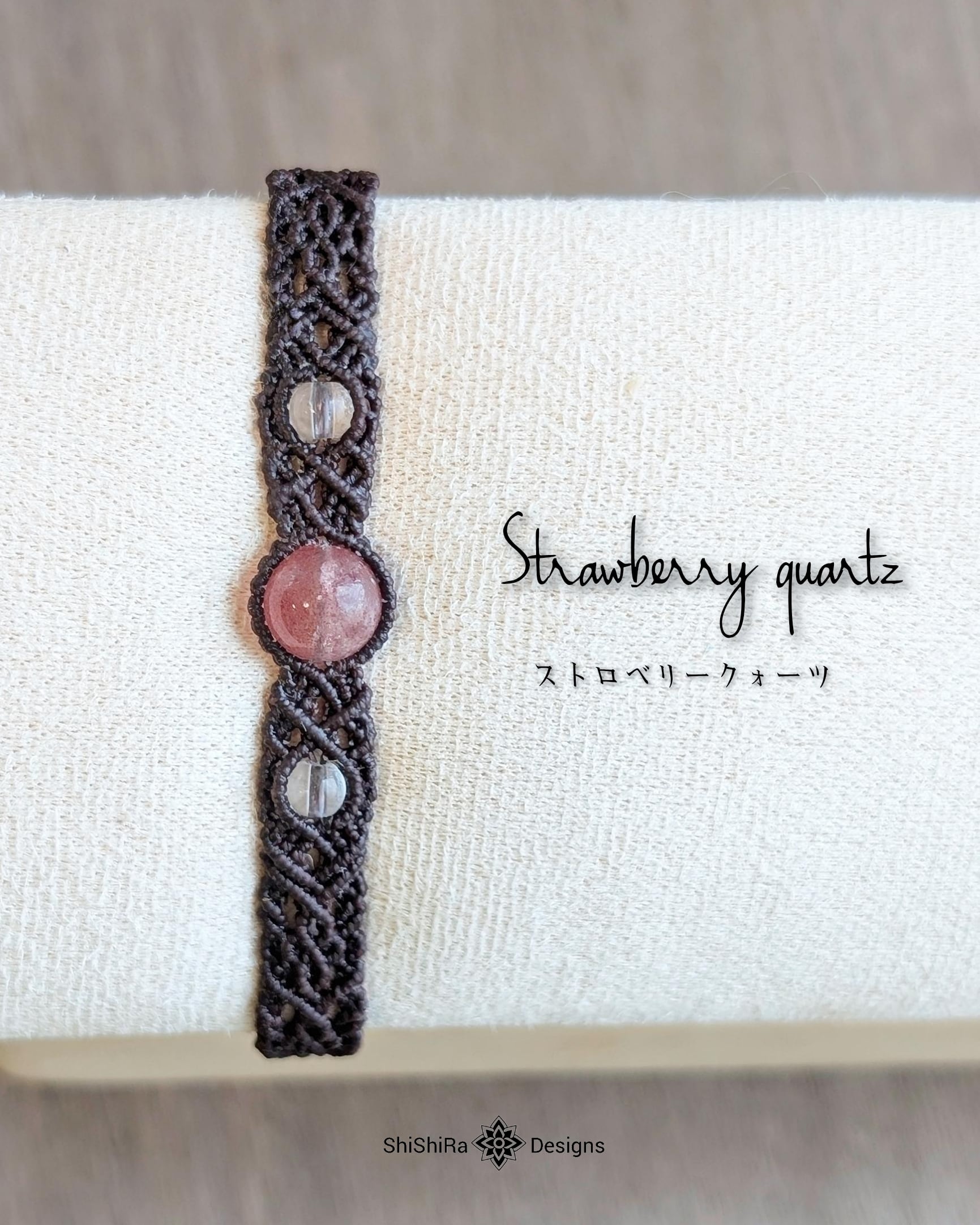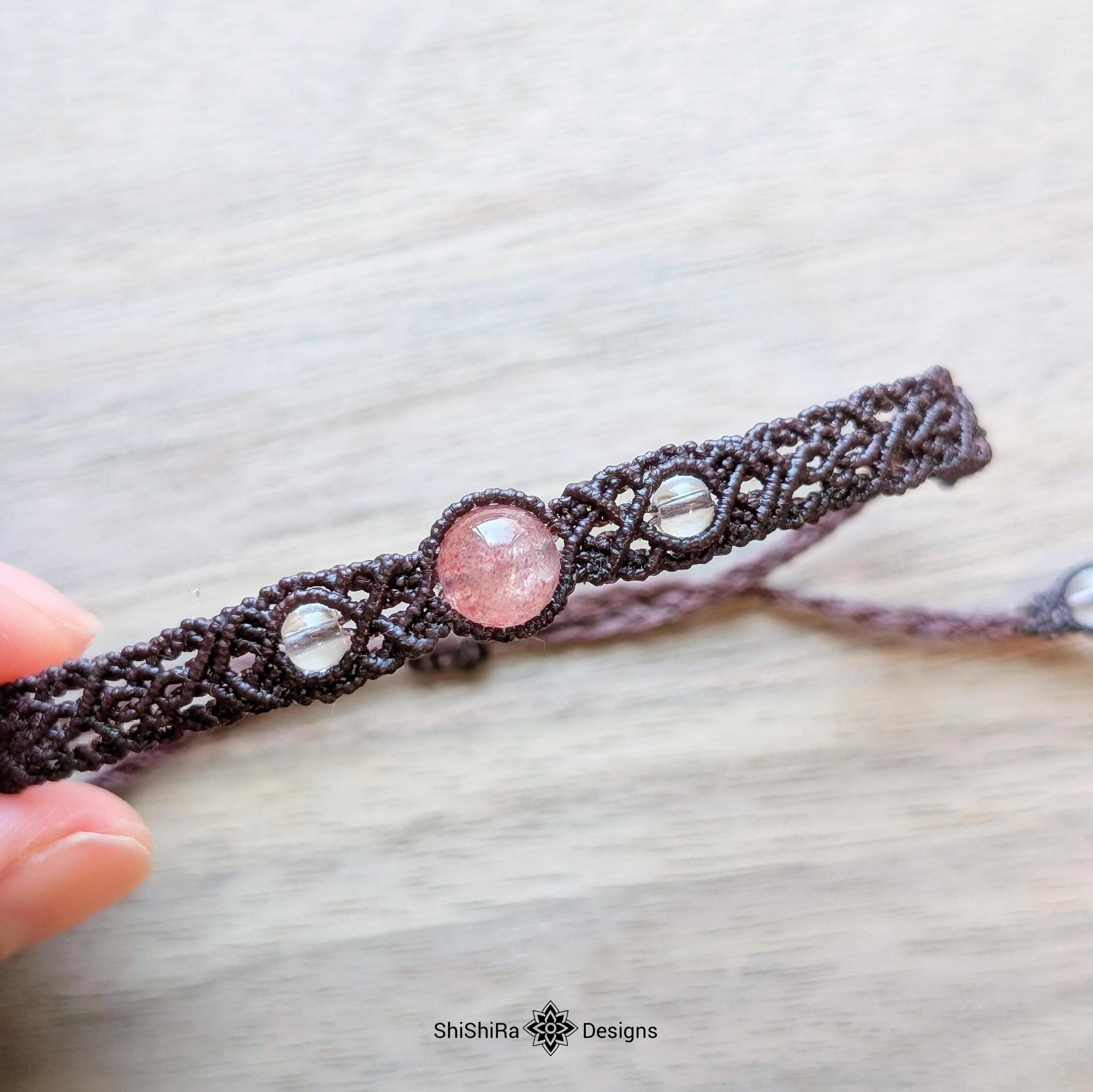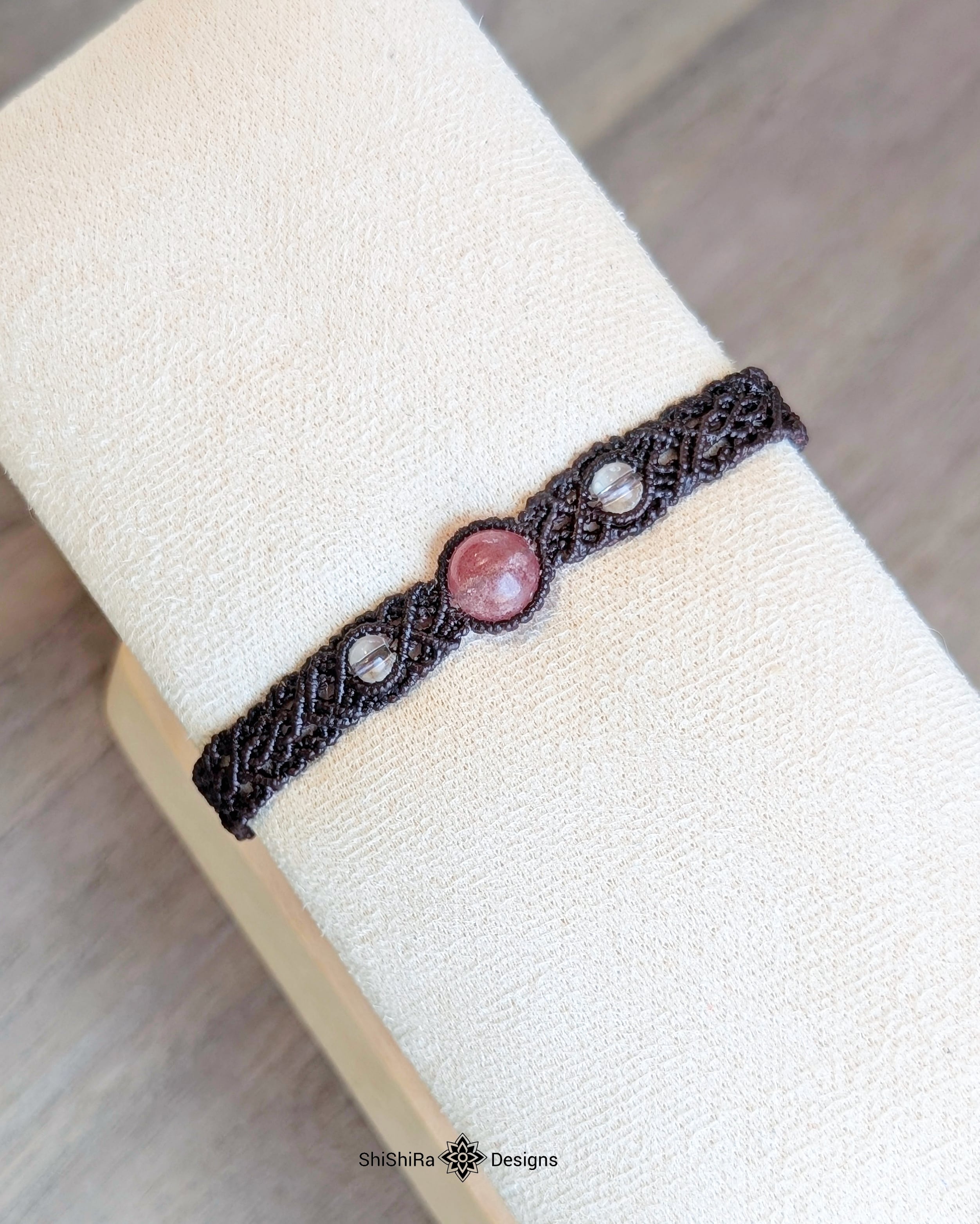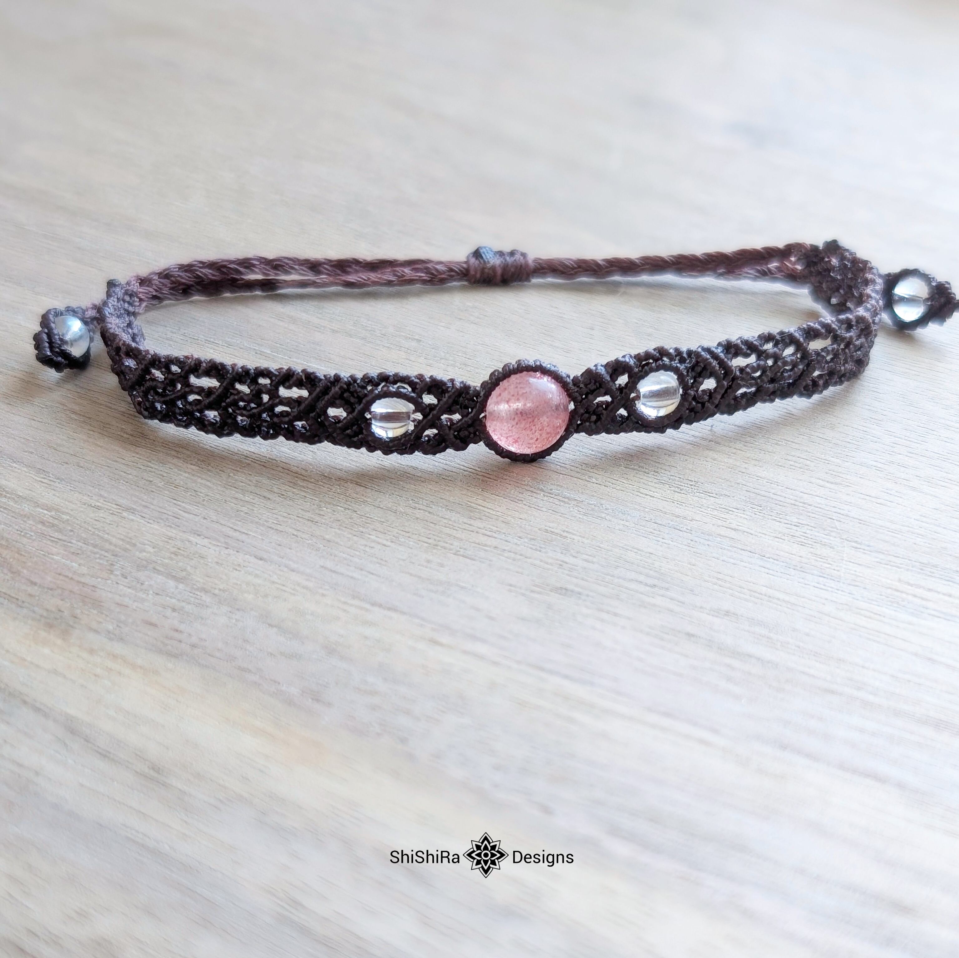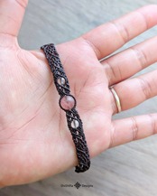 こちらはストロベリークォーツをマクラメ編みで編みこんだブレスレットです