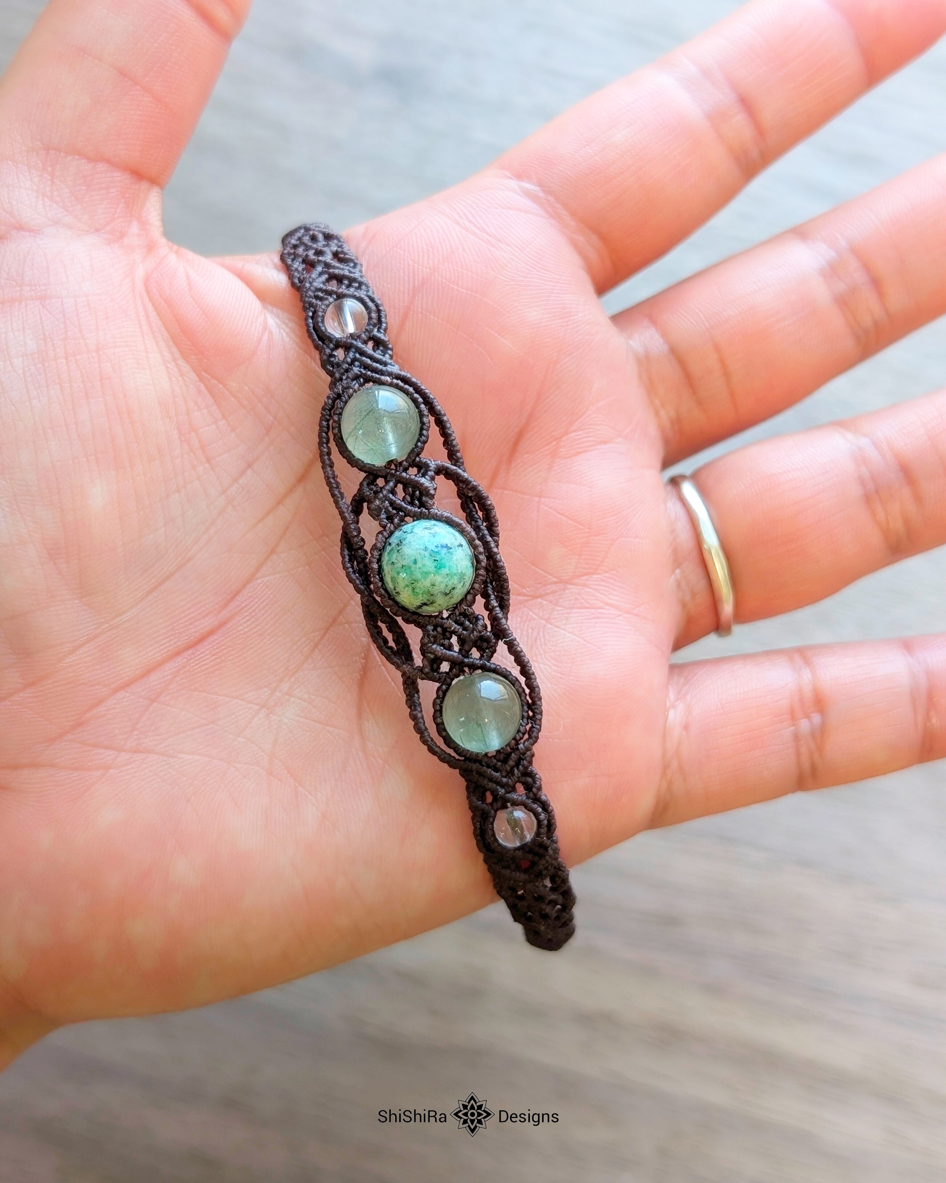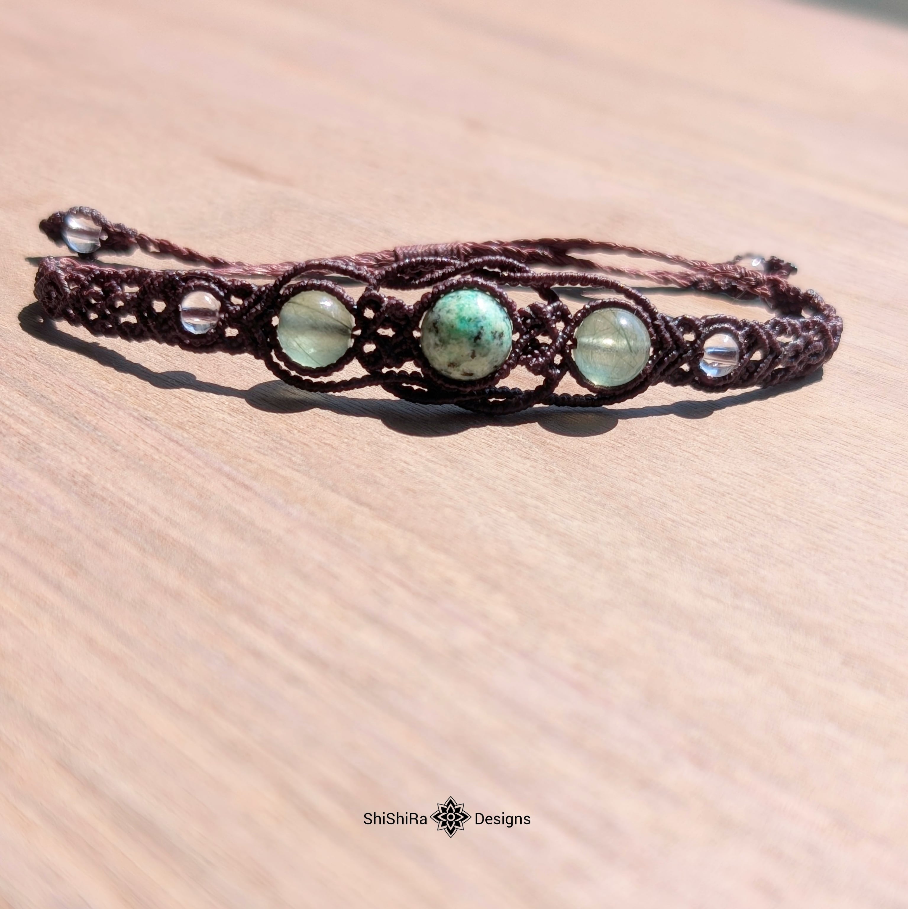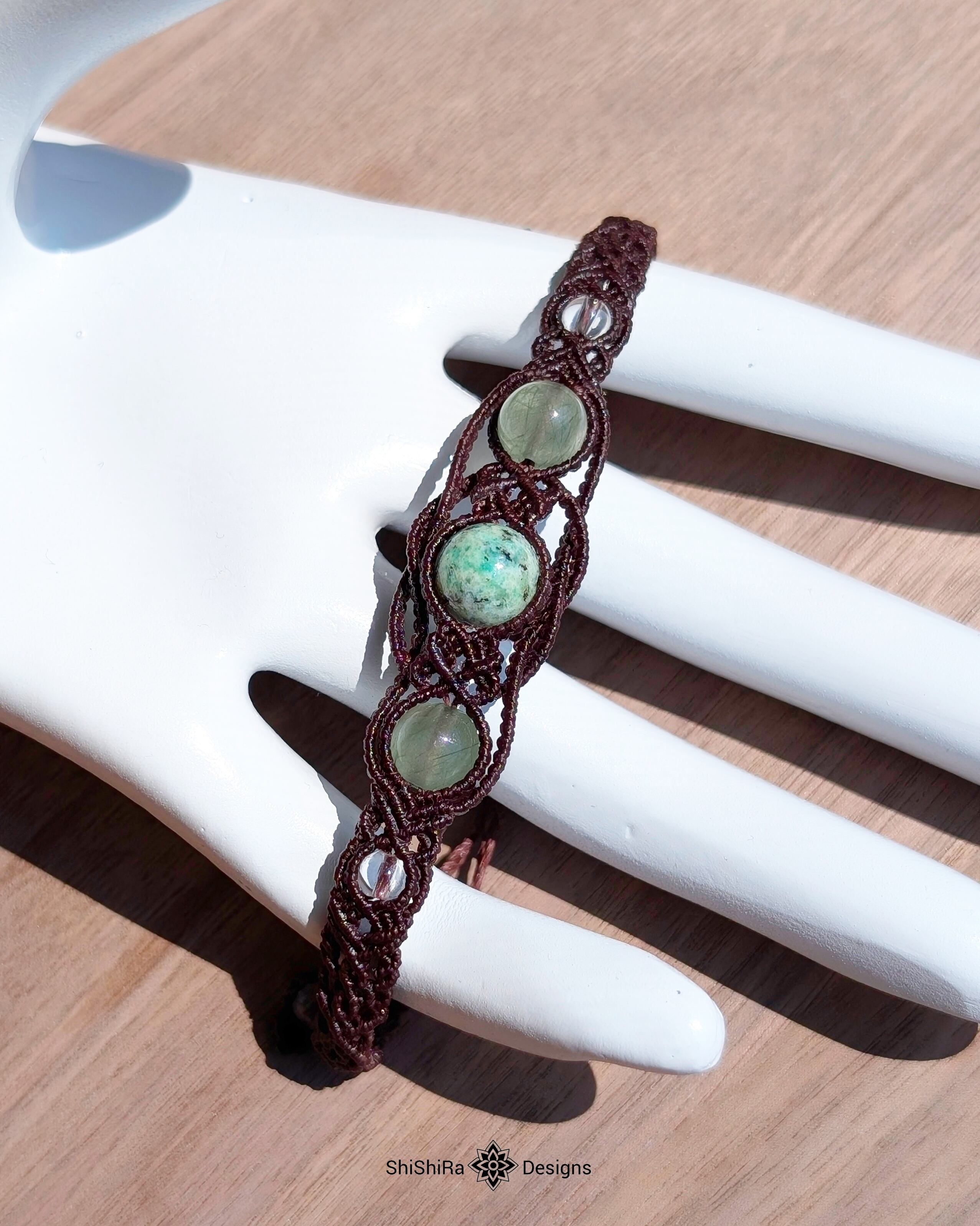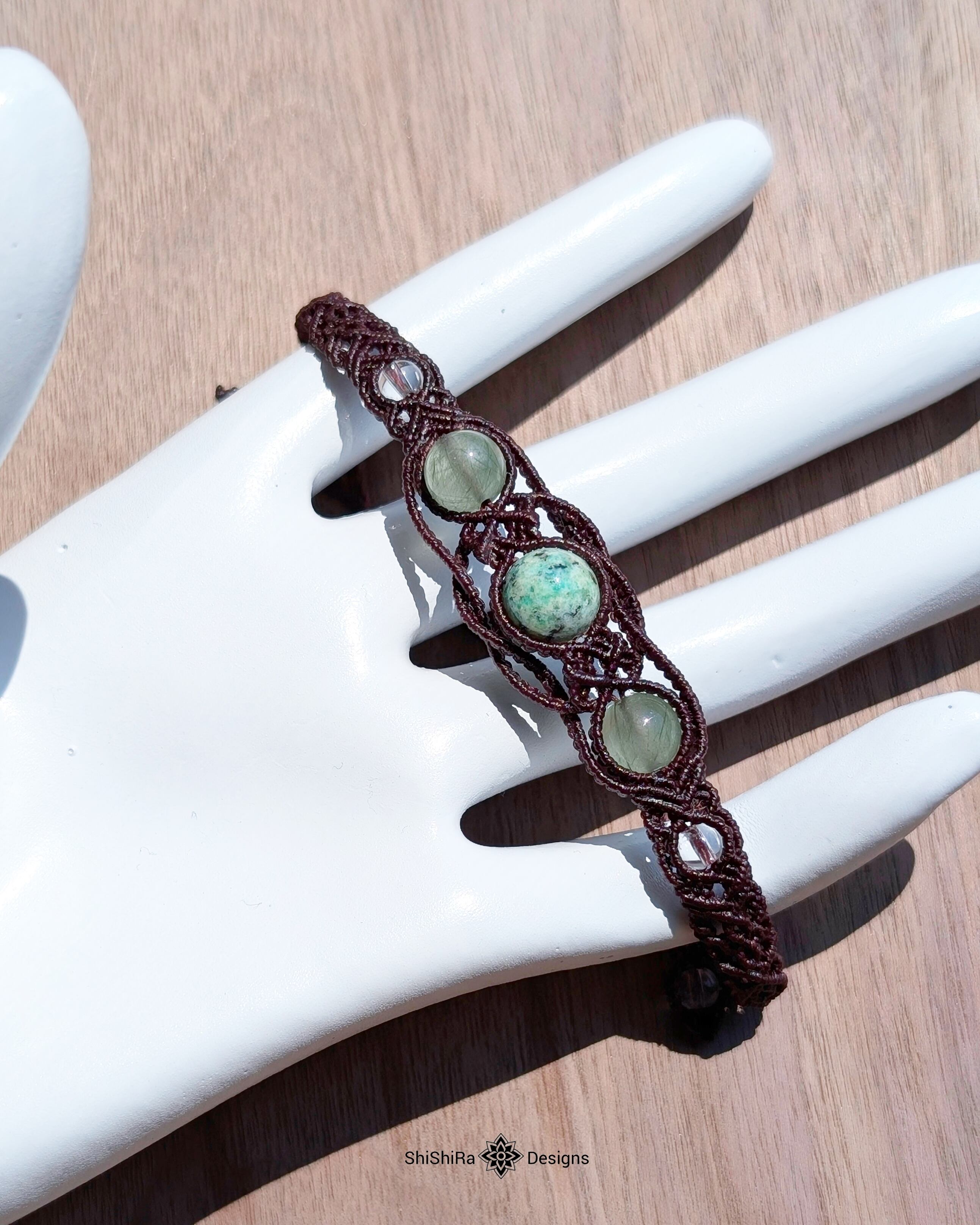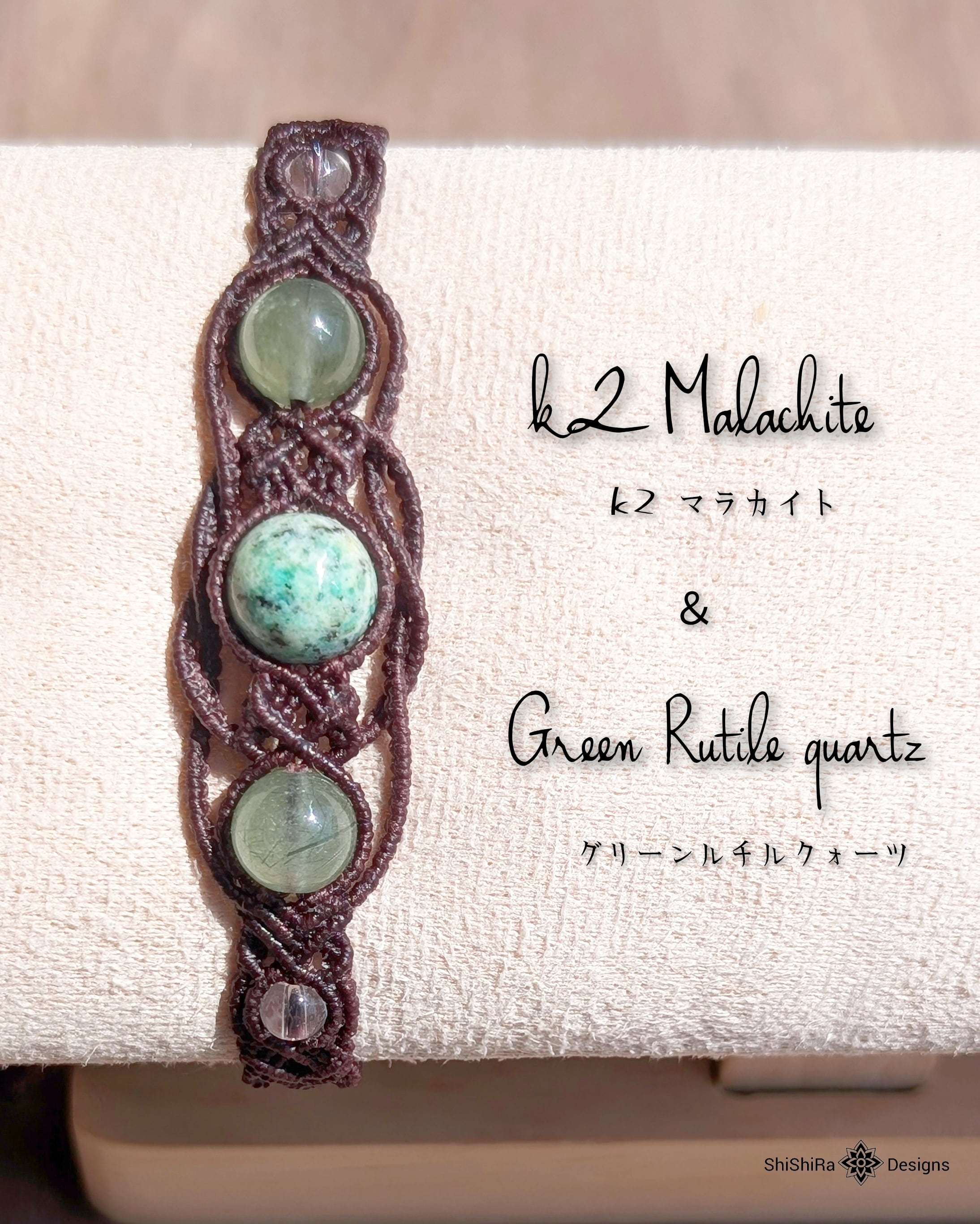 こちらはK2マラカイトとグリーンルチルをマクラメ編みで編みこんだブレスレットです。