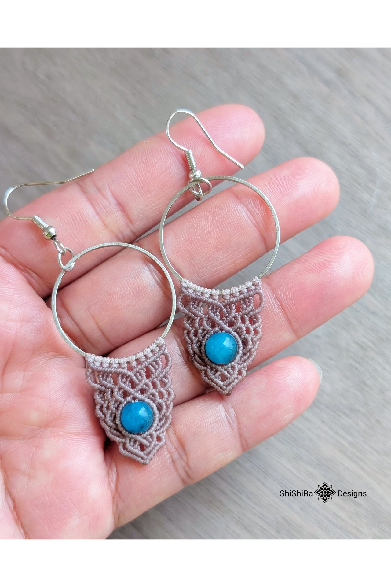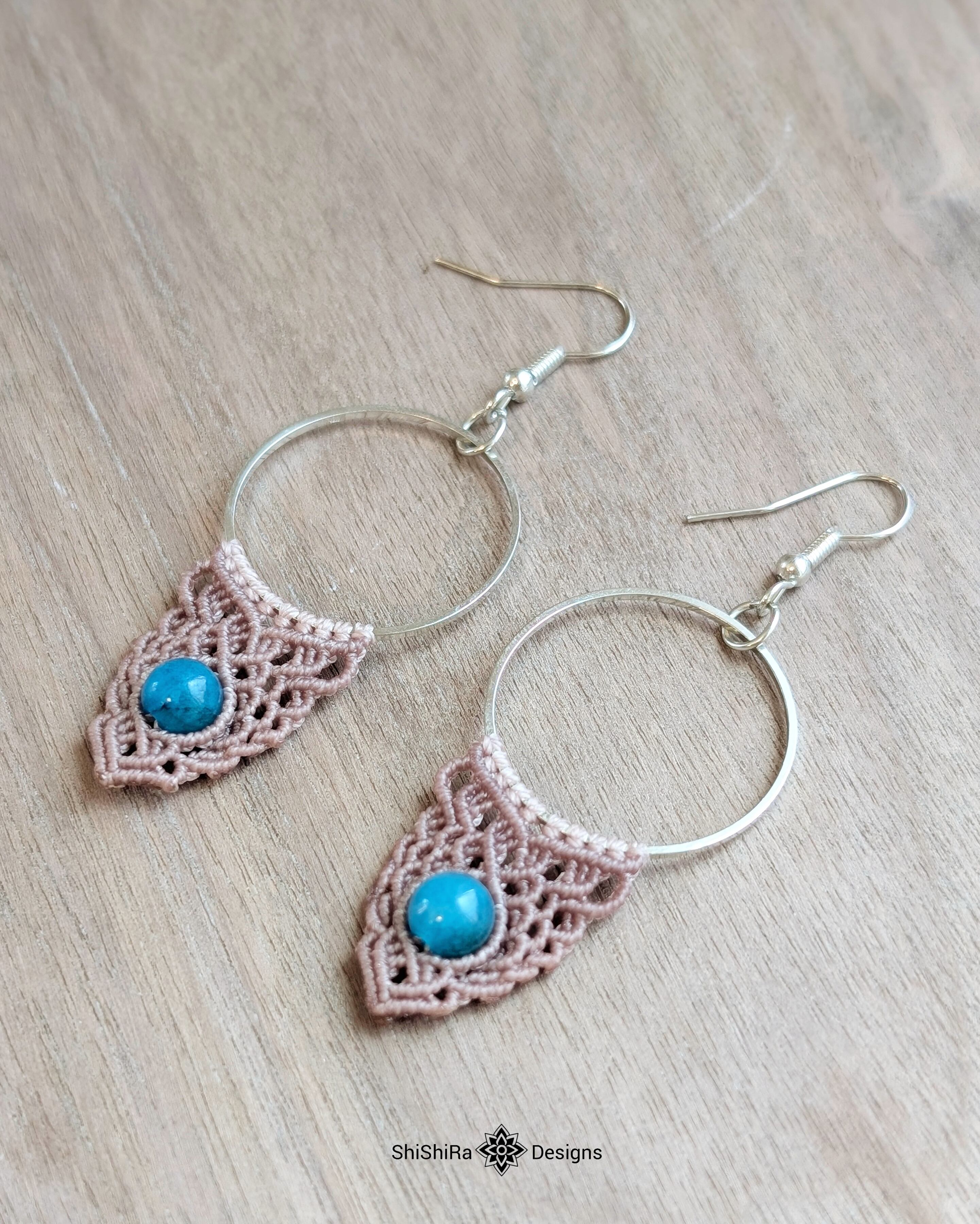 こちらはブルーアパタイトをマクラメ編みで編みこんだピアスです。
