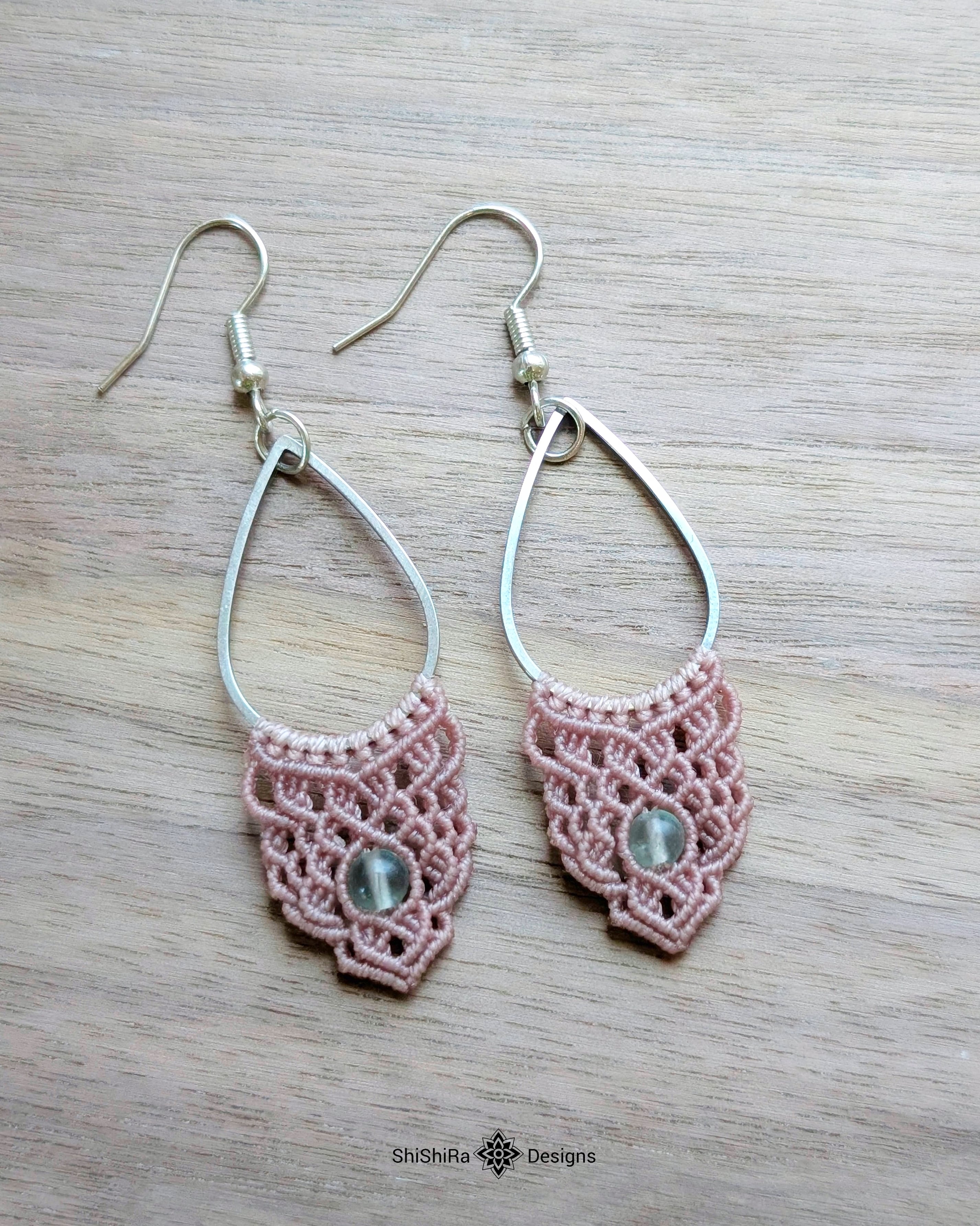こちらはグリーンフローライトをマクラメ編みで編みこんだピアスです。