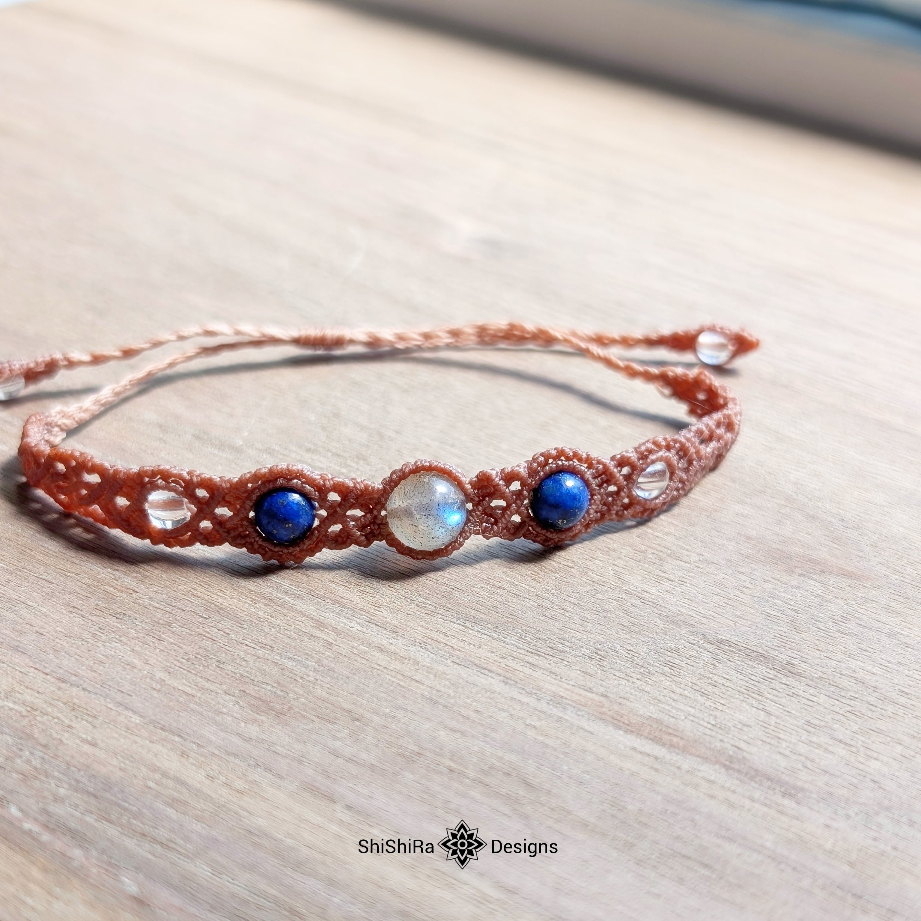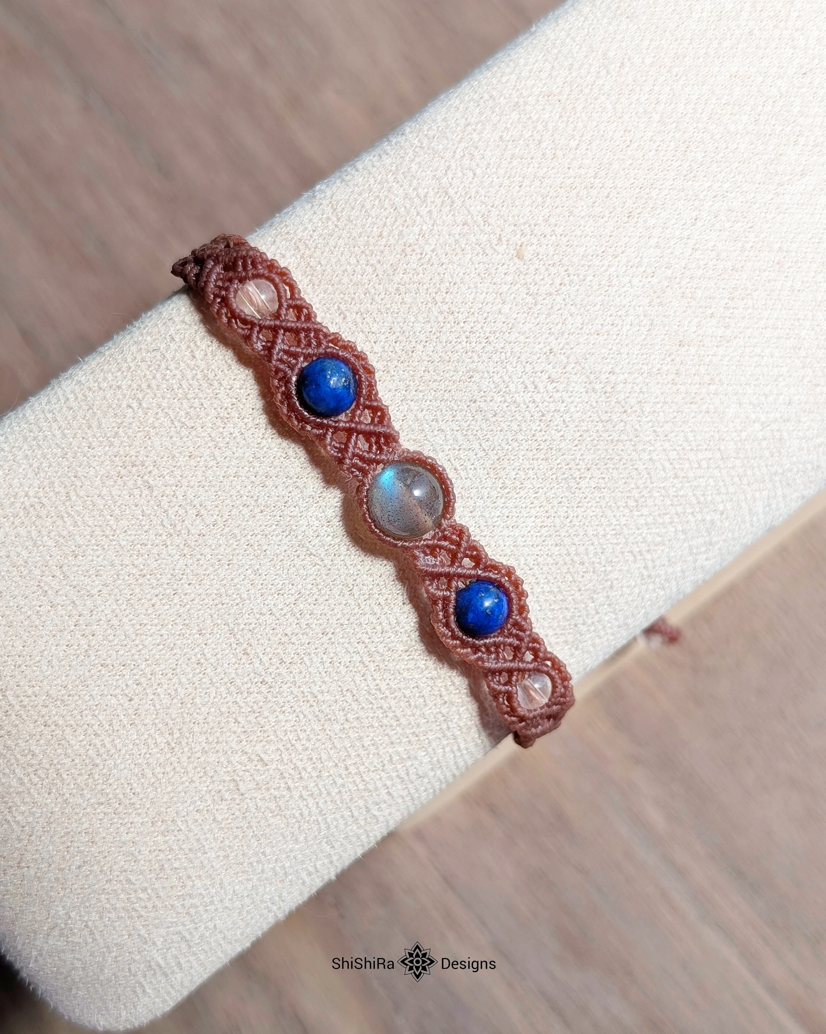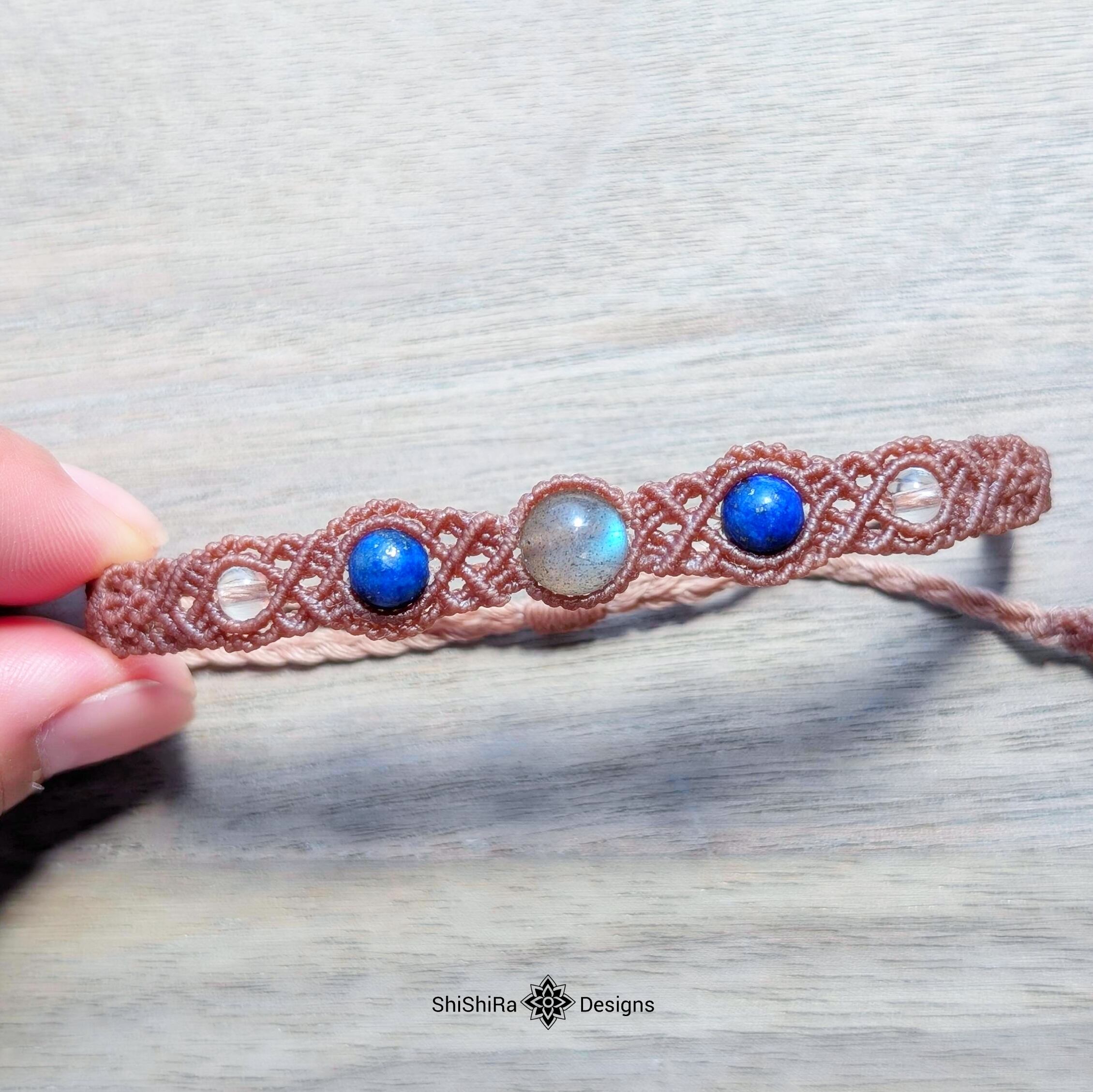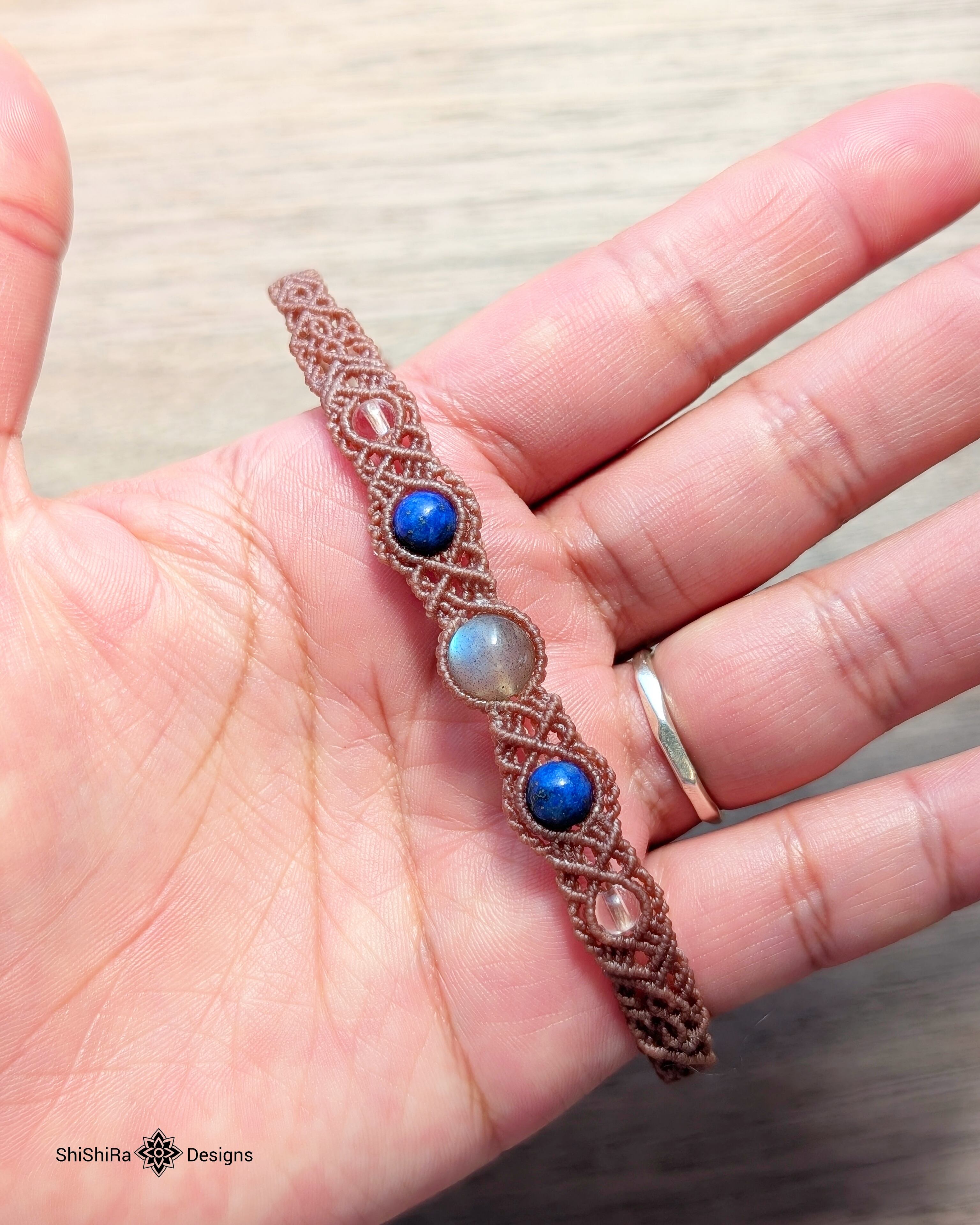 角度によって幻想的な光を放つラブラドライトと深いブルーが印象的なラピスラズリを、丁寧に編み込んだブレスレットです。