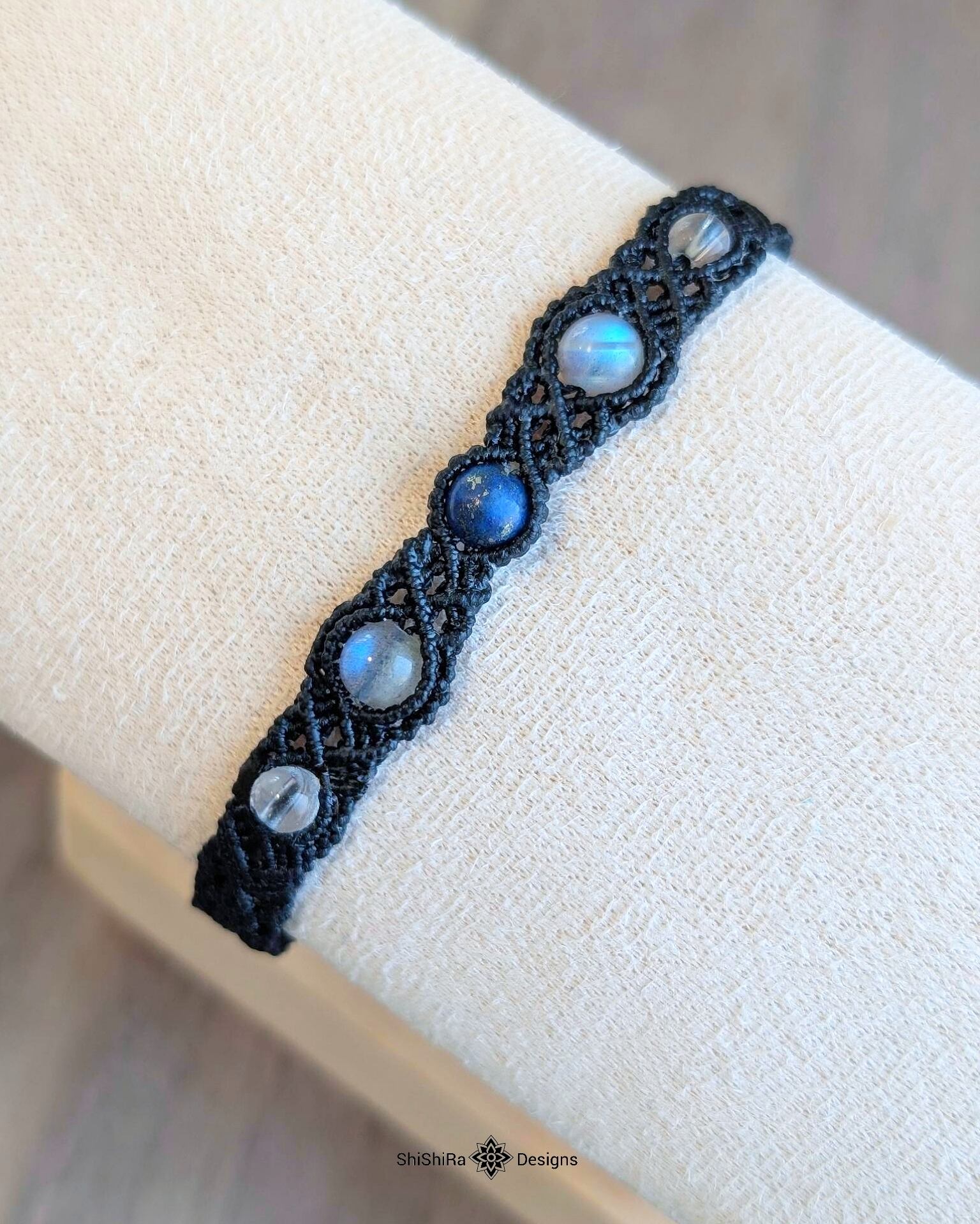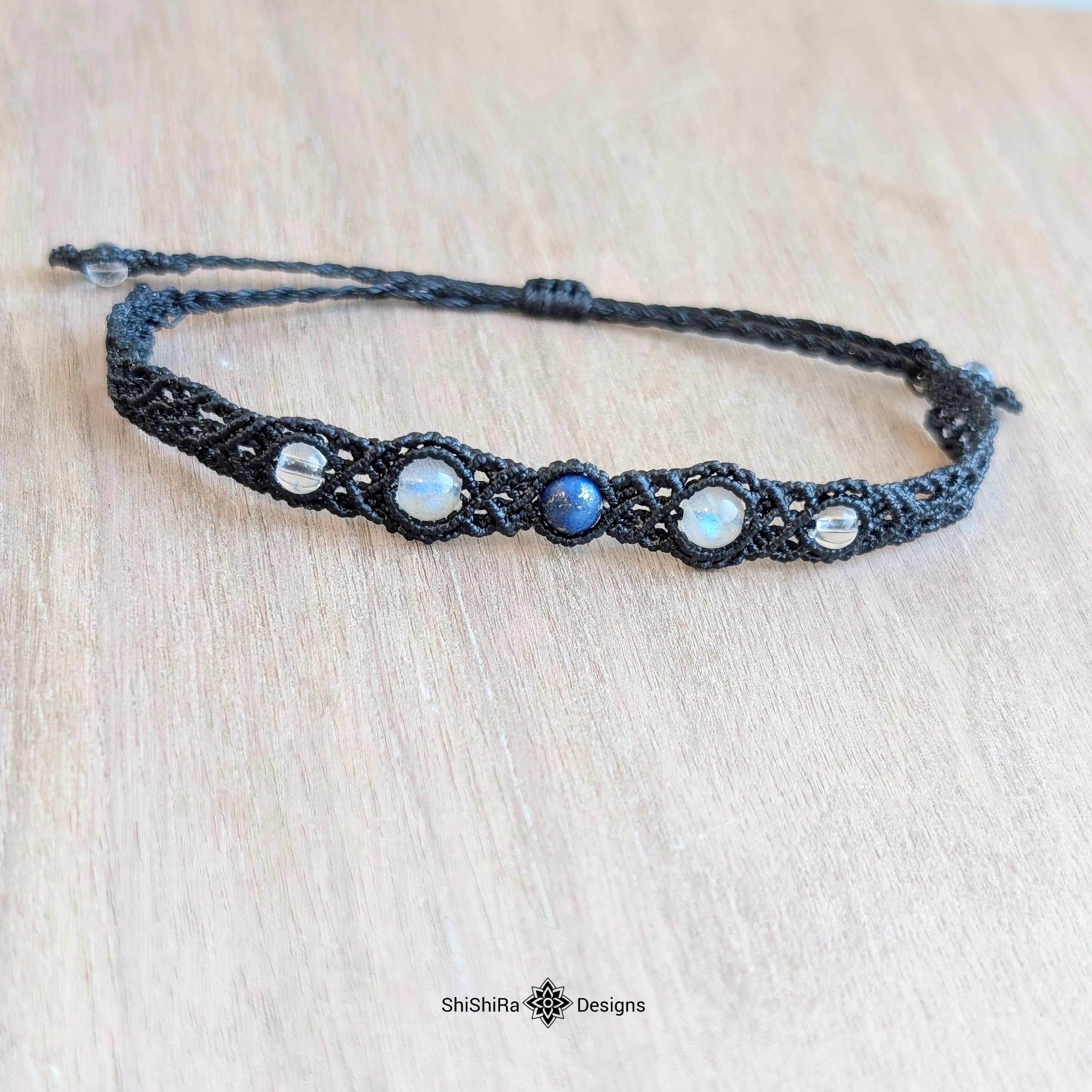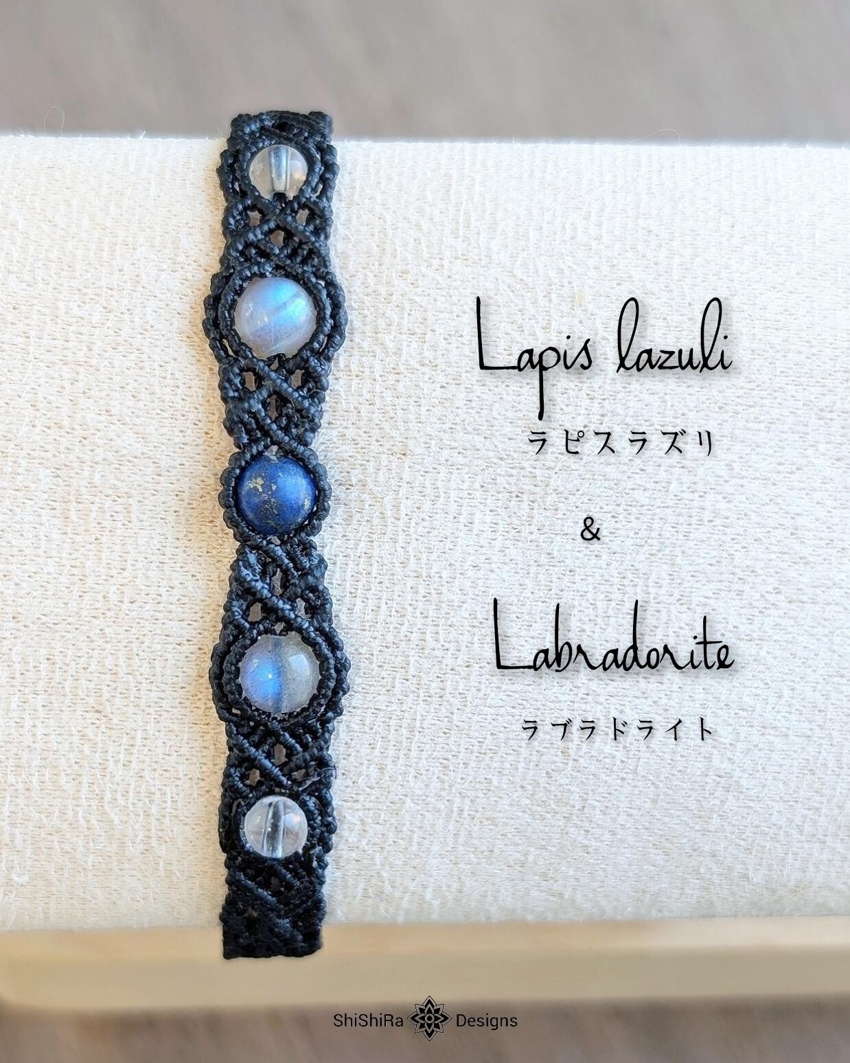 こちらはラピスラズリとラブラドライトをマクラメ編みで編みこんだブレスレットです。