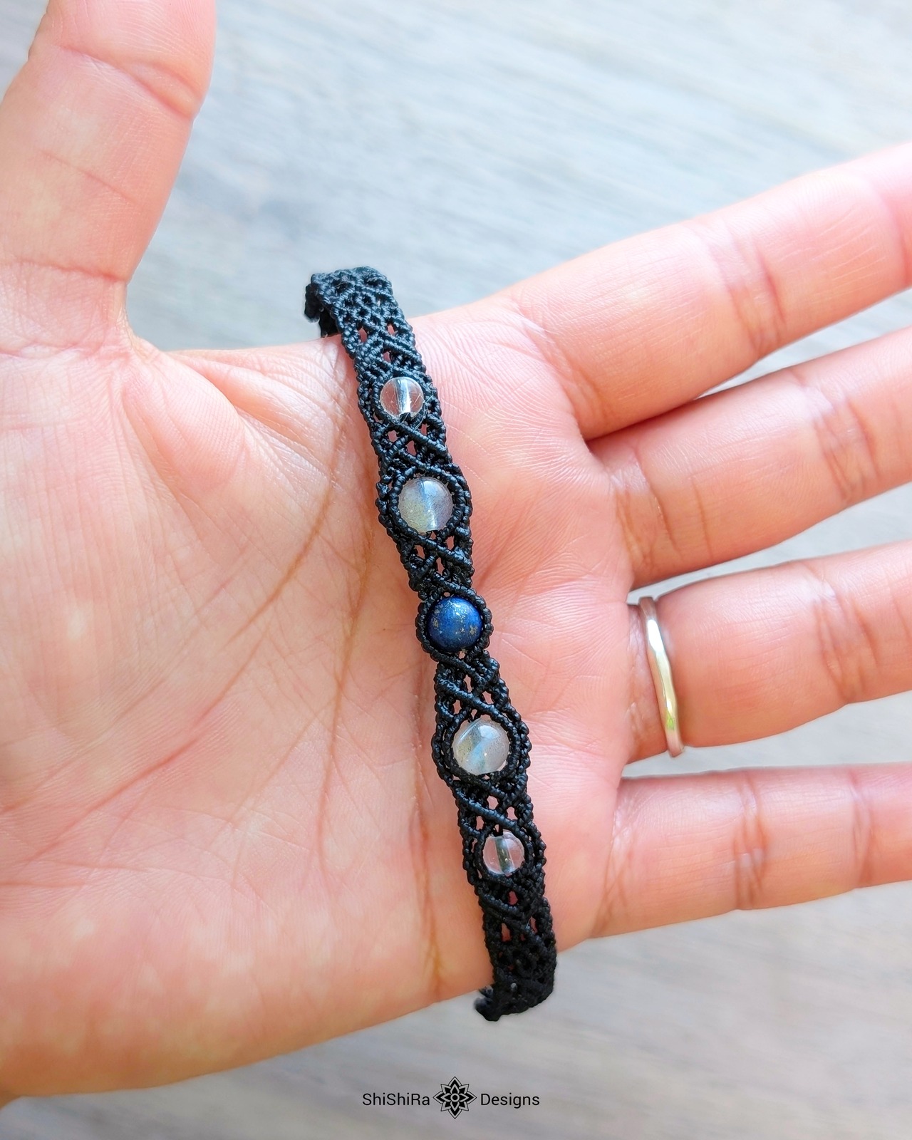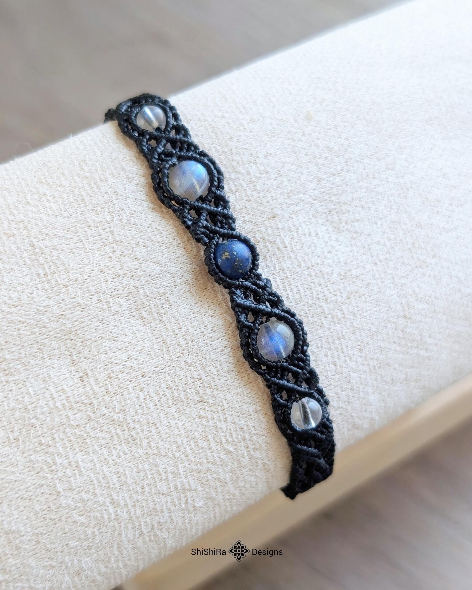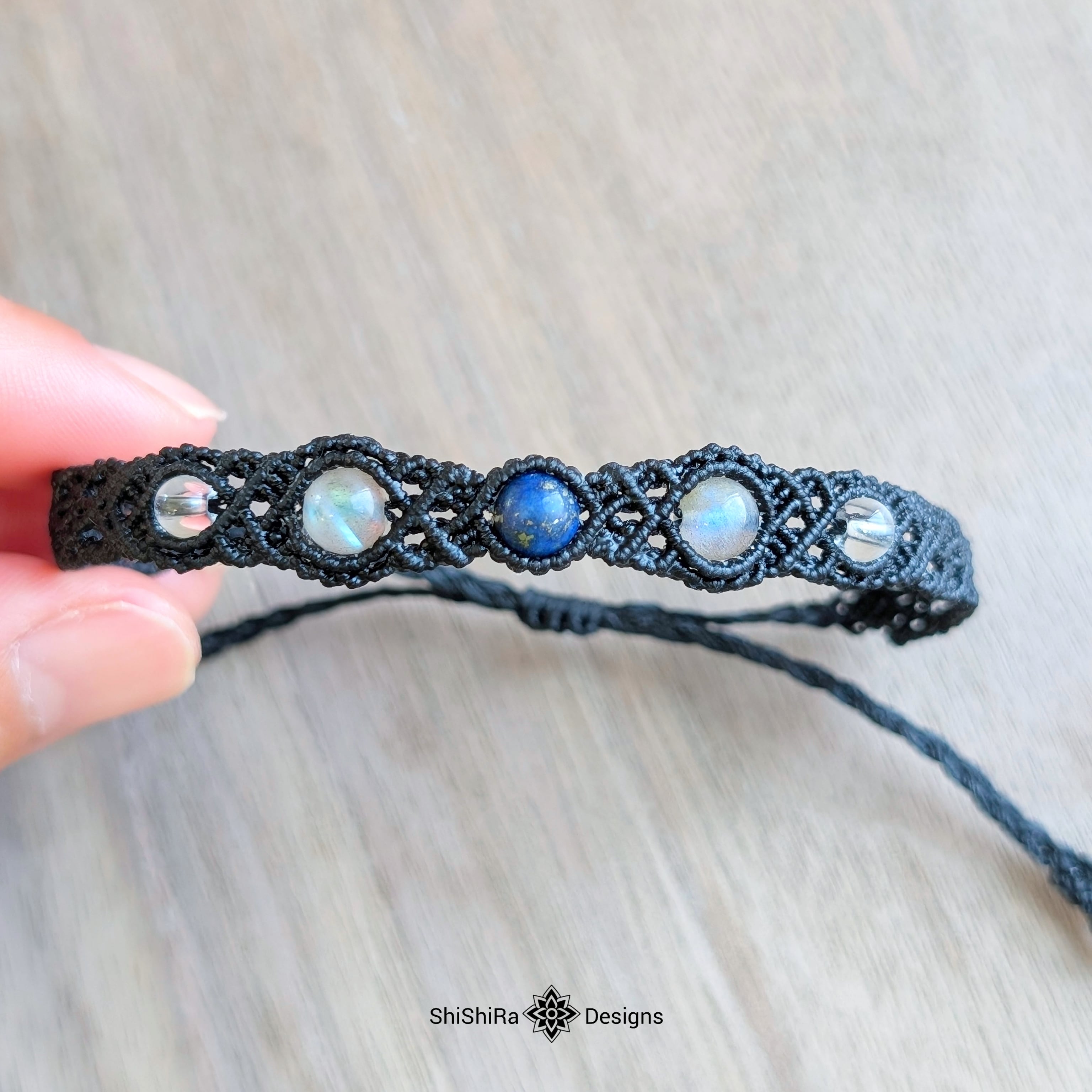 こちらはラピスラズリとラブラドライトをマクラメ編みで編みこんだブレスレットです。