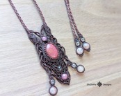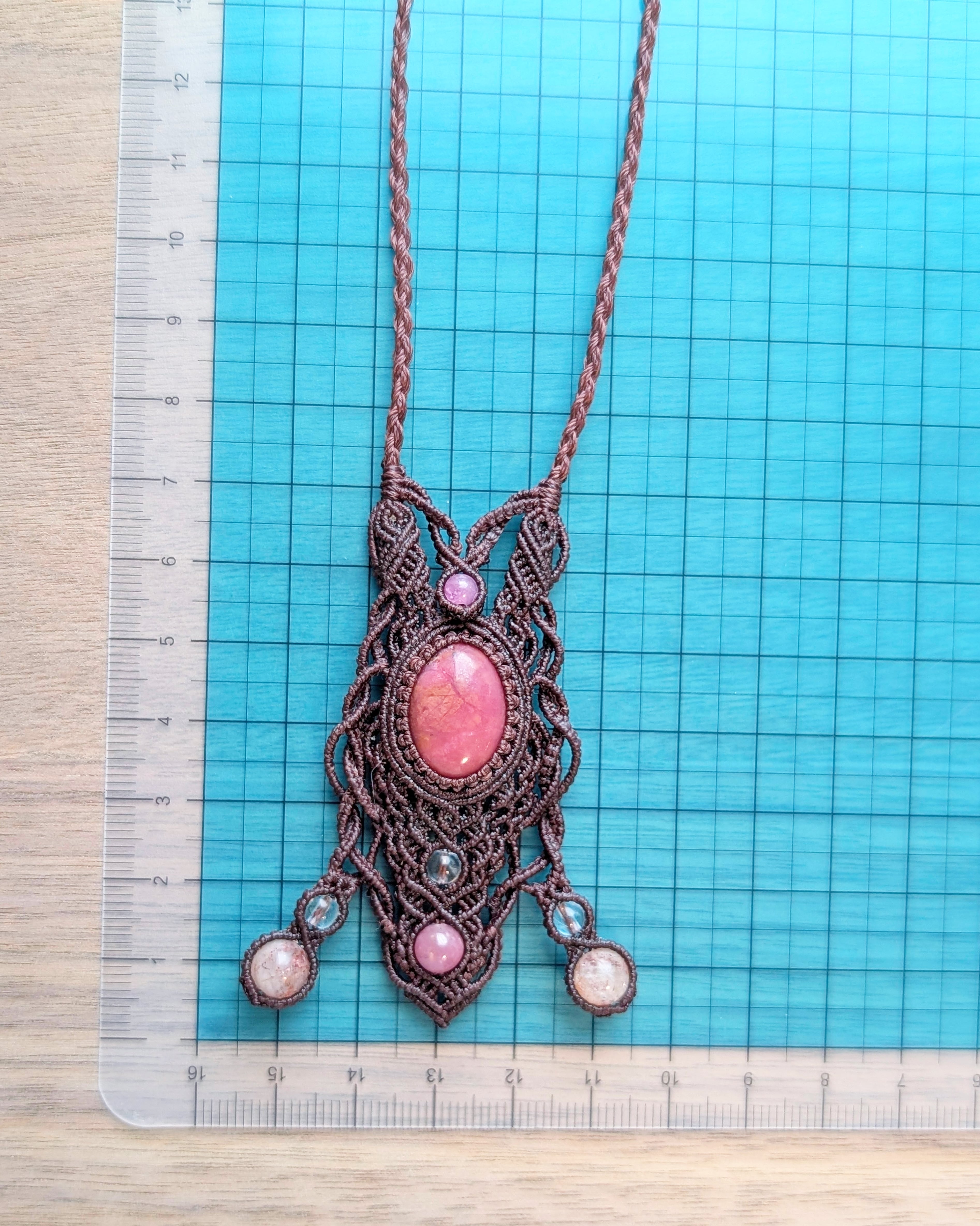 ロードナイトをメインに、ピンク系の天然石をふんだんに使用したマクラメペンダントです。