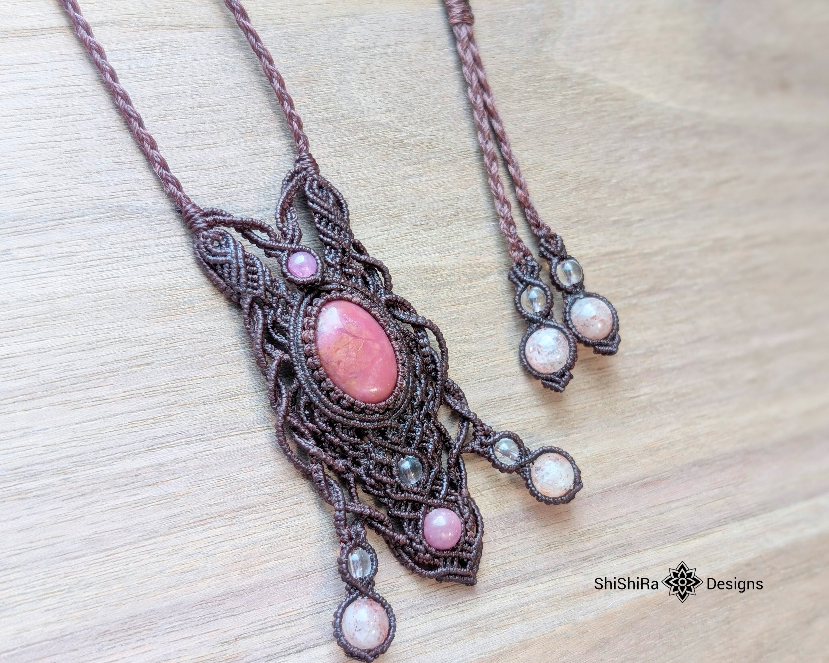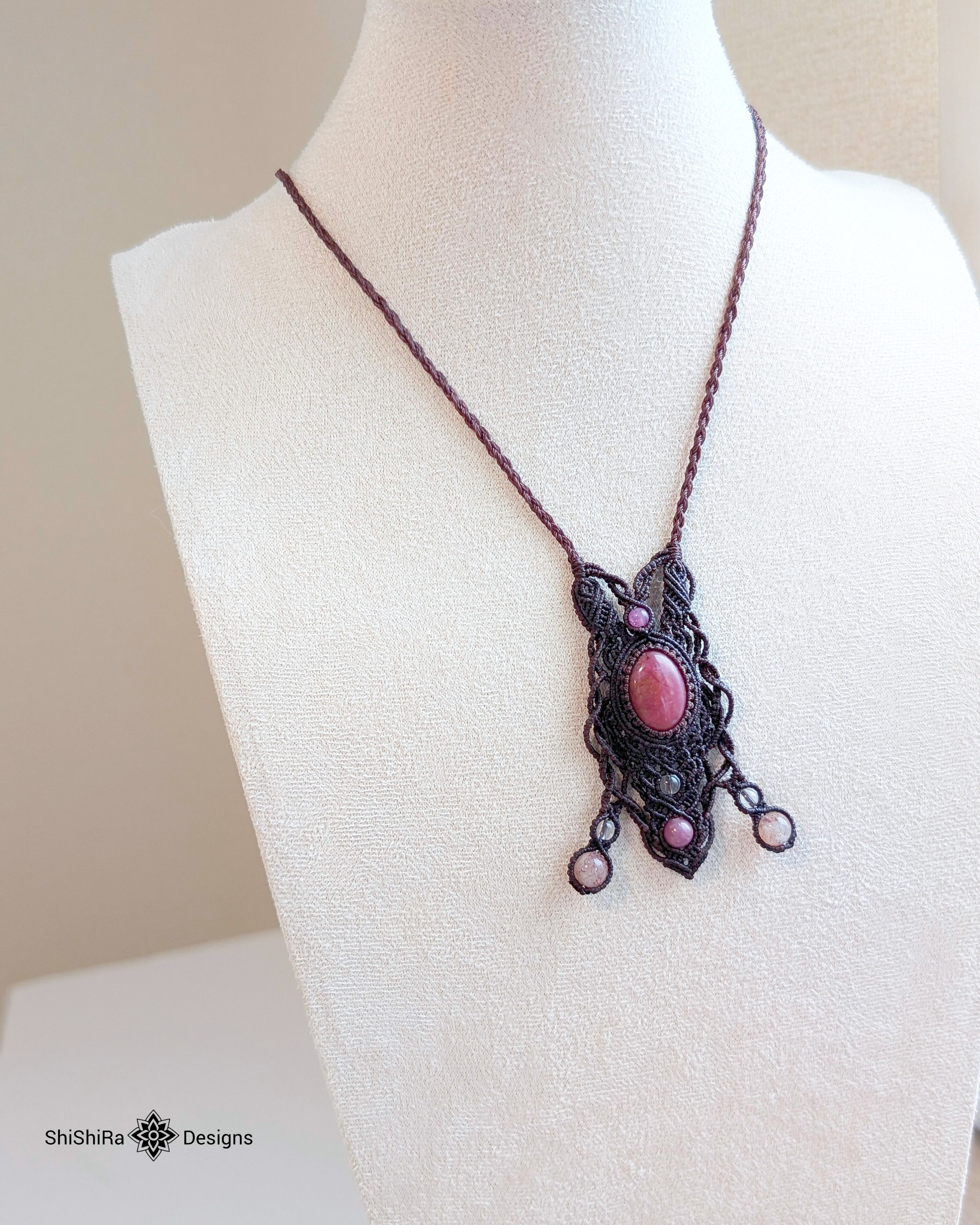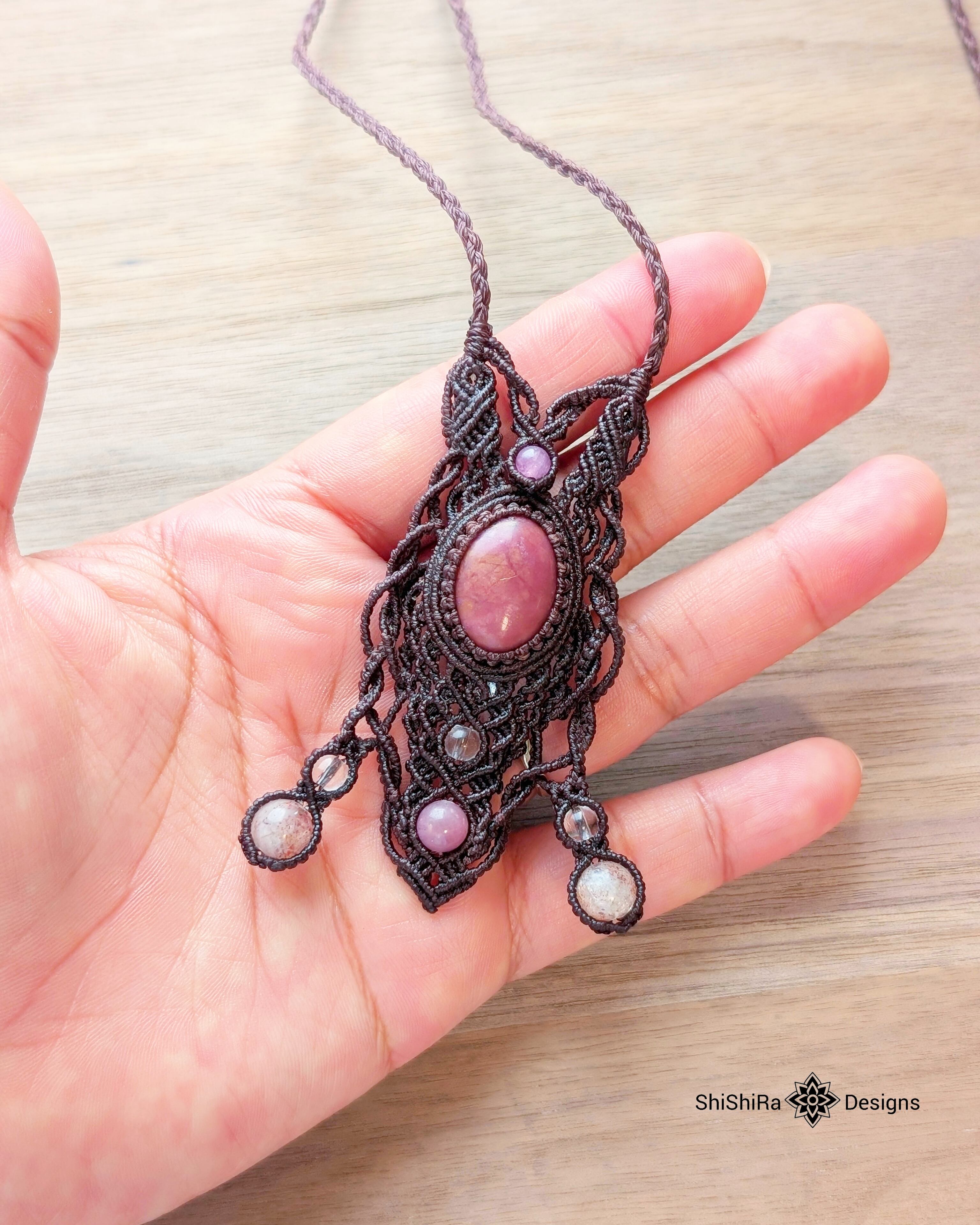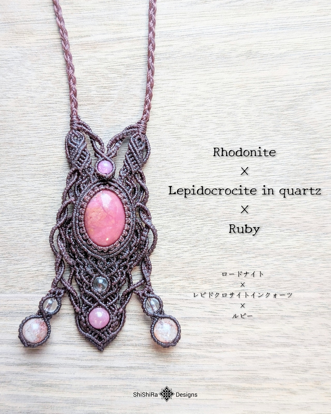 【ShiShiRa’s Premium】ロードナイト・レピドクロサイトインクォーツ・ルビーのマクラメペンダント [金属アレルギー対応]