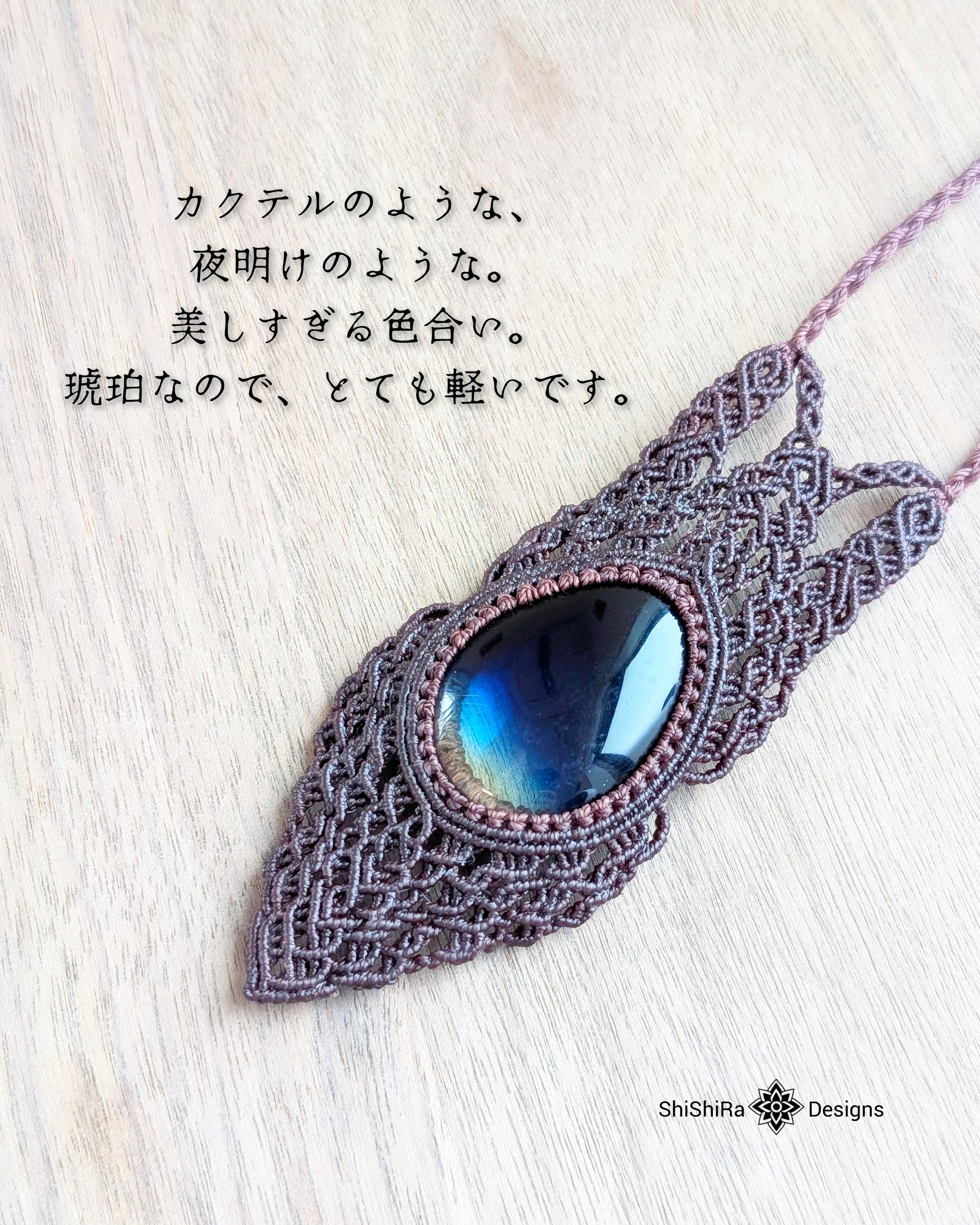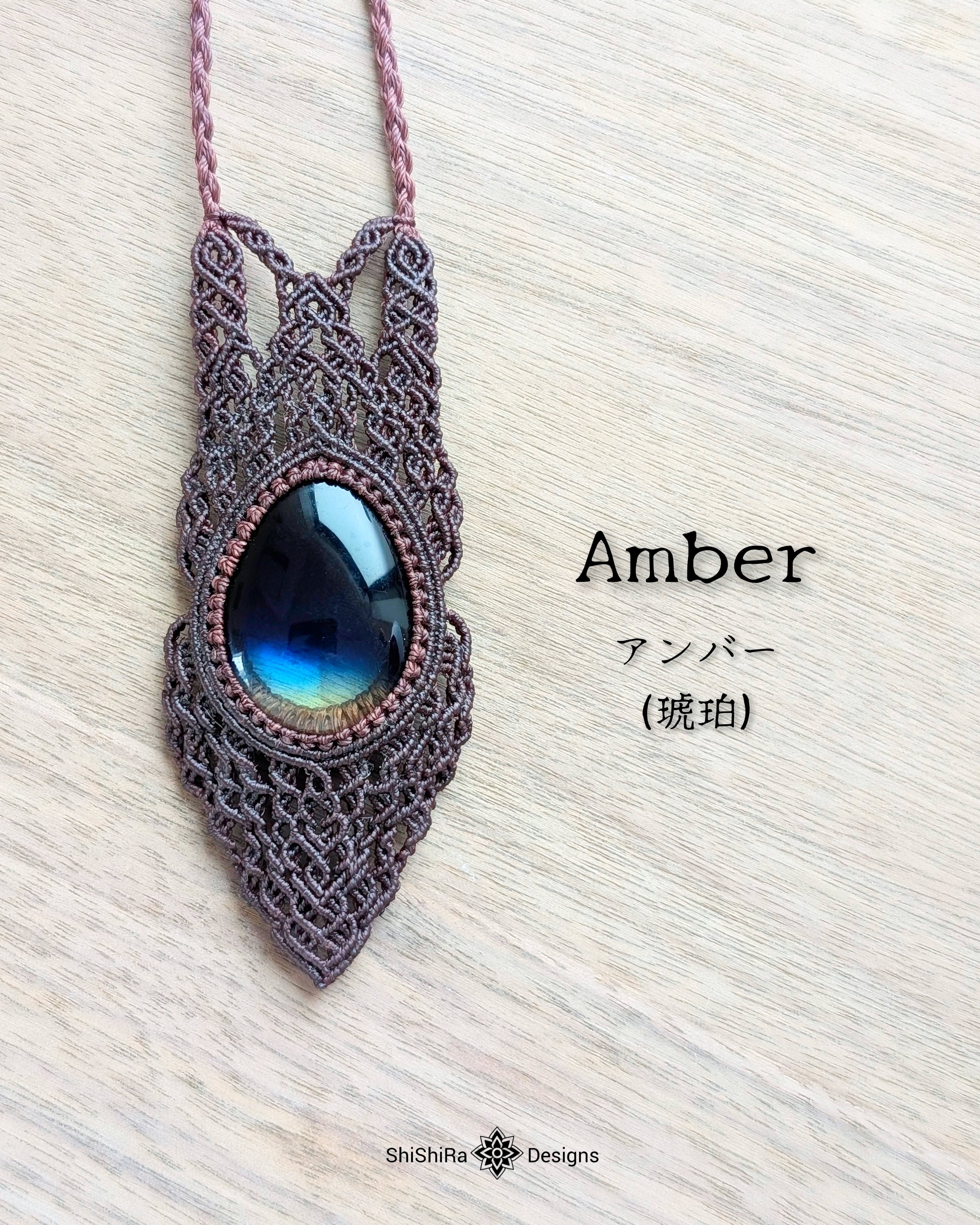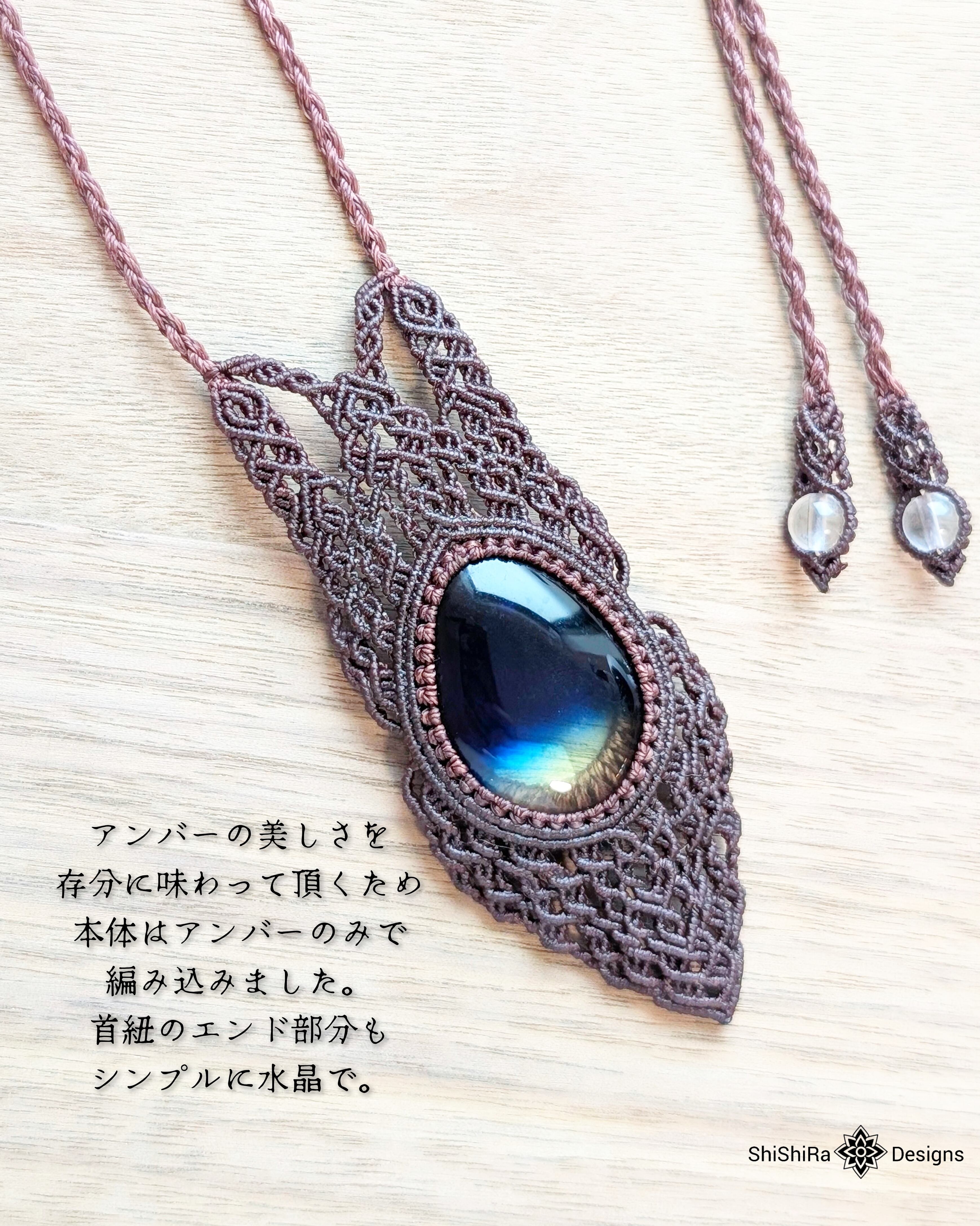 迫力満点のアンバーだったので、ペンダント本体には他の石は使わずマクラメのみで装飾を施しました。