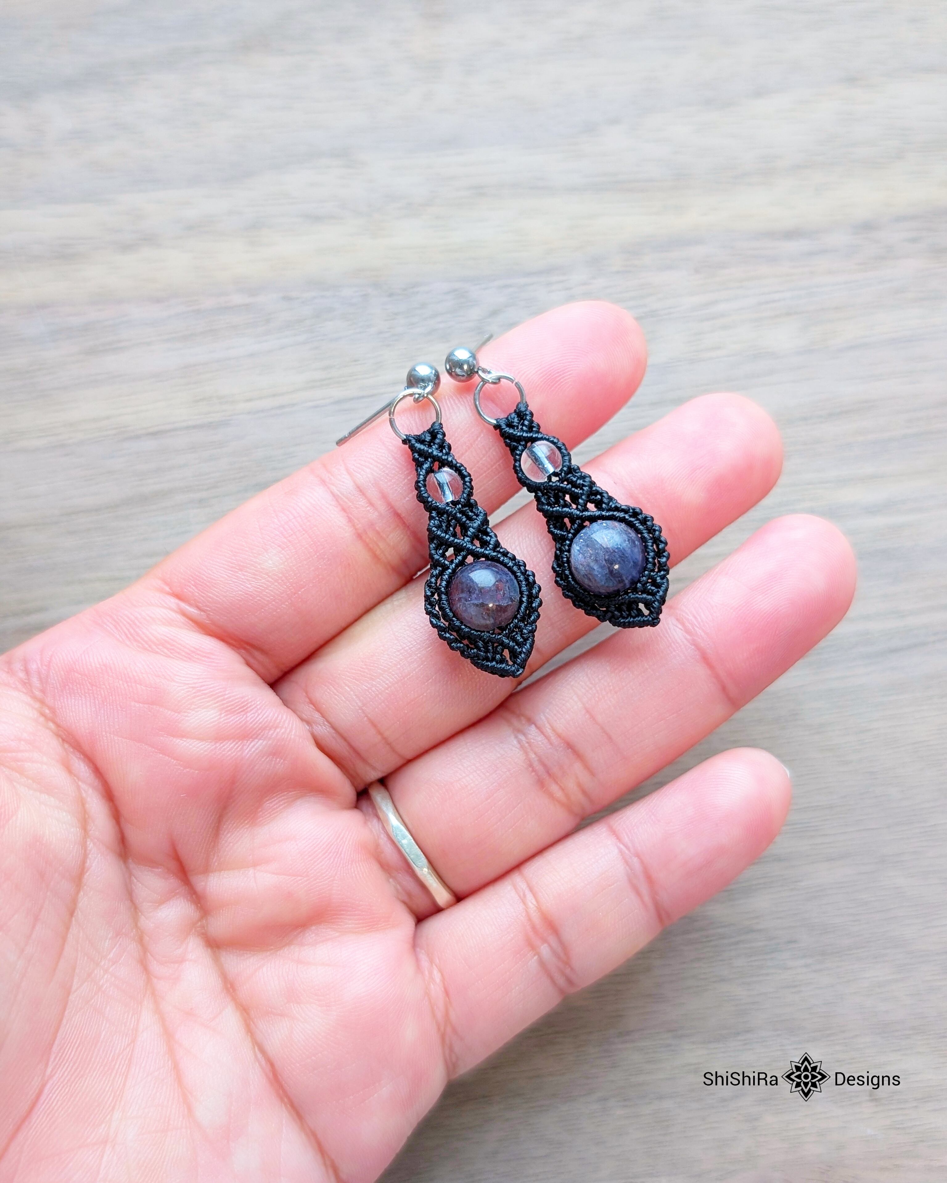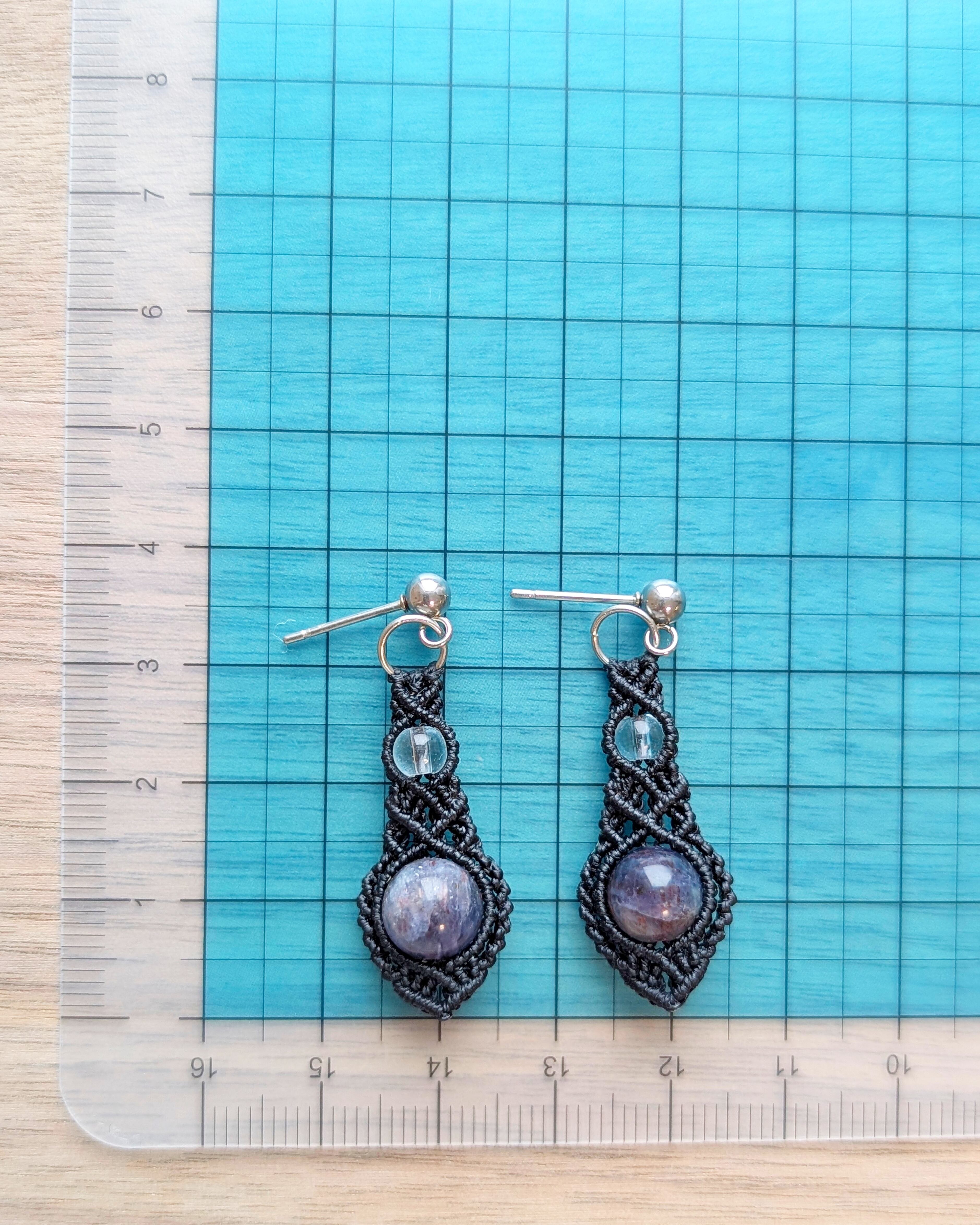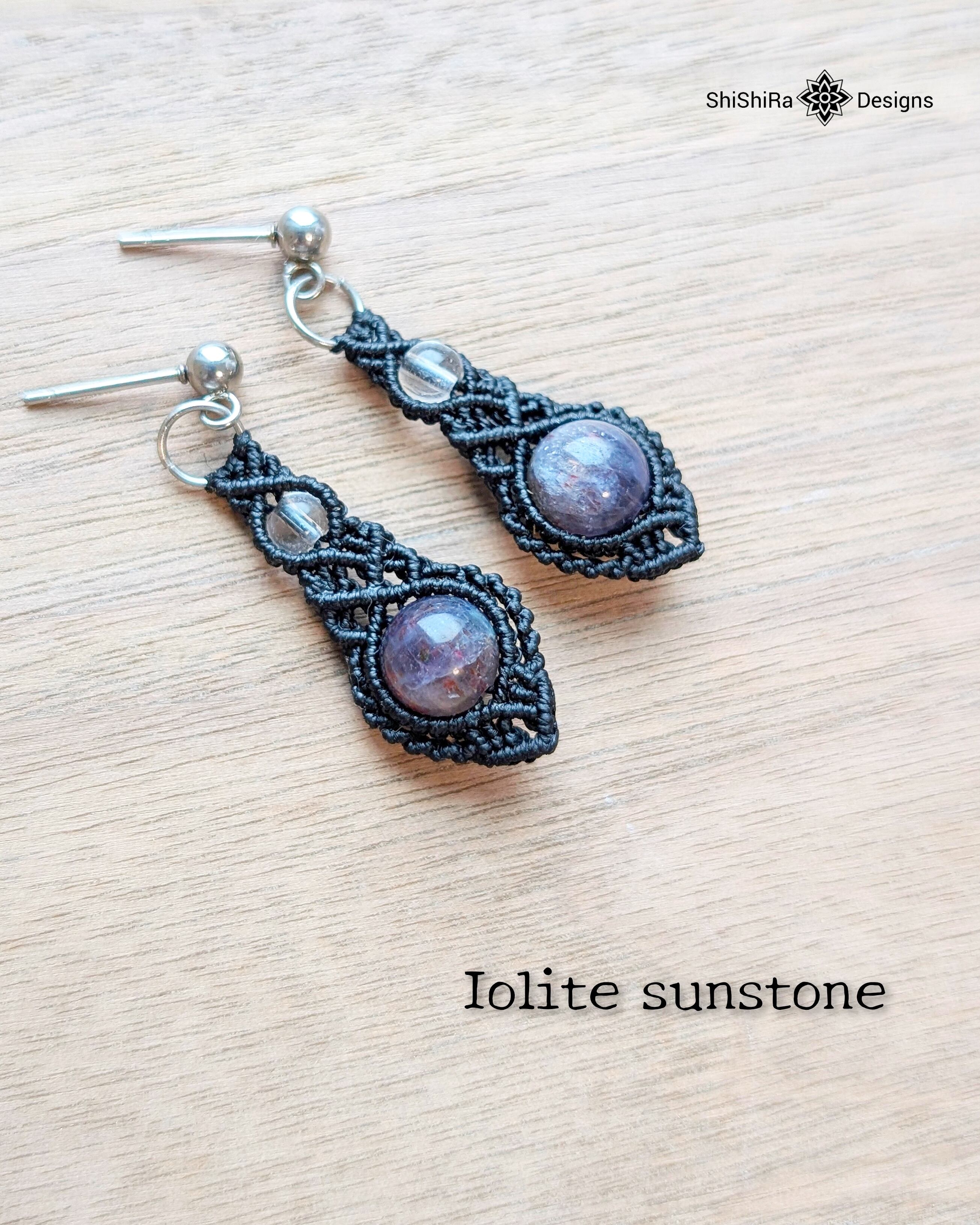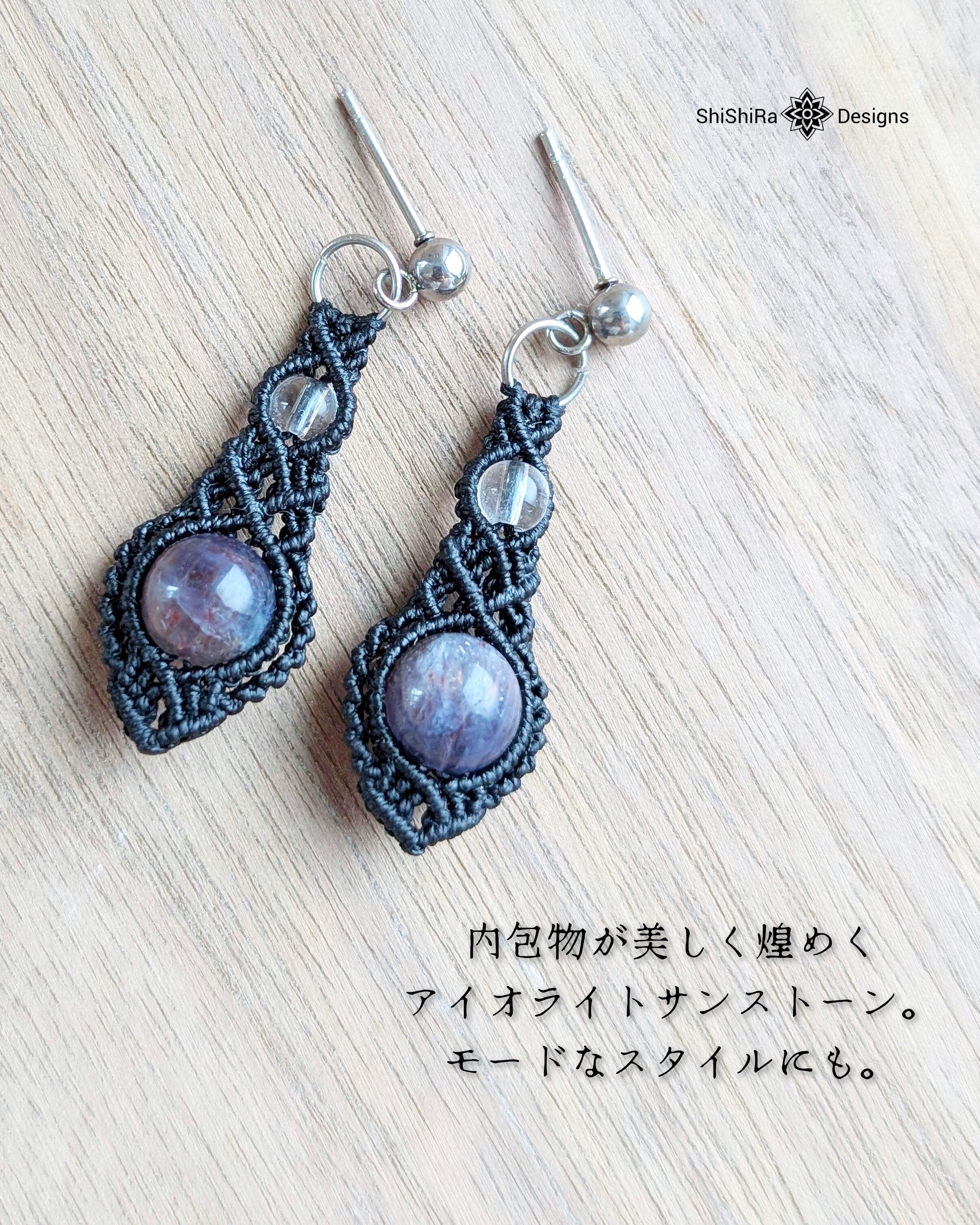 こちらはアイオライトサンストーンと水晶をマクラメ編みで編みこんだピアスです。