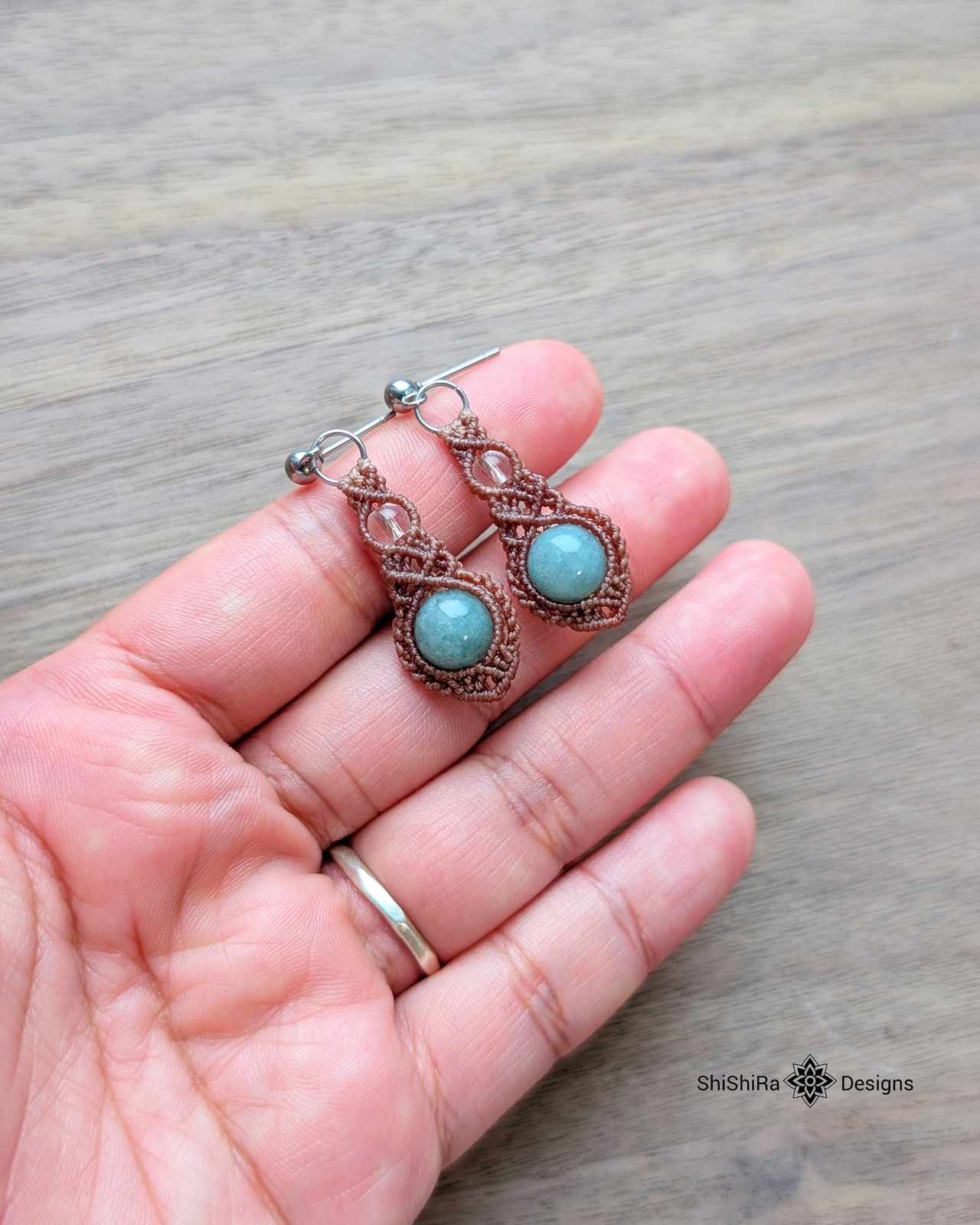 こちらは翡翠と水晶をマクラメ編みで編みこんだピアスです。