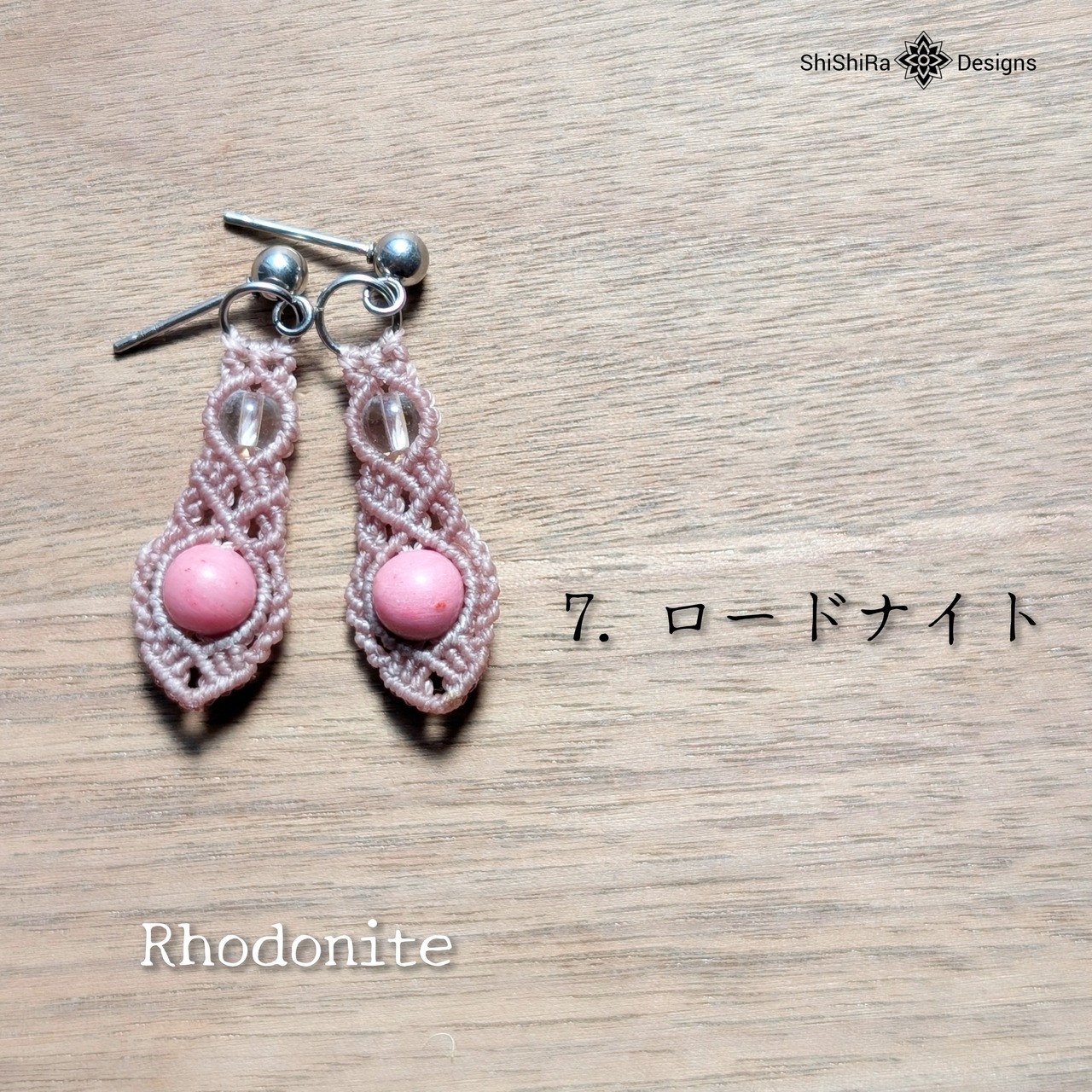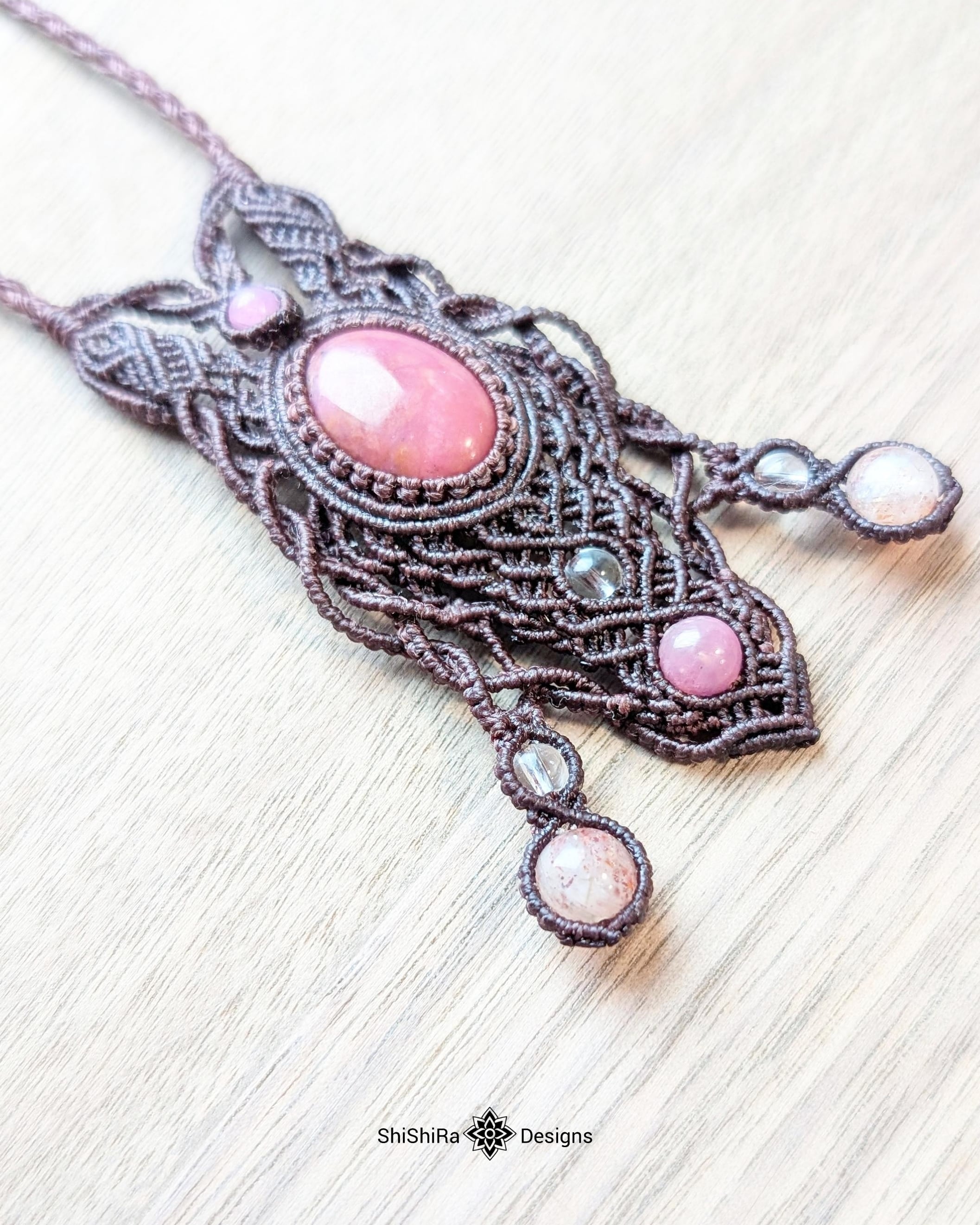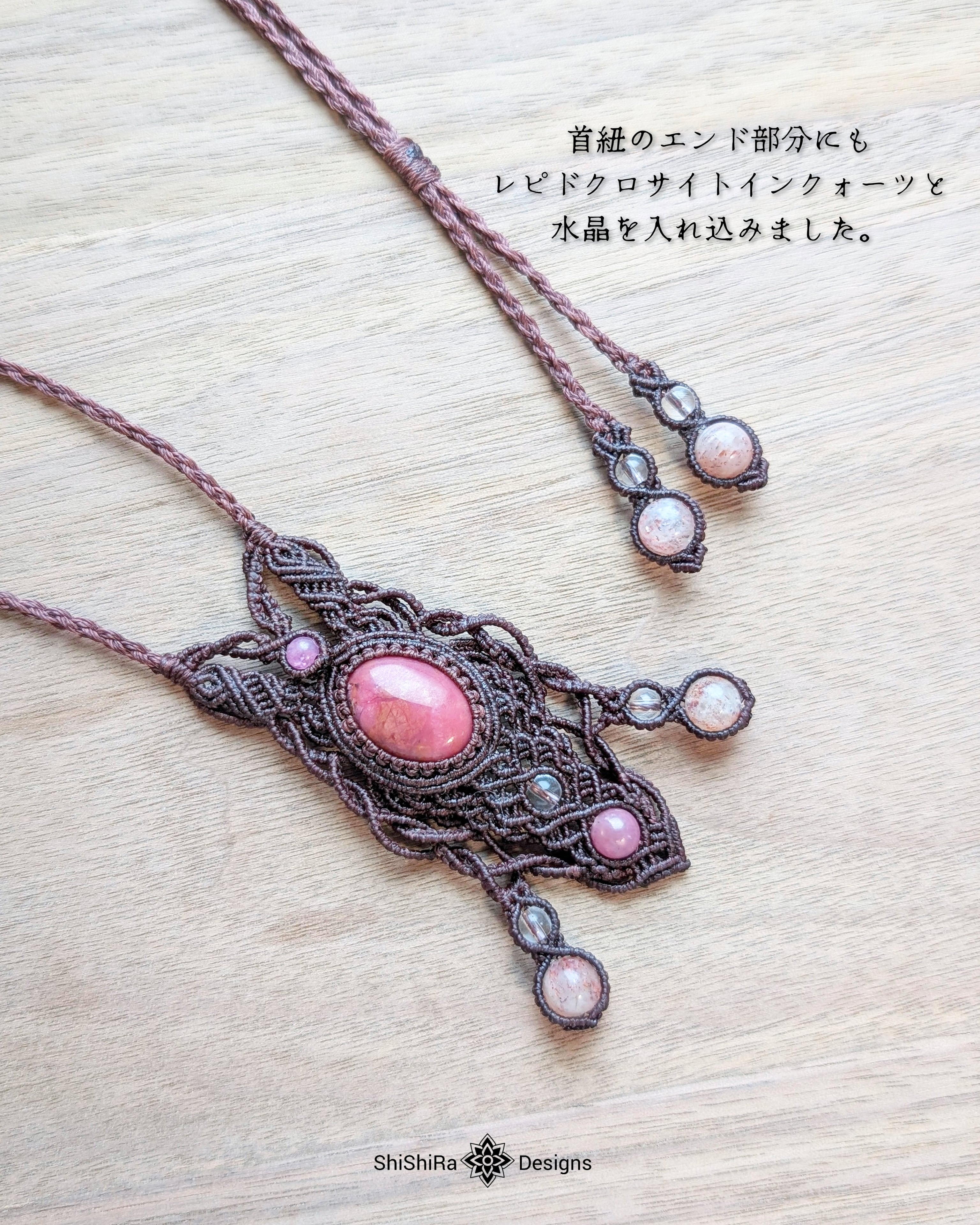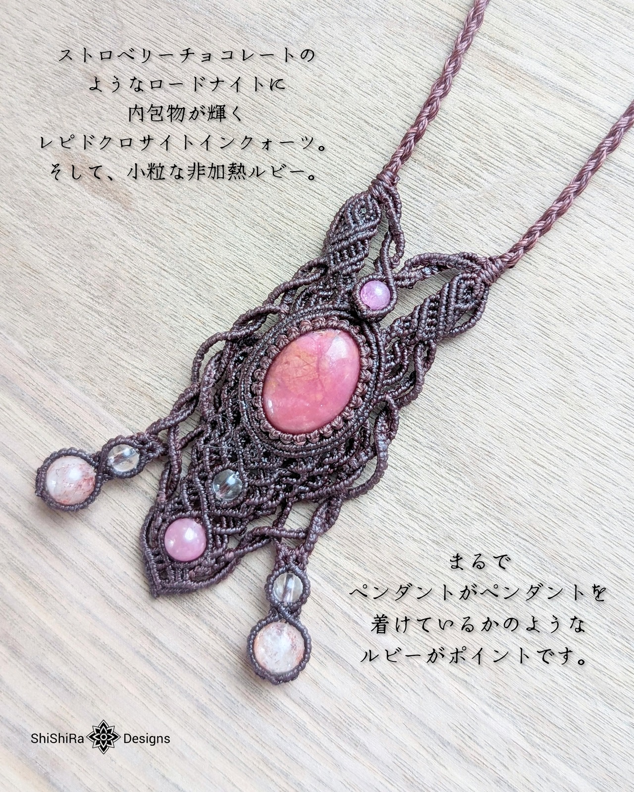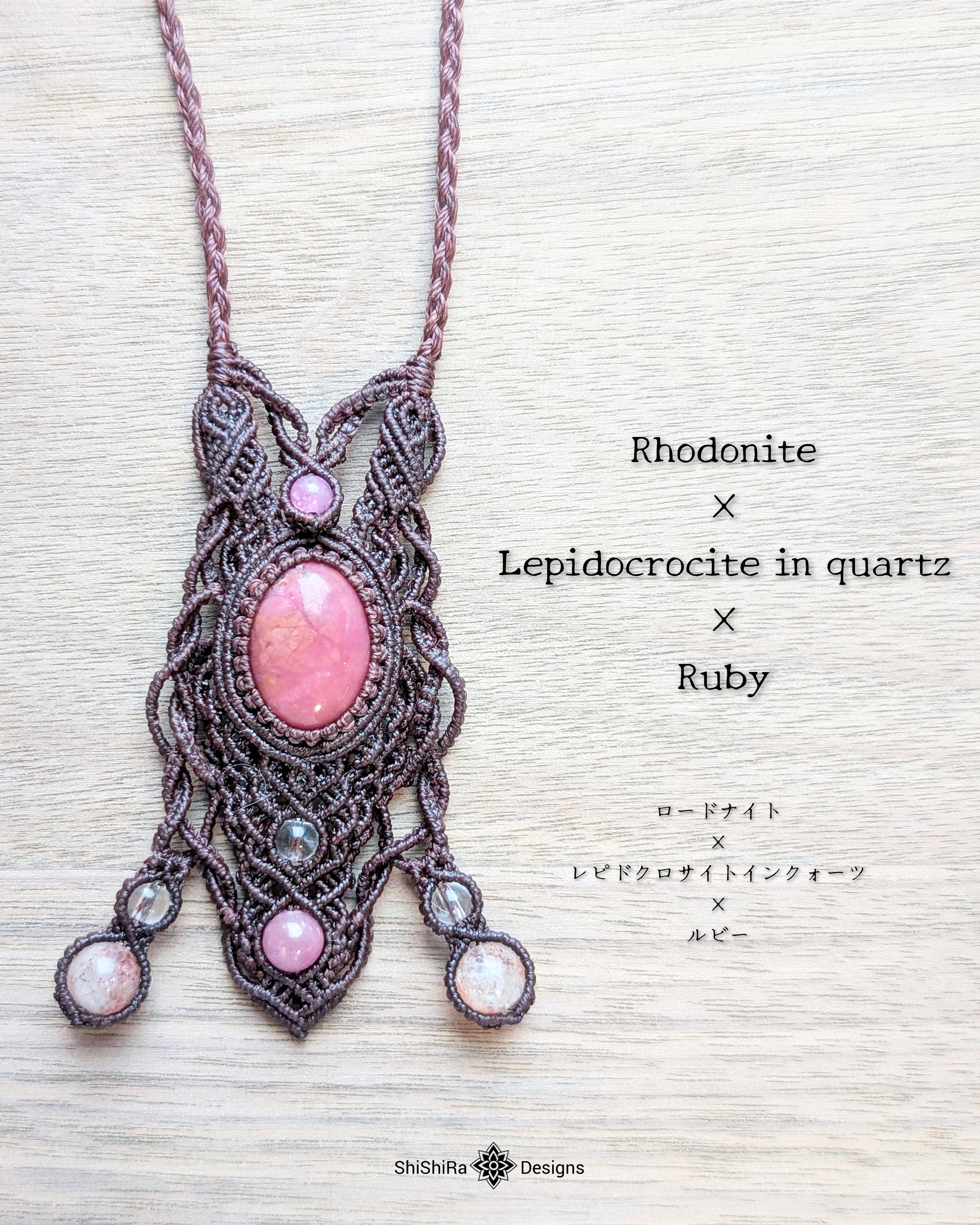 そして上品なピンクを散りばめた、ロードナイト・レピドクロサイトインクォーツ・ルビーのマクラメペンダント。