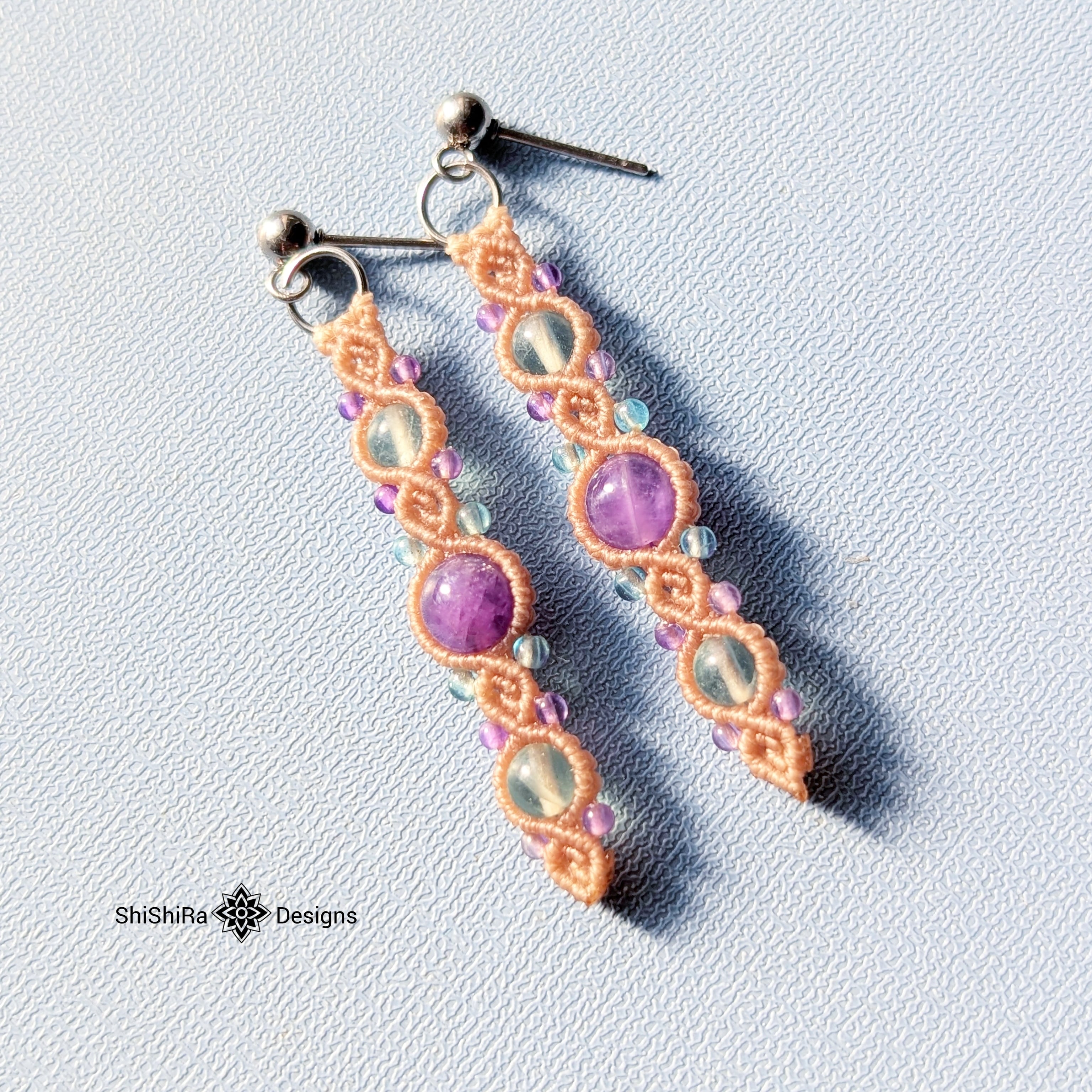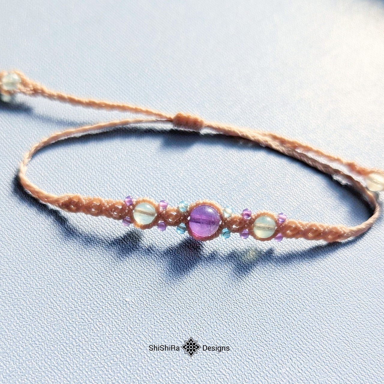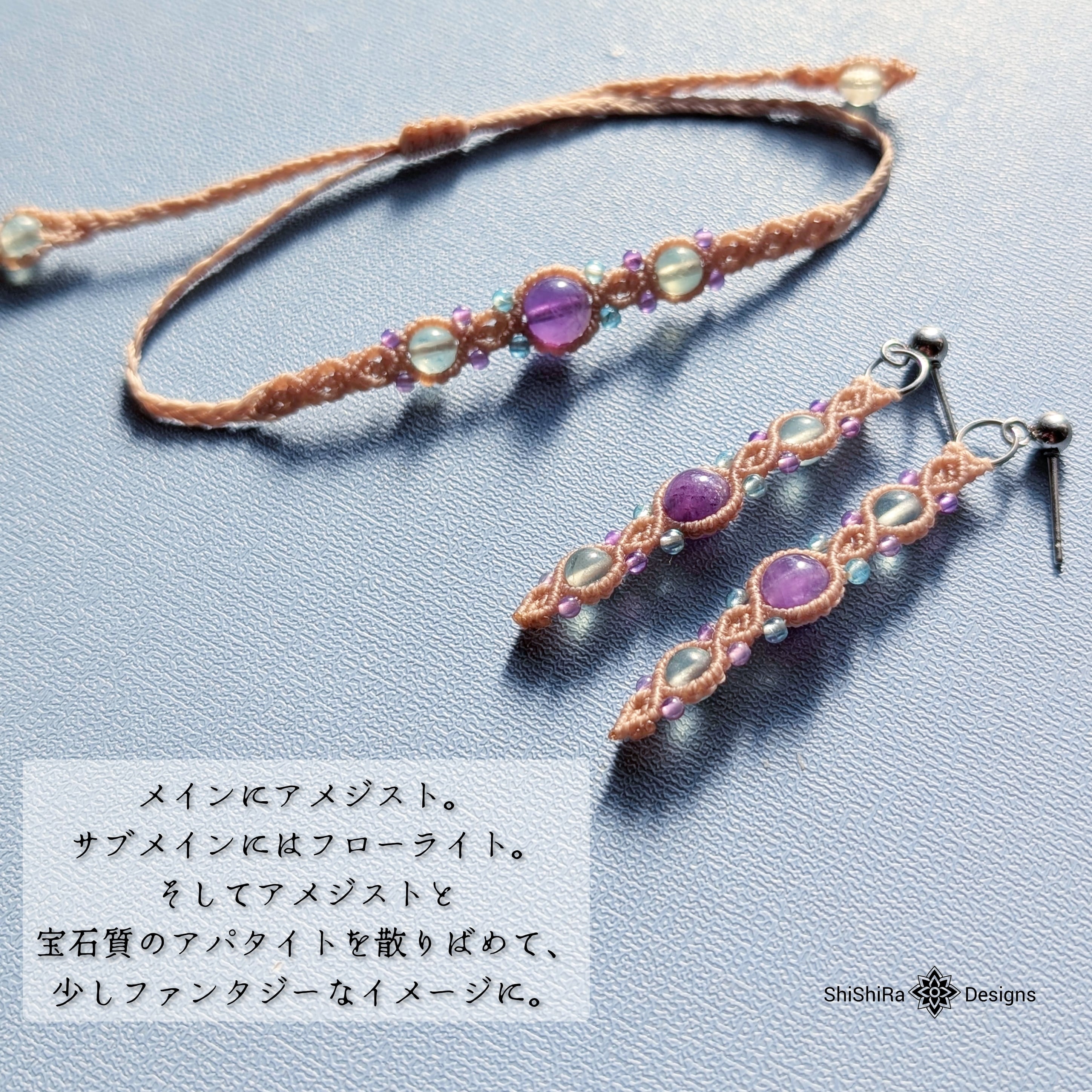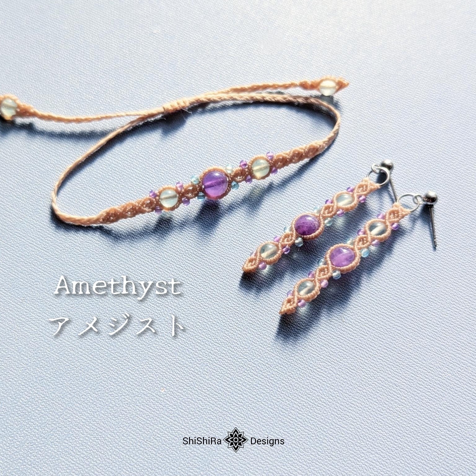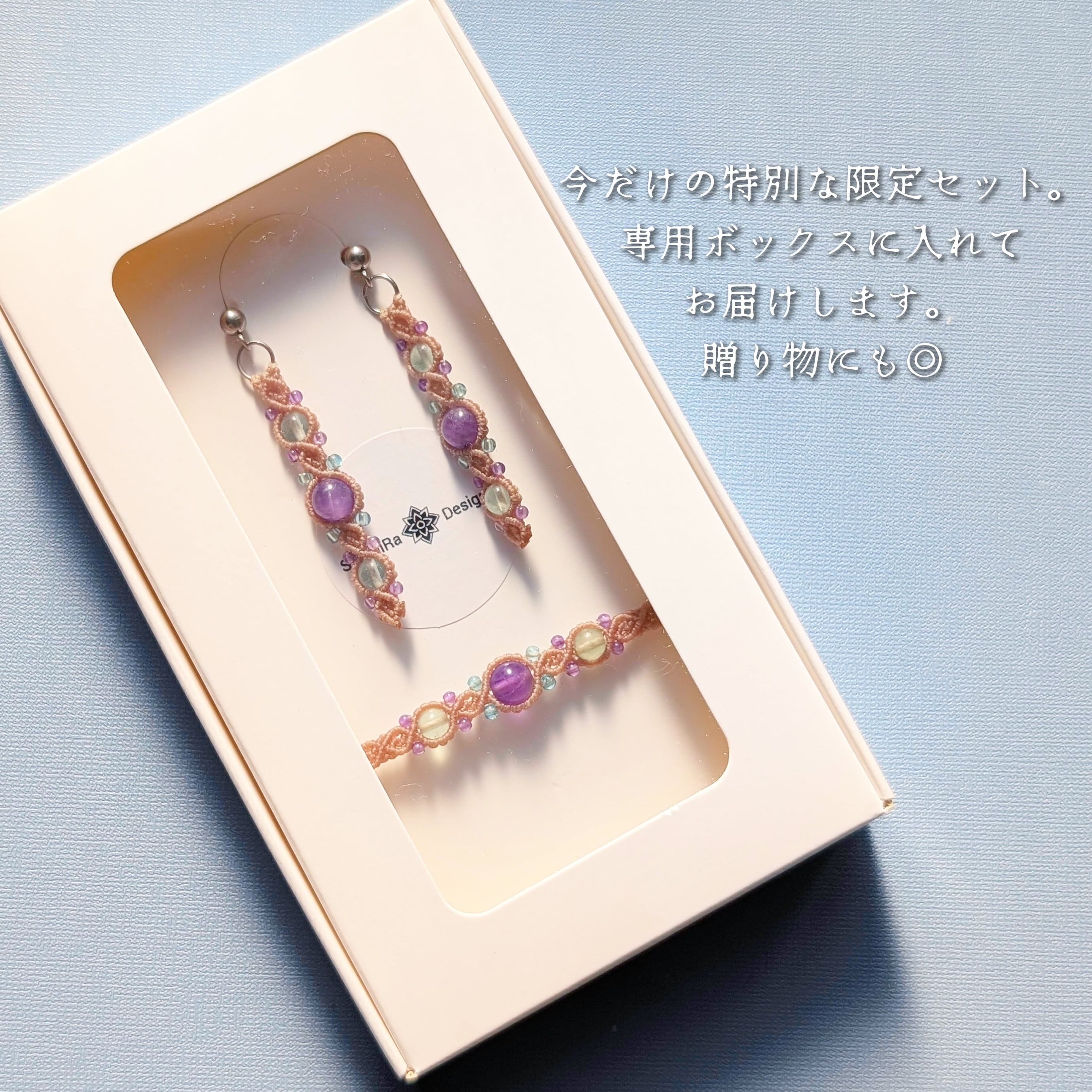 【Holiday Collection】冬限定セット アメジスト使用 小さな小さなブーケのようなマクラメ編みブレスレット&ピアス [金属アレルギー対応]