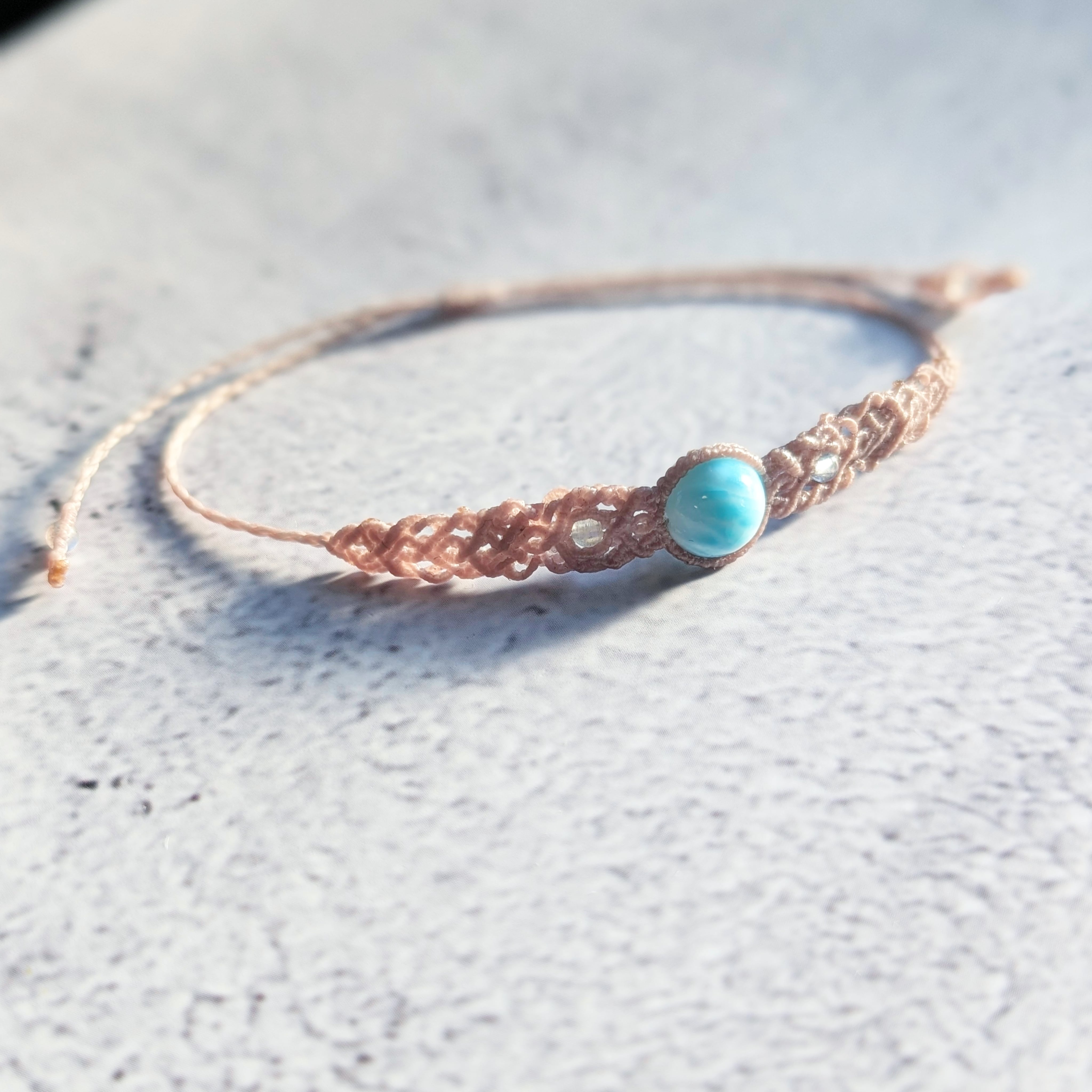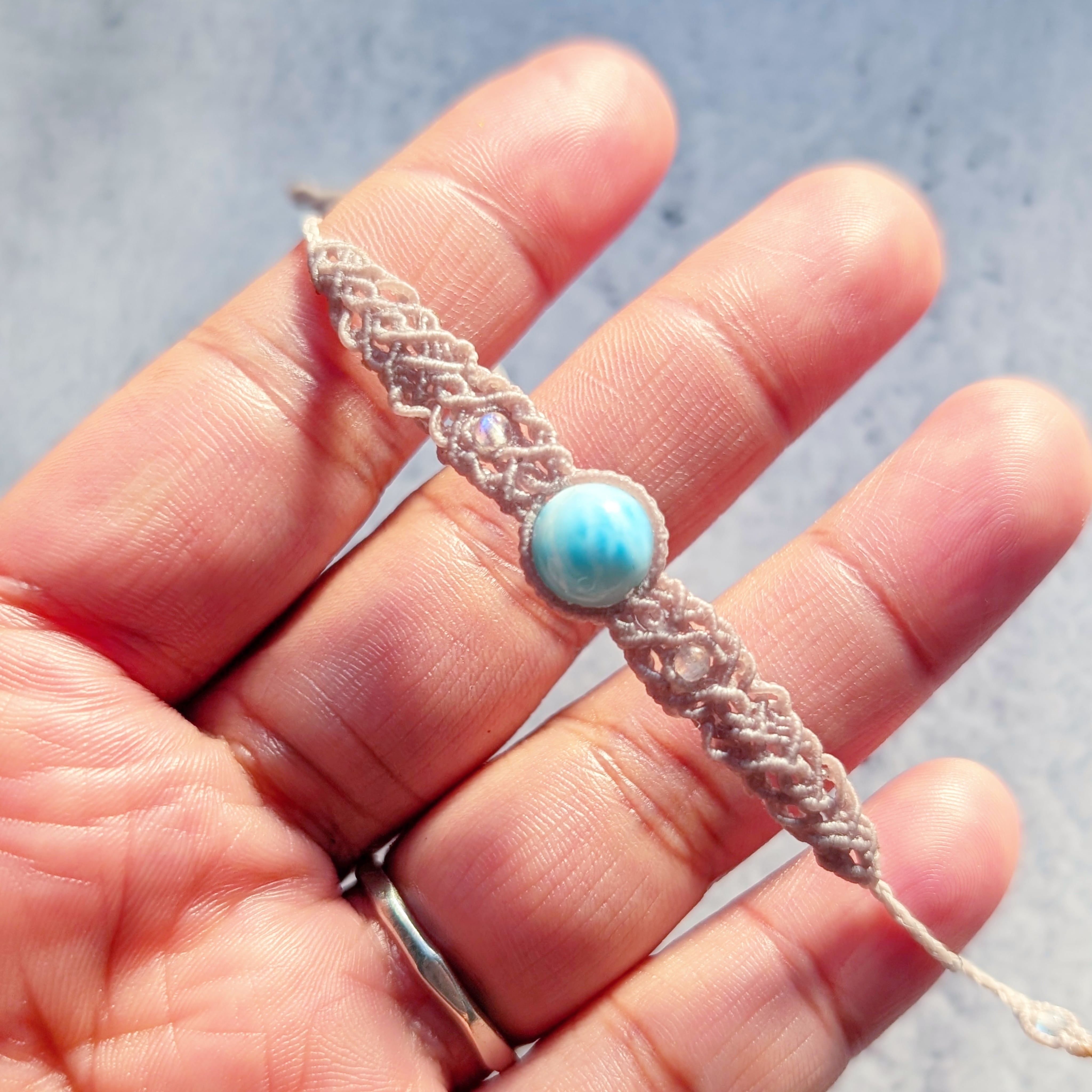 こちらはハイクラスのラリマーを使用したマクラメ編みのブレスレットです。