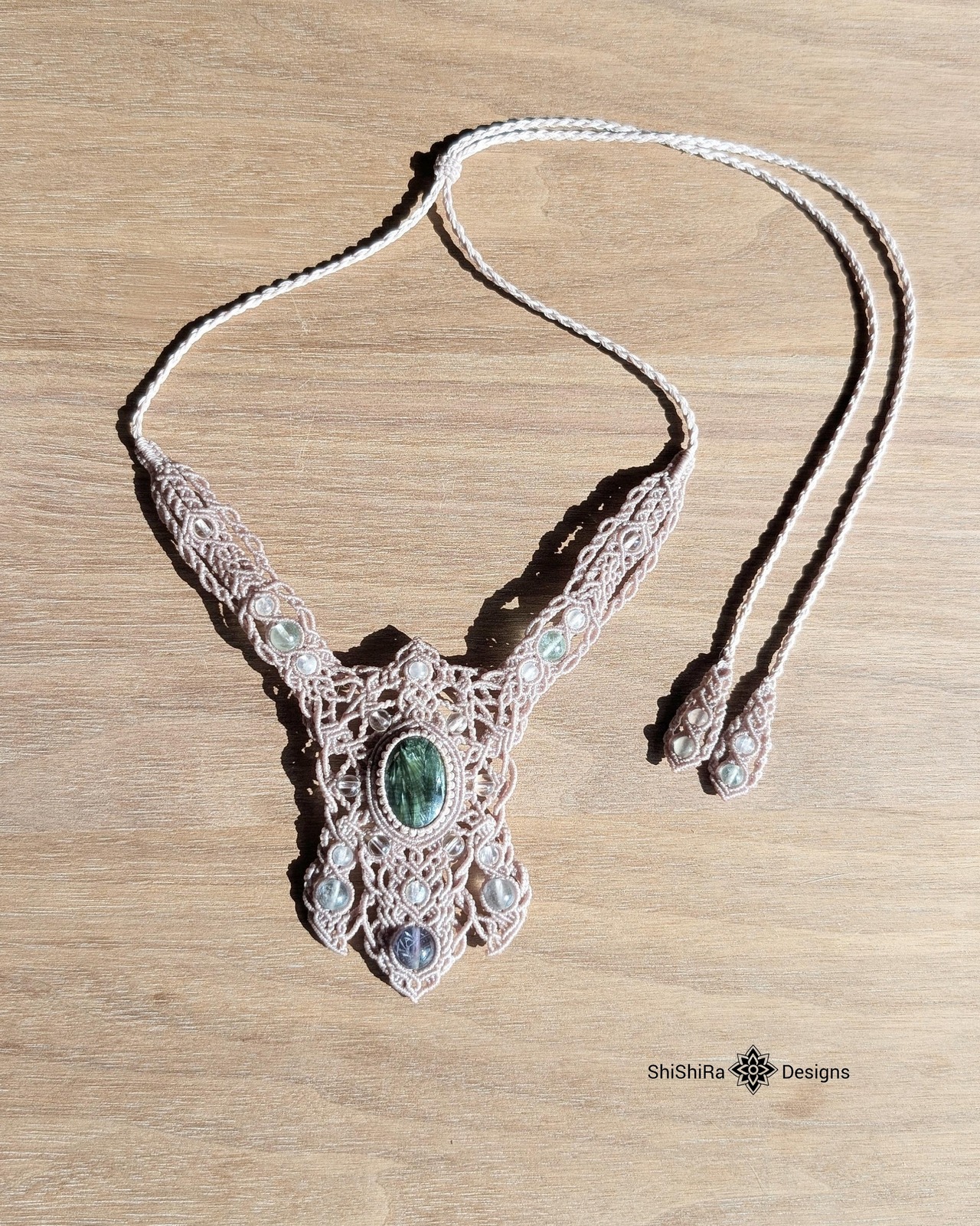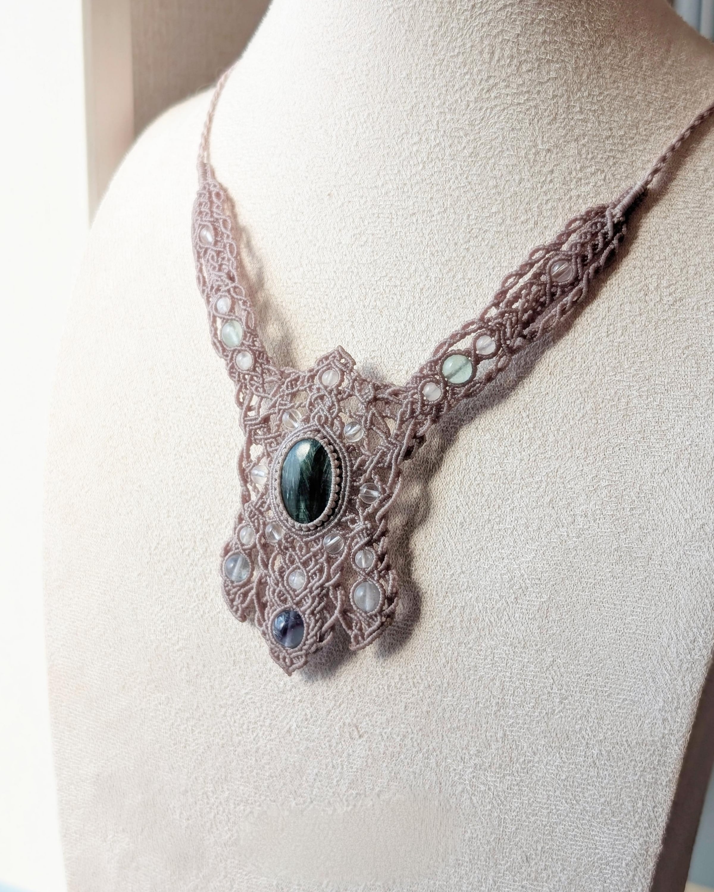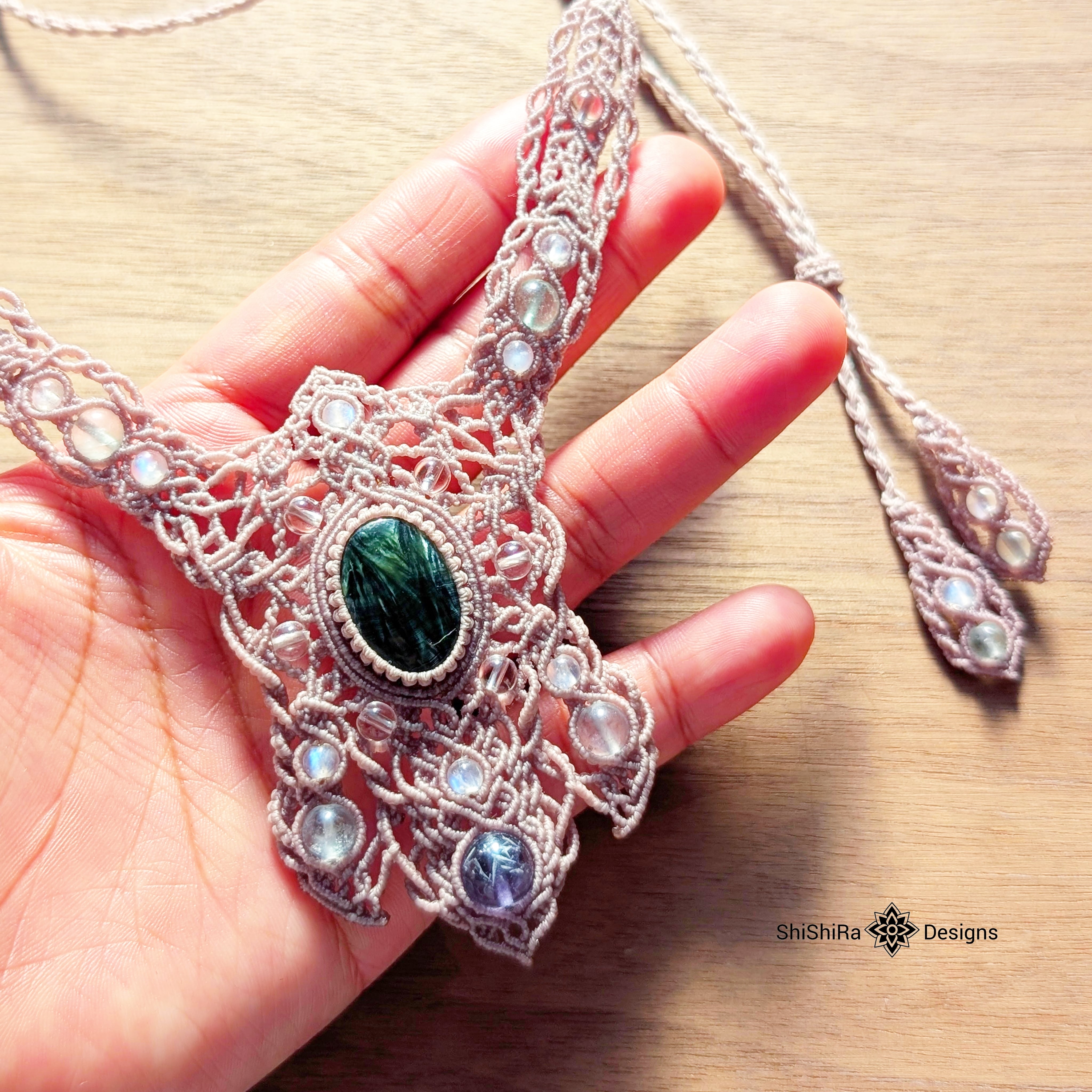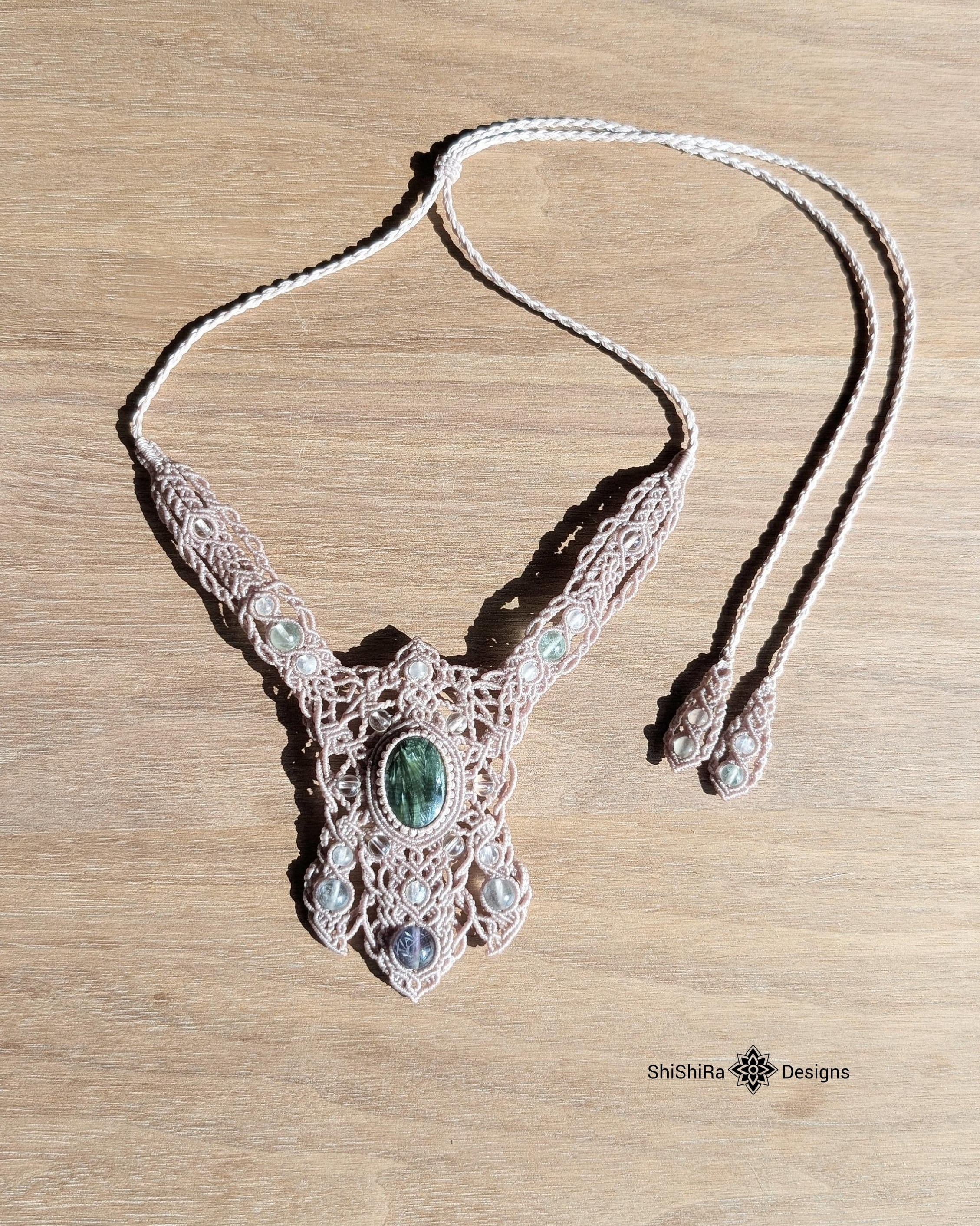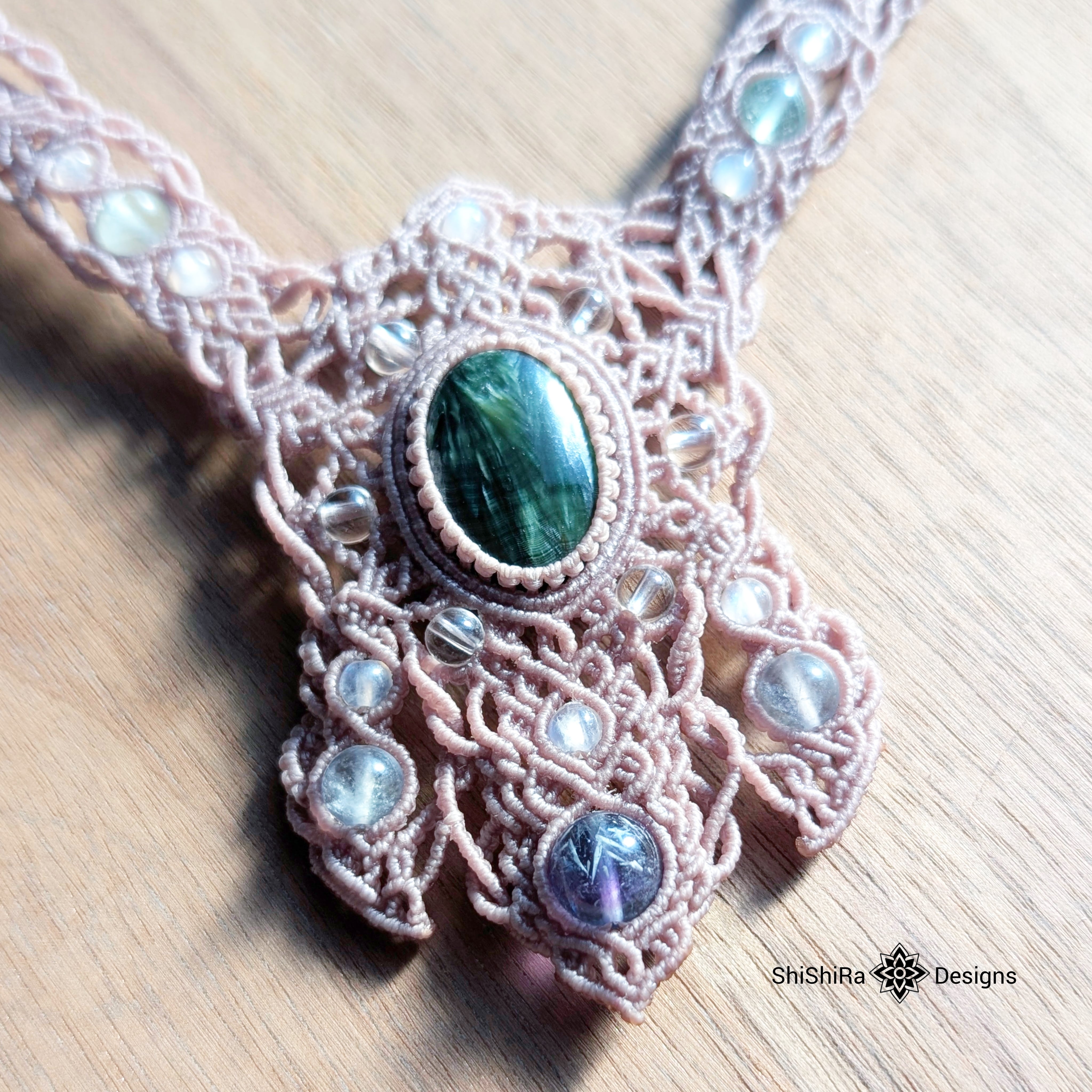 【ShiShiRa’s Premium Collection】セラフィナイトとエンジェルフェザーフローライトのジュエリーマクラメネックレス [金属アレルギー対応] | ShiShiRa Designs