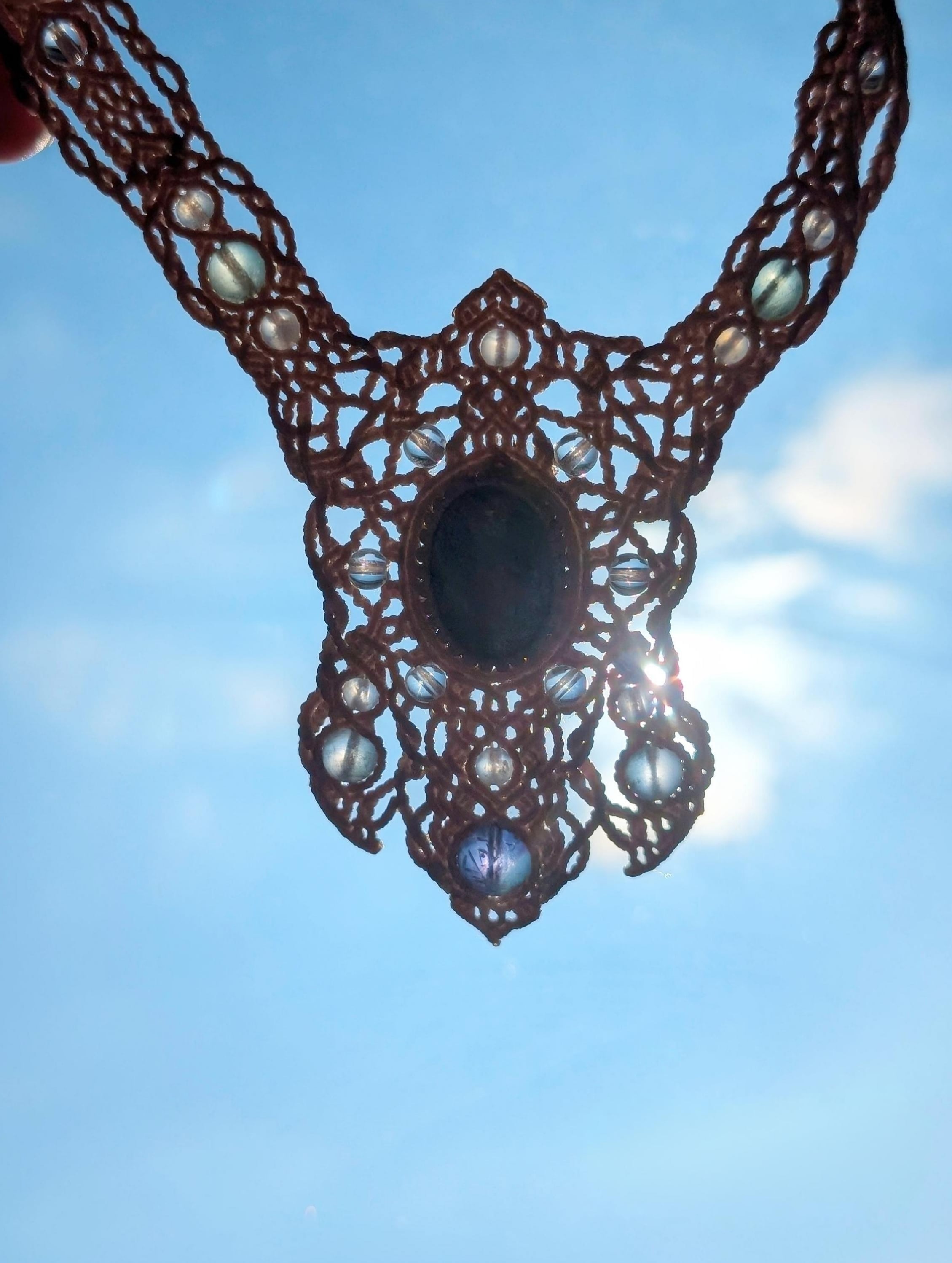 穏やかで強く優しい雰囲気を持つ天然石に、生成り色のワックスコードで細かくとことん編み込みました。