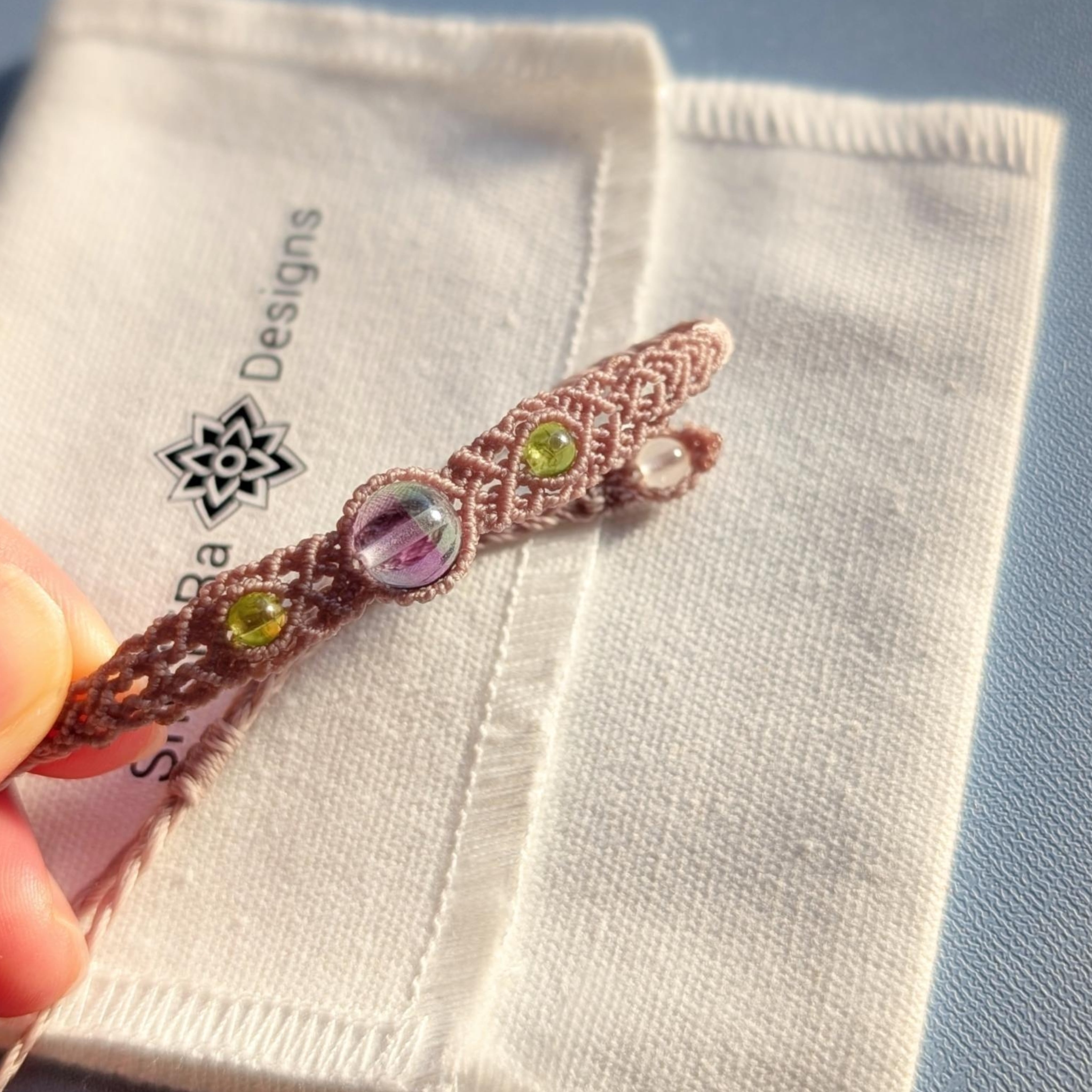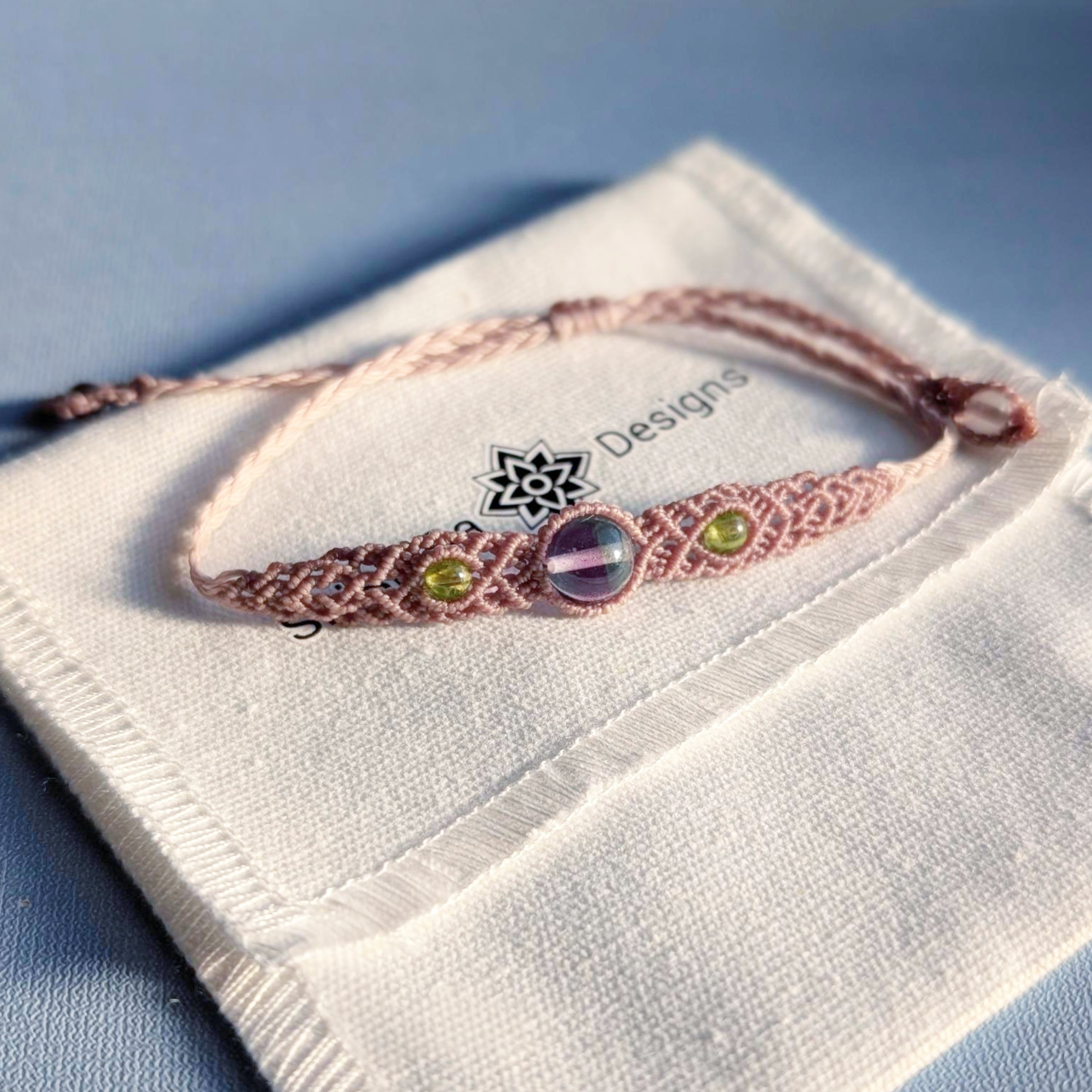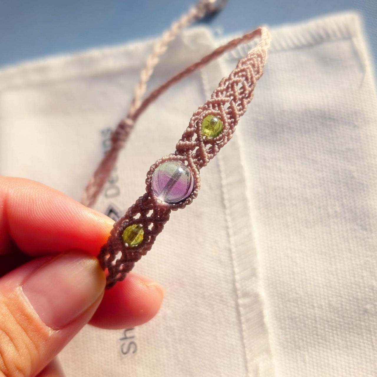 こちらはハイクラスのフローライトとペリドットを使用したマクラメ編みのブレスレットです。