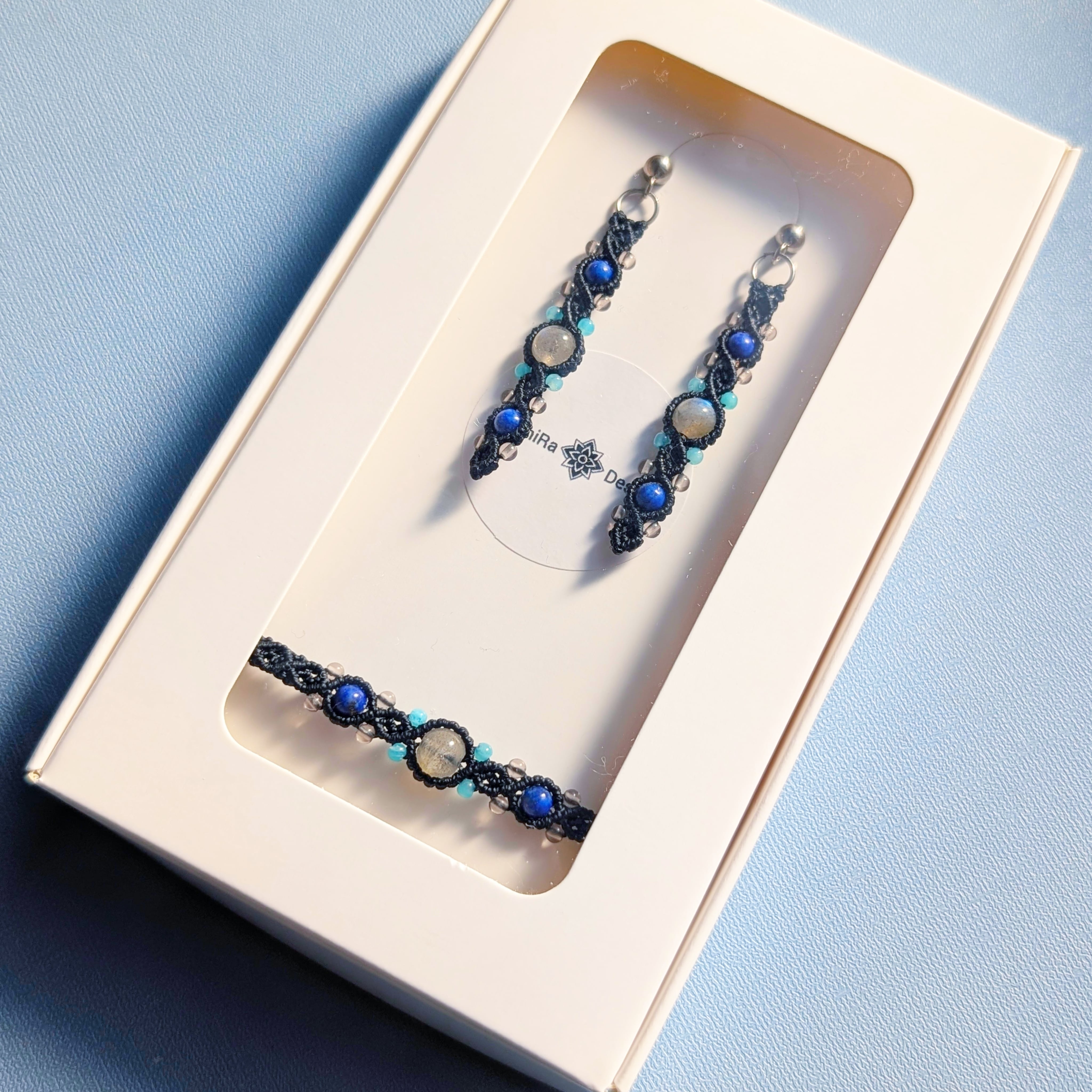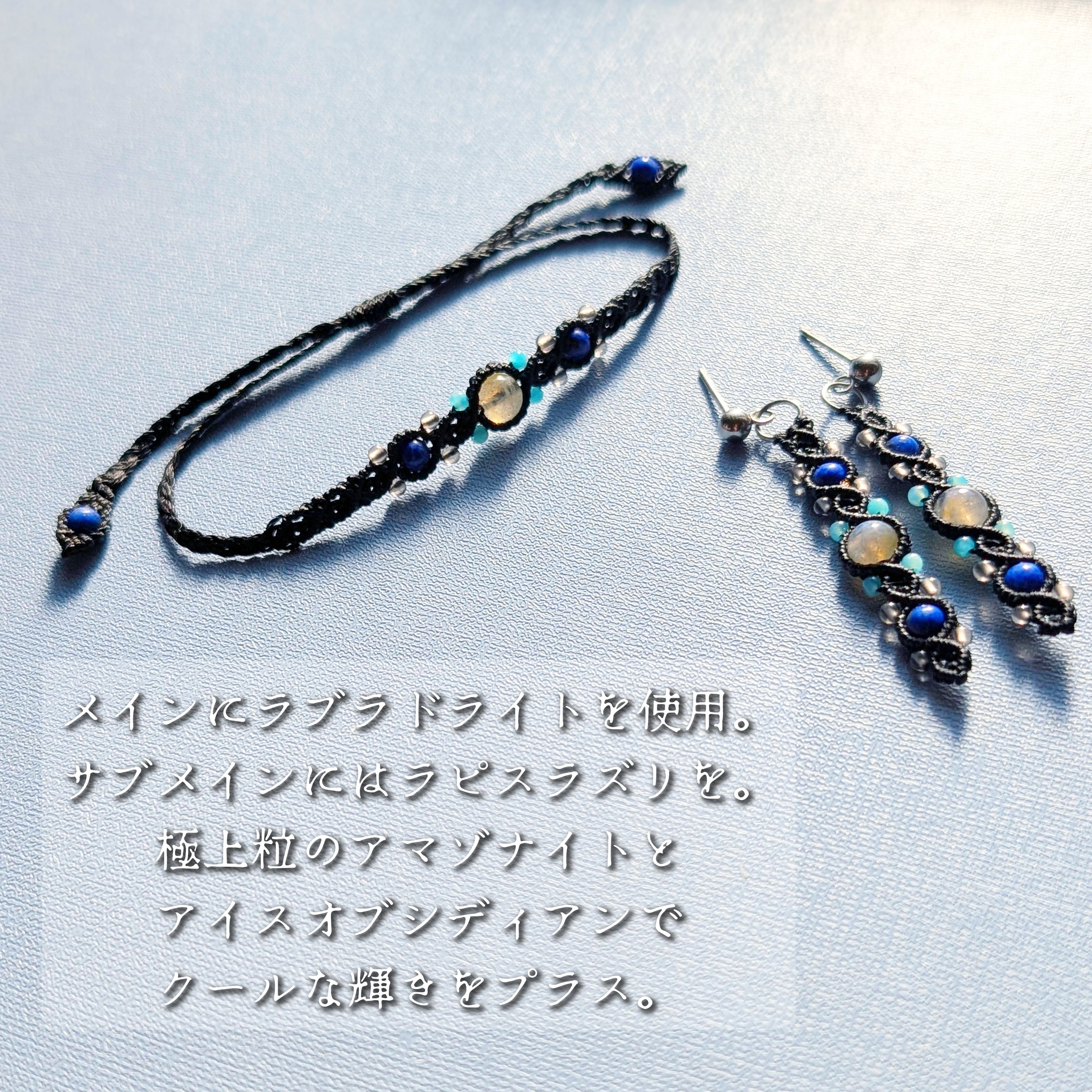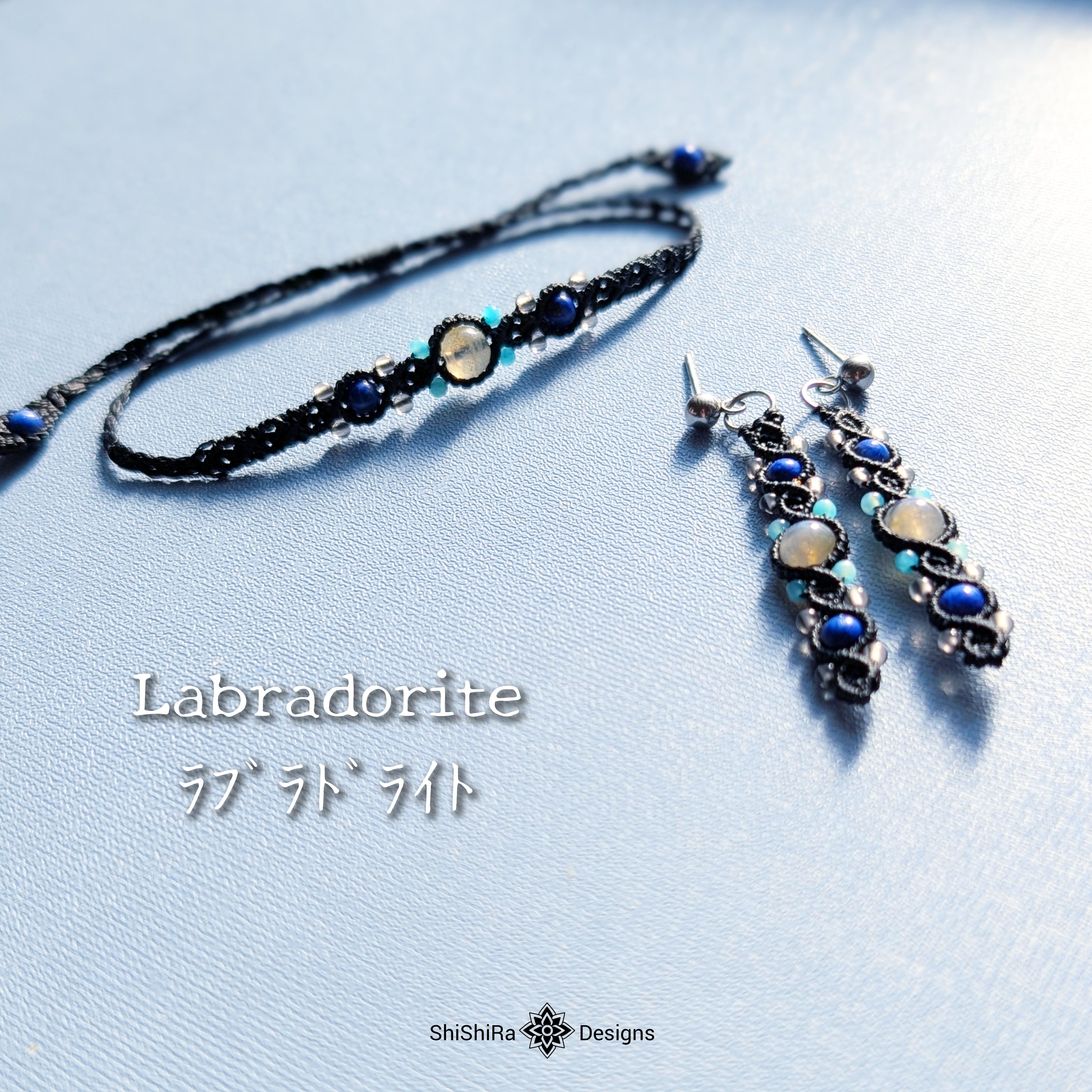 耳元や手元で、さりげなく輝くラブラドライトのマクラメジュエリーはいかがでしょうか。