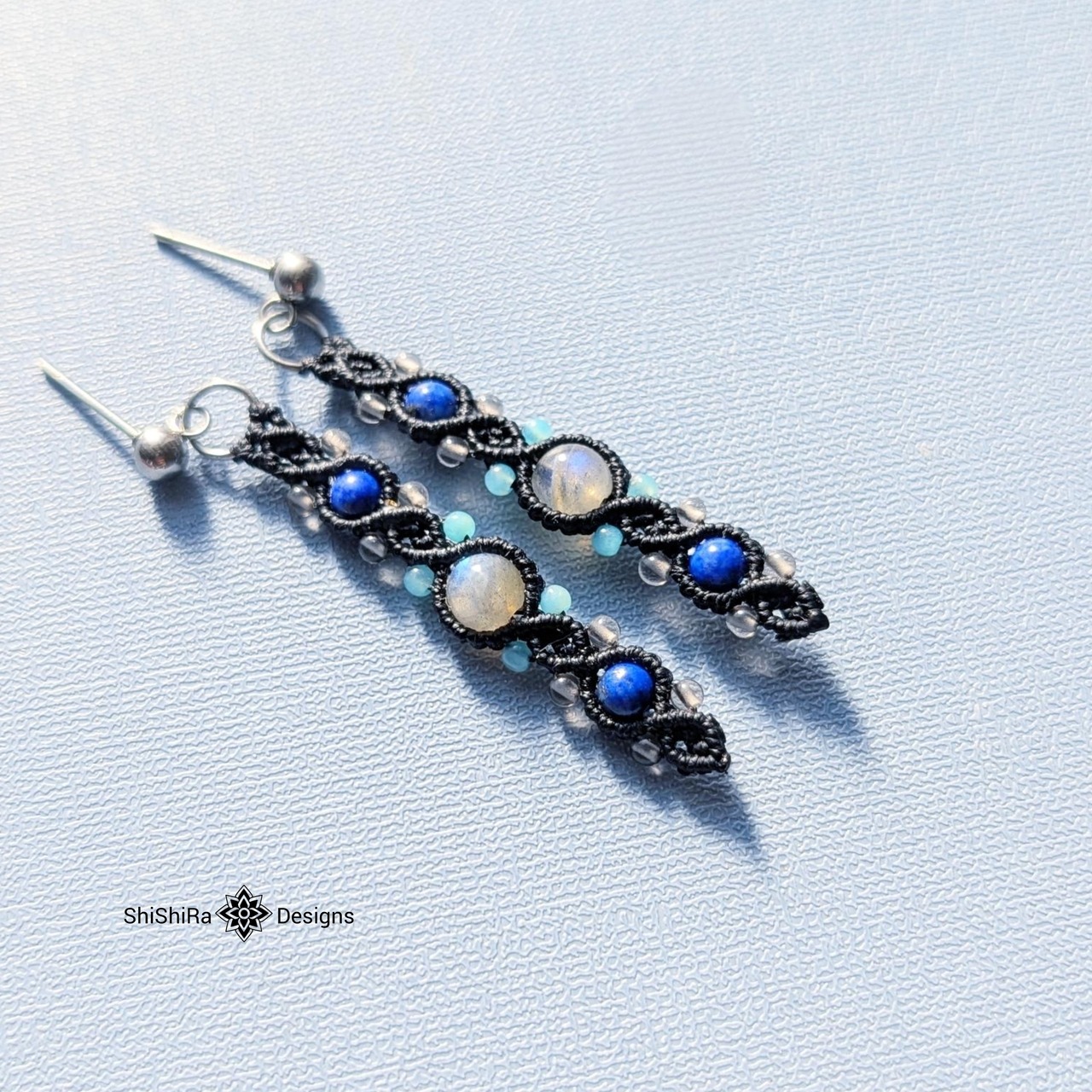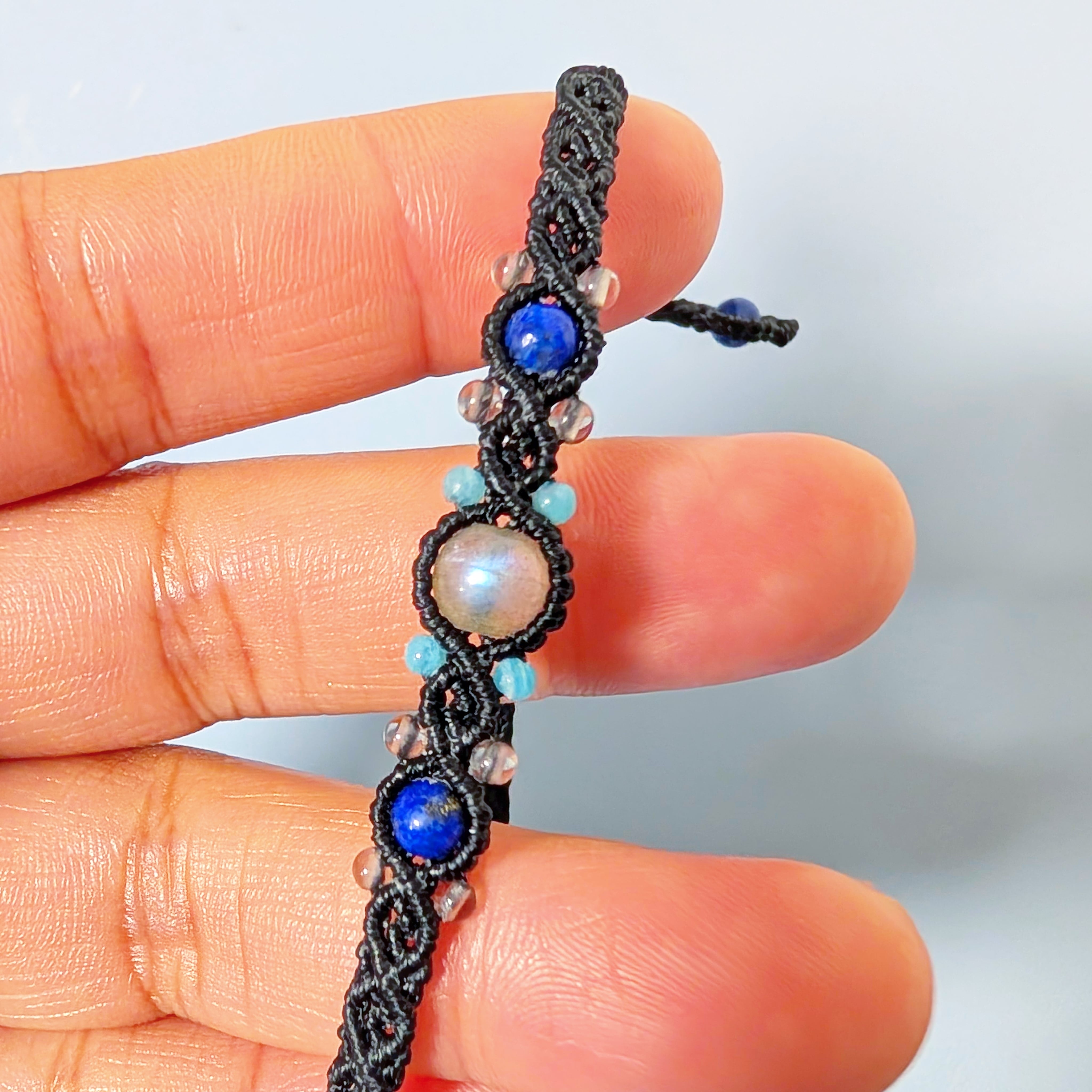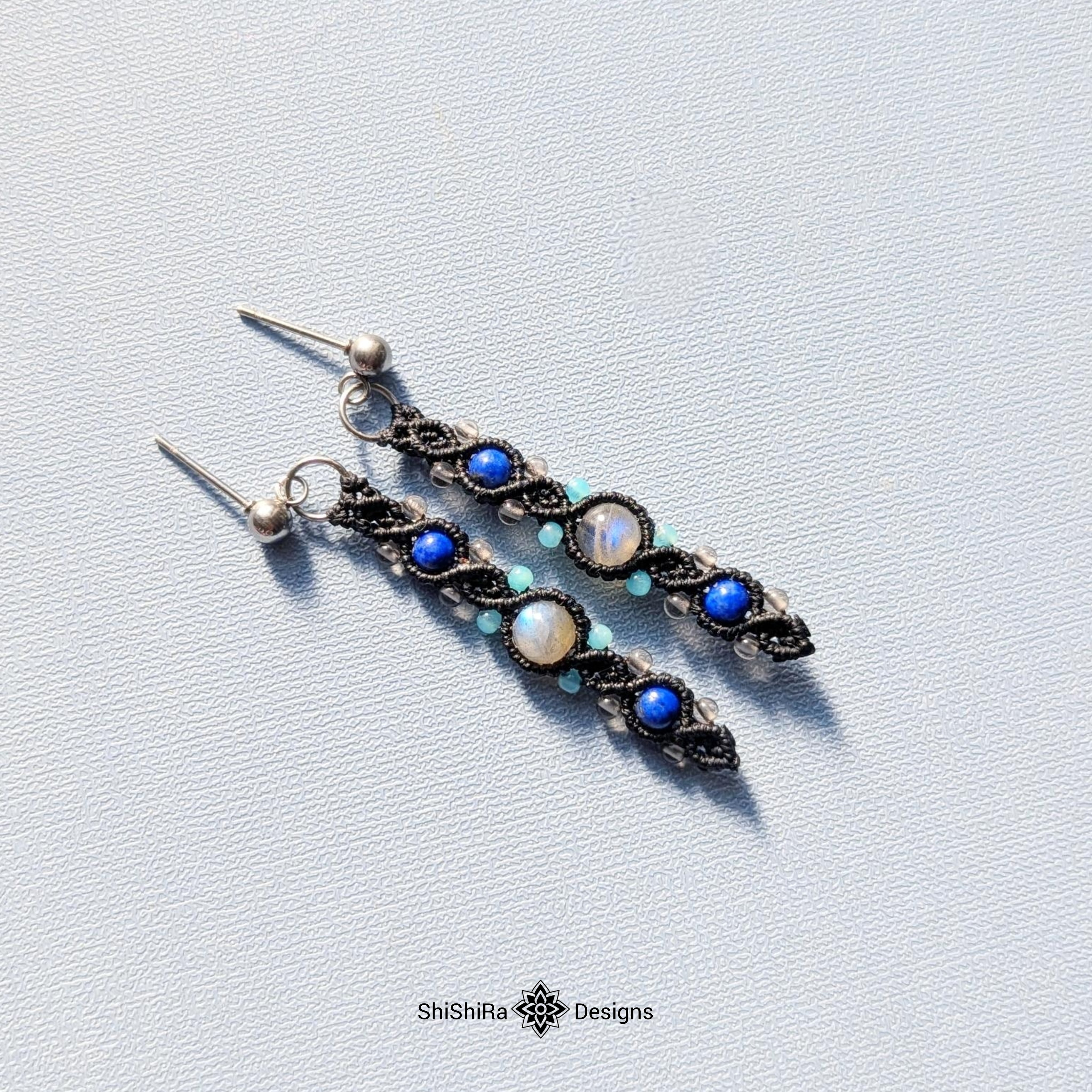 耳元や手元で、さりげなく輝くラブラドライトのマクラメジュエリーはいかがでしょうか。